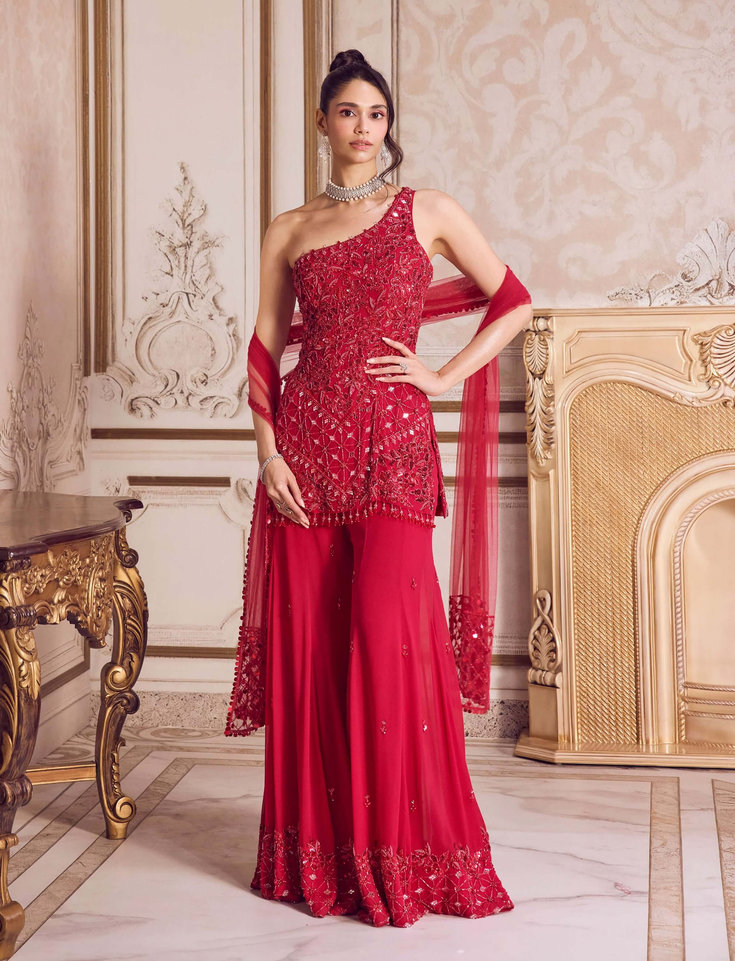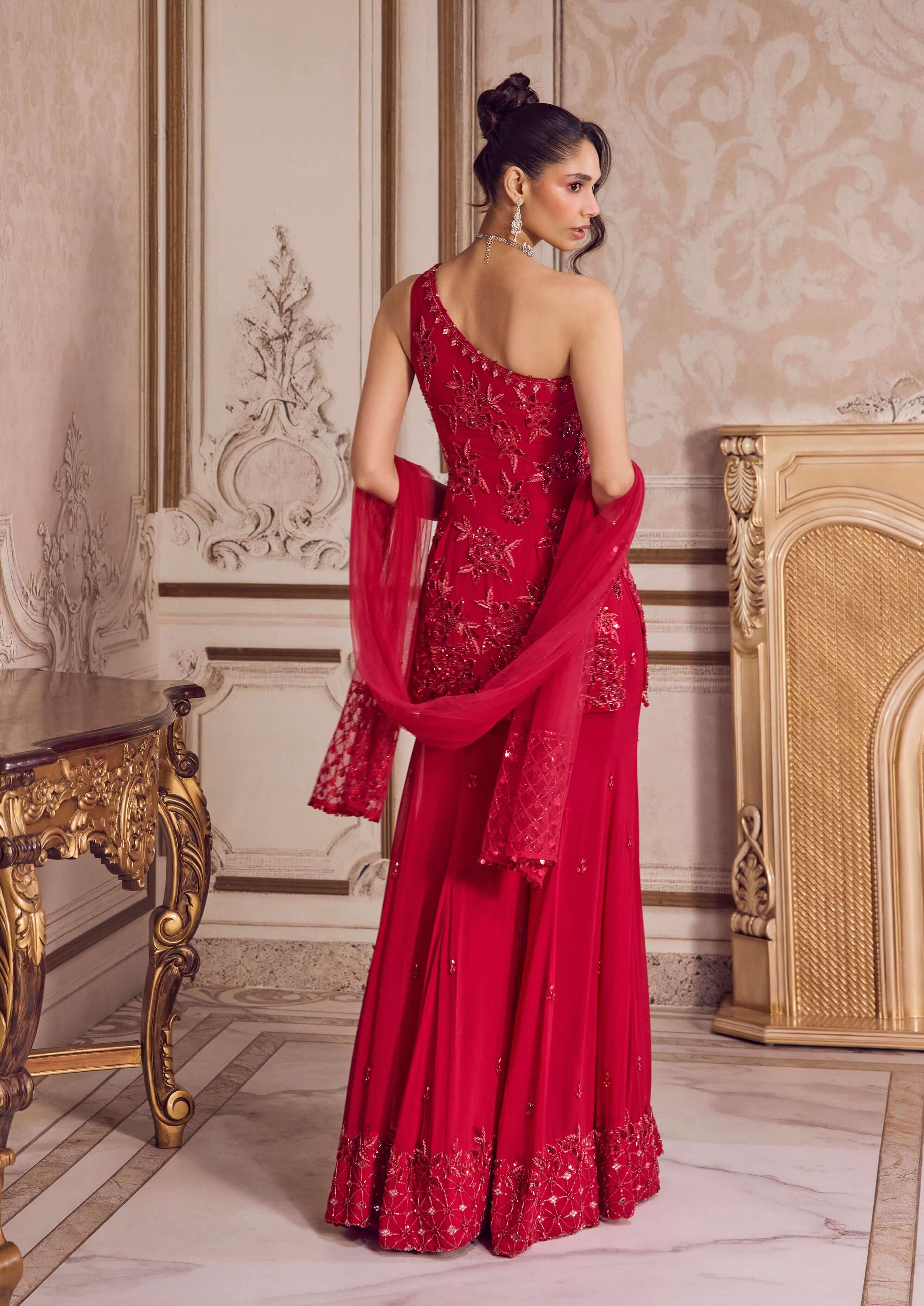 A sculptural play of form and detail, this magenta one-shoulder georgette kurta set embodies modern grace. Embroidered in tonal floral and geometric motifs with beads, stones, and sequins, it’s finished with handcrafted tassels and beadwork along the neckline. The kalidar pants and soft net dupatta complete a look that balances structure with fluidity.