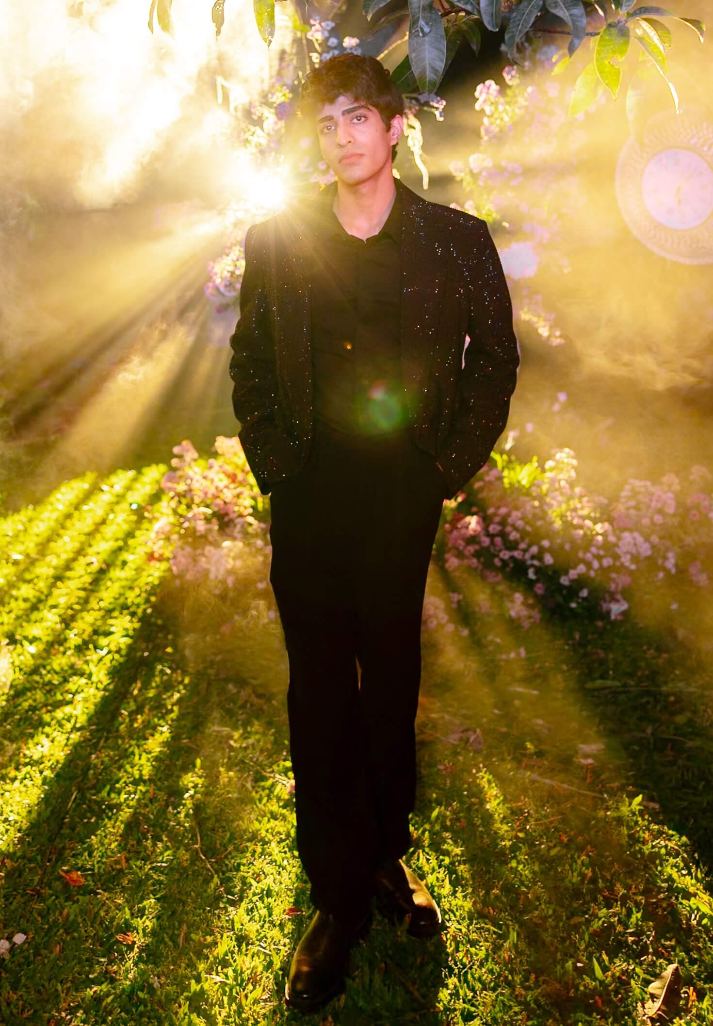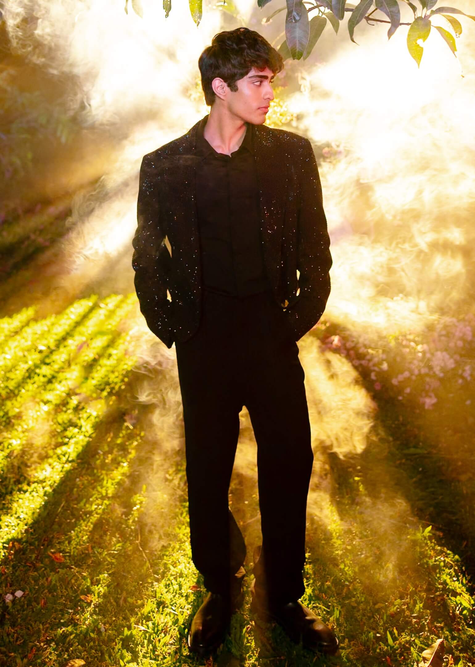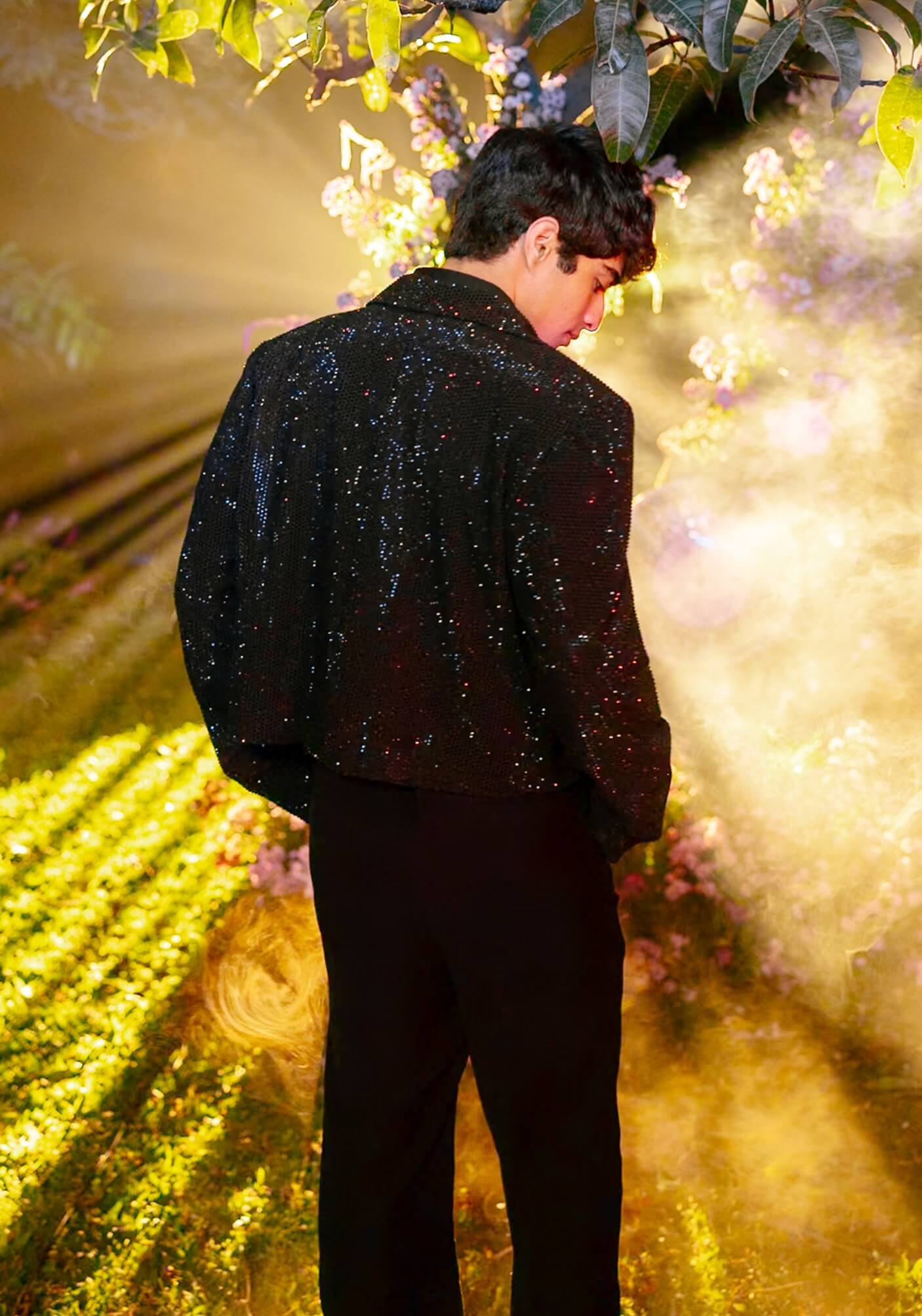 Sleek and contemporary, this black jacket set delivers refined evening sophistication. The tailored melon crepe jacket is layered over a luxurious silk shirt and paired with structured crepe trousers. The clean lines create a sharp and polished silhouette. Ideal for cocktail parties, evening events, and formal gatherings.
