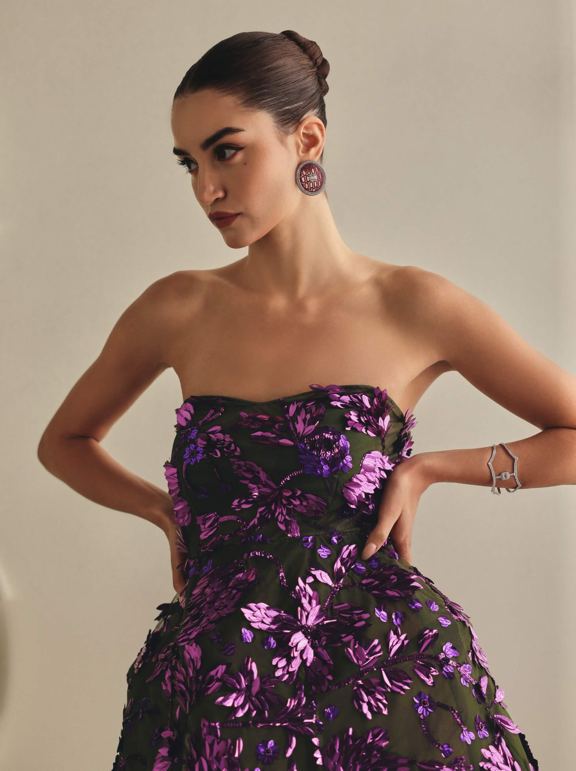 Bold yet refined, this olive net mini dress features purple patti embroidery and layered florals that create dynamic depth. Youthful, sculpted, and radiant — a couture piece for standout soirées.