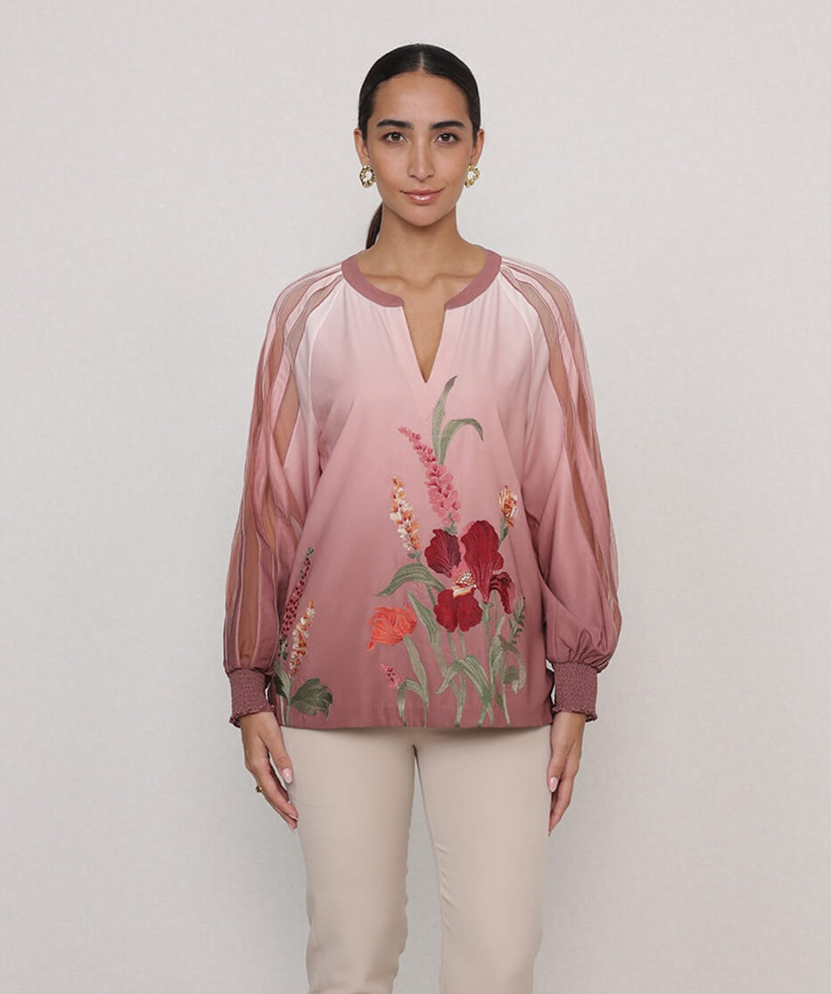 A painterly mix of deep orchids, tulips, and wild blooms come alive on a soft blush canvas, olivi blouse is where art meets wearability. The sheer ombré sleeves add dimension, while the fluid silhouette gives it a relaxed, feminine frame. Designed with a subtle keyhole neckline and airy fit, it’s that piece you reach for when jeans feel too casual but dresses feel too much. Perfect for rooftop brunches, quiet evening cocktails, or when you just want your outfit to speak first.