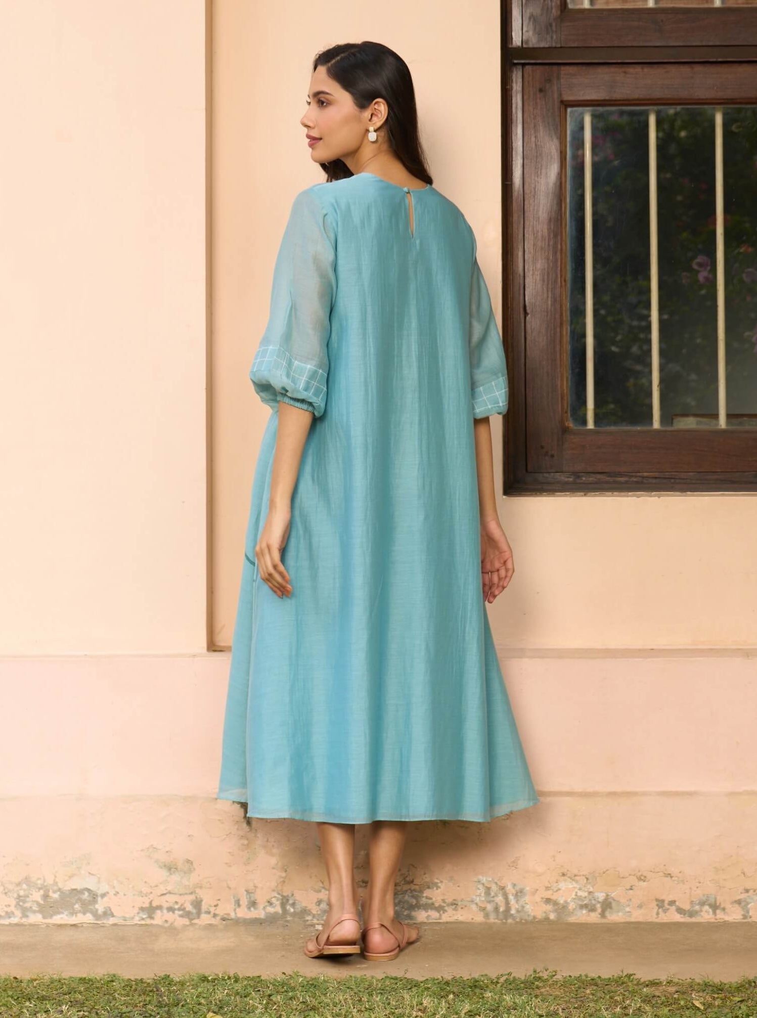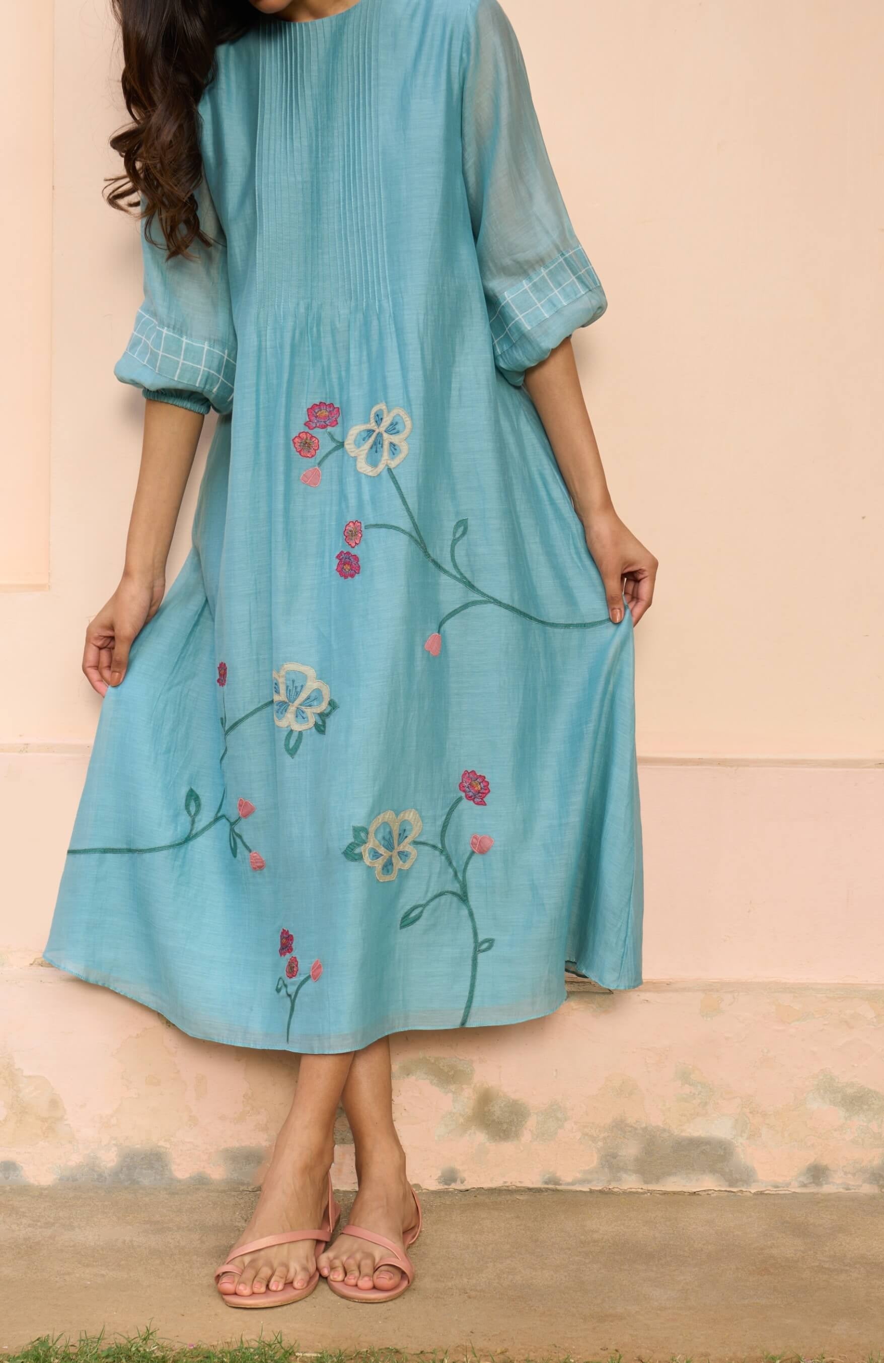 Crafted with delicate pintuck detailing and appliqué blooms, this powder blue appliqué dress features voluminous sleeves with checkered cuffs.