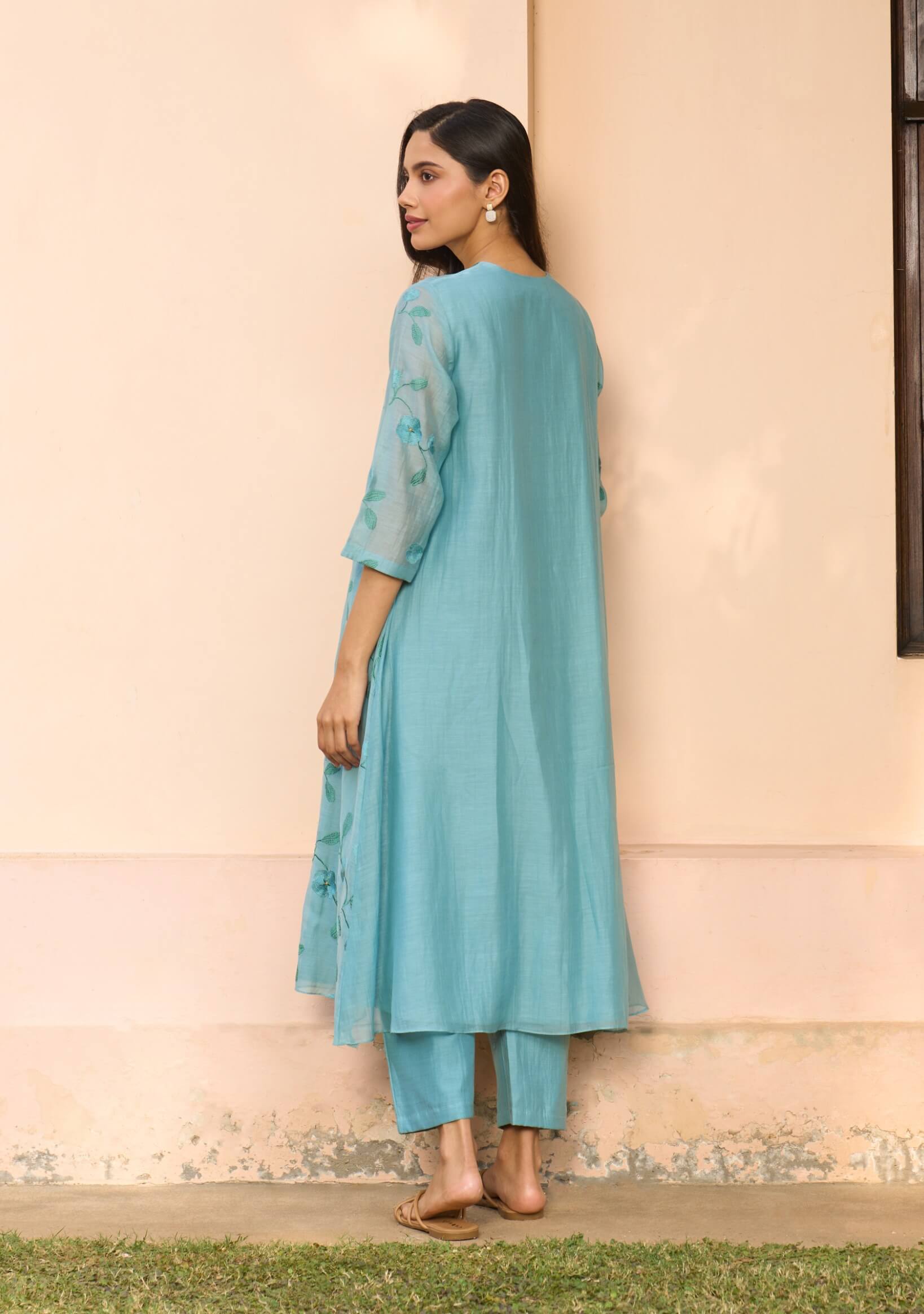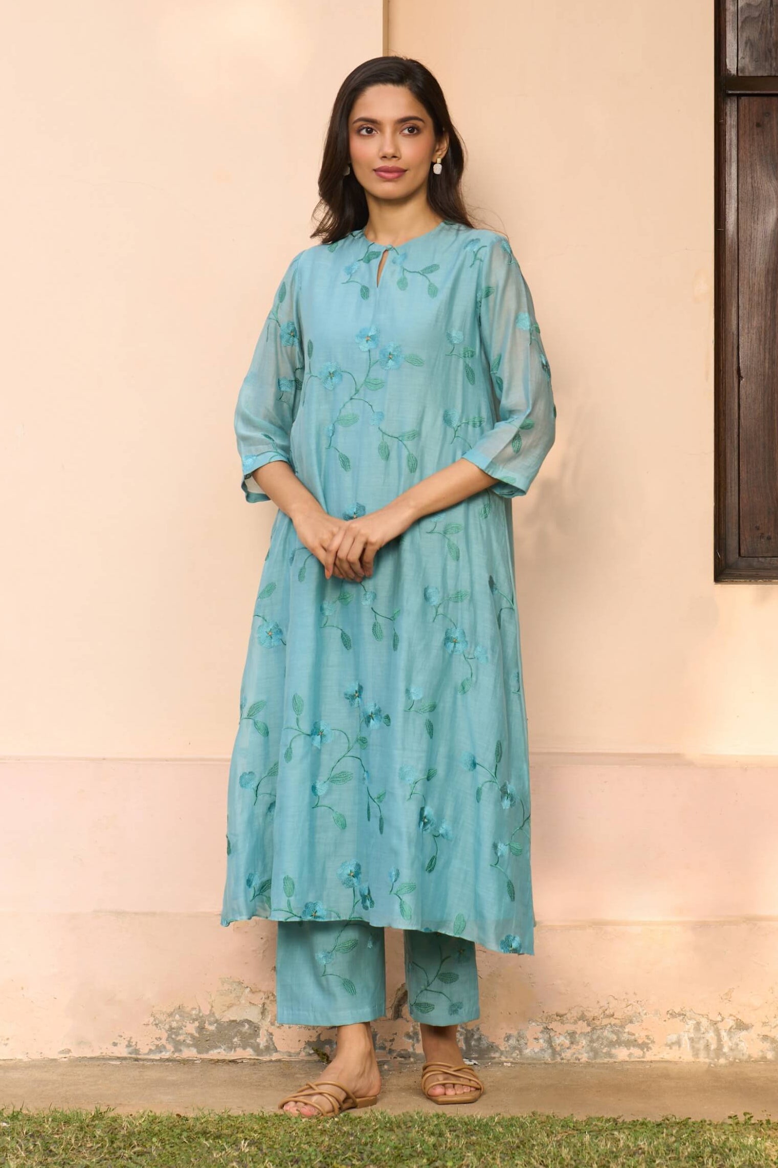 Rendered in a soft powder blue hue, this embroidered co-ord set features scattered floral detailing on the kurta and sleeves with coordinating embroidered pants.