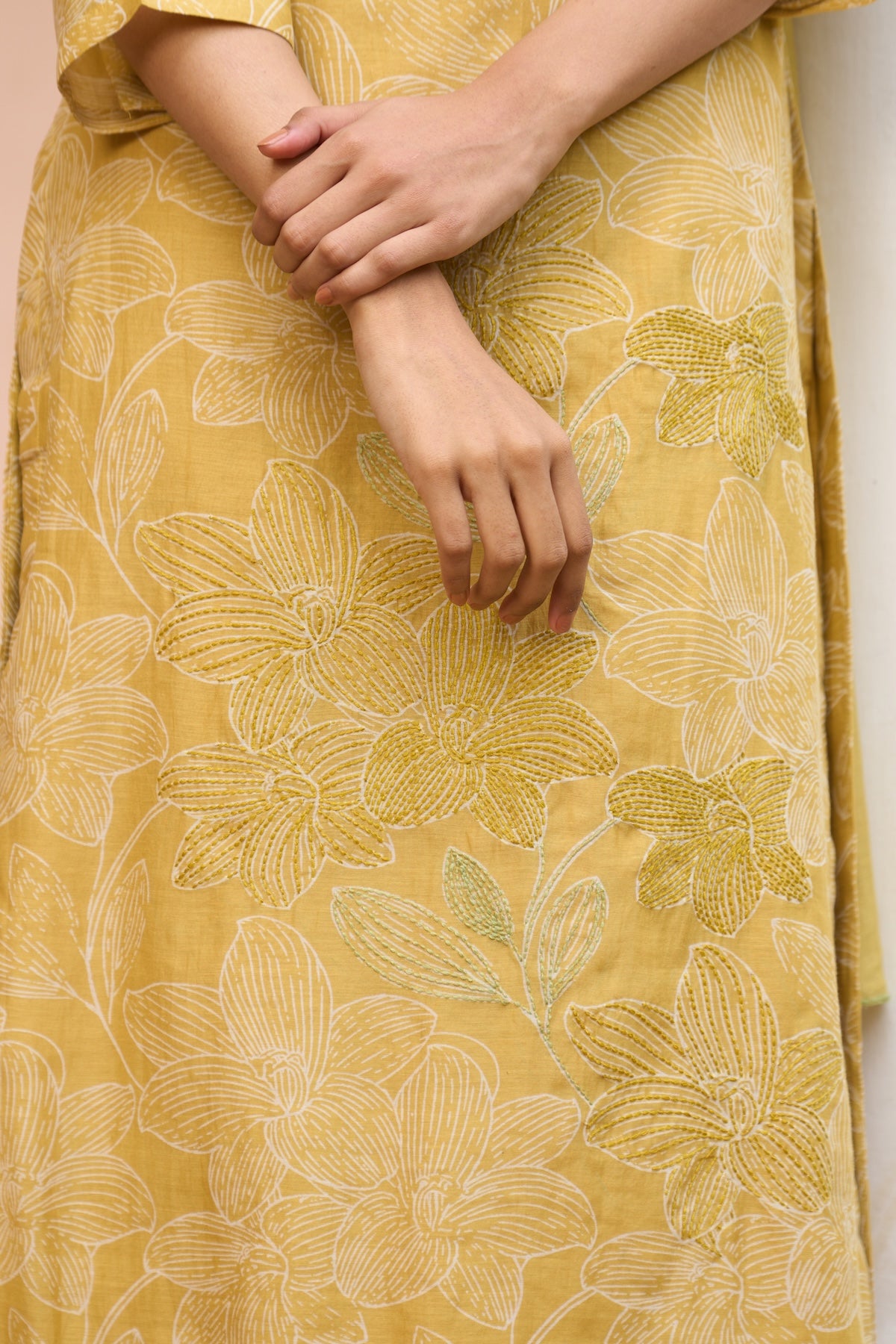 The rue floral kurta set in yellow features printed floral motifs with contrasting thread embroidery on a relaxed silhouette. Paired with coordinating pants and a tasselled dupatta, this effortless three-piece set is ideal for festive moments and elevated daytime wear.