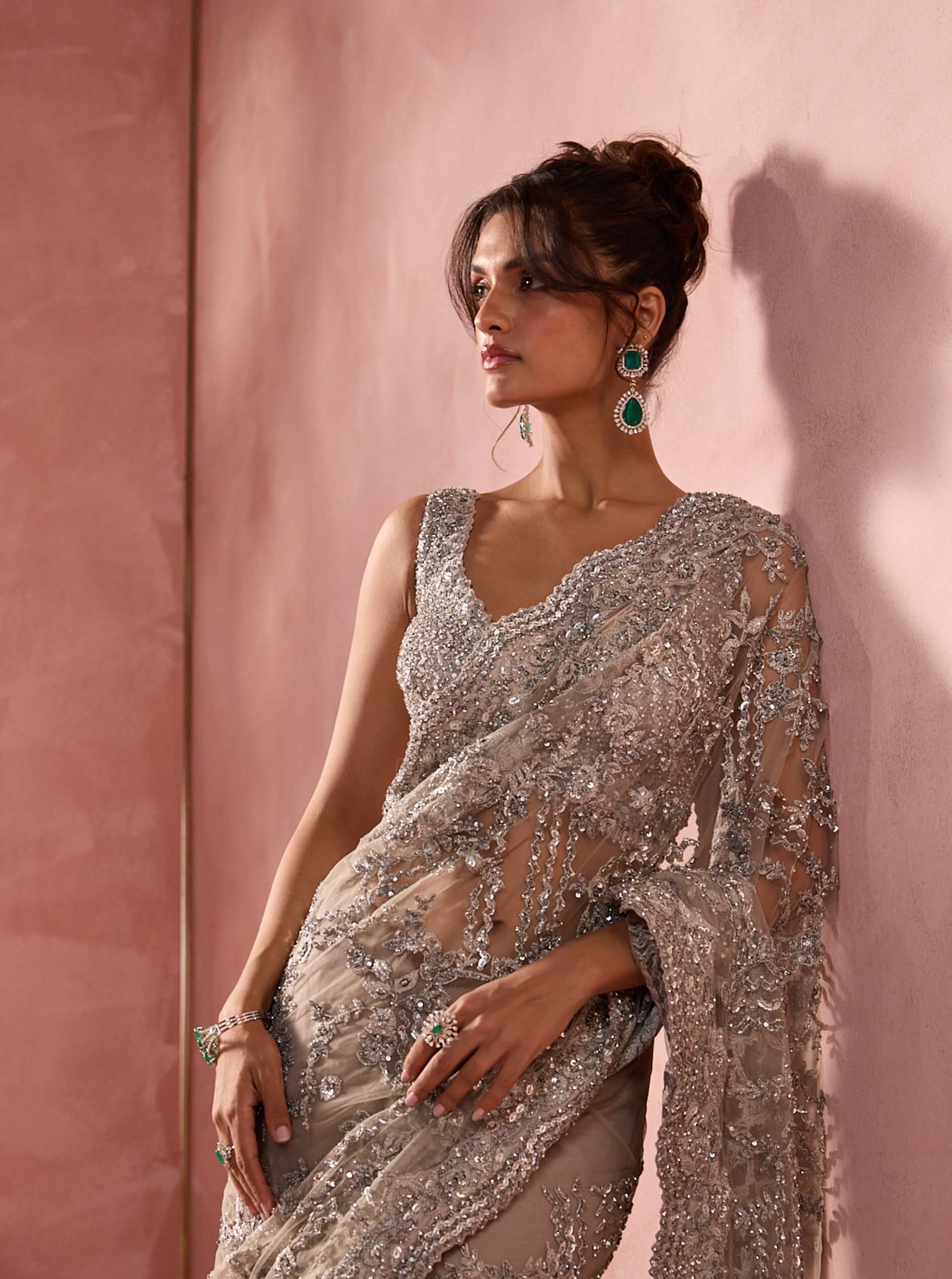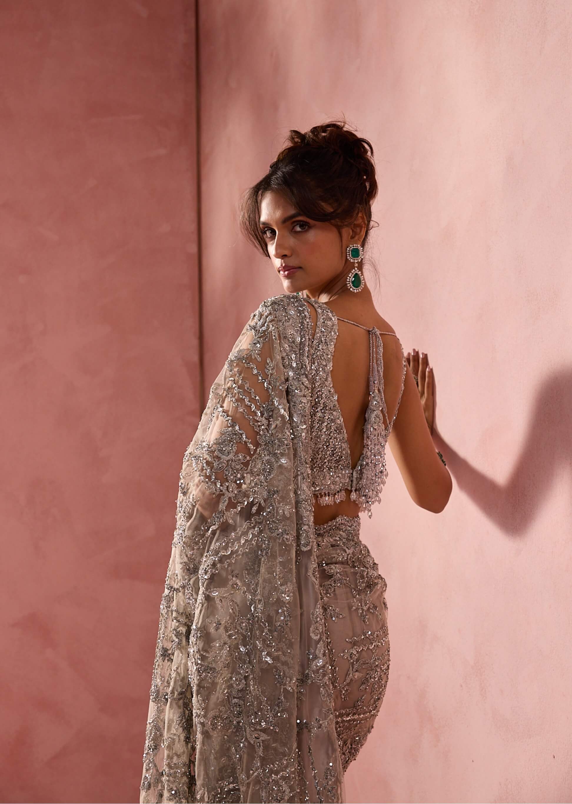 A soft silver-gray glimmer defines this net sari, embellished with tonal dori, beads, sequins and crystals for a subtle yet polished sheen. Contemporary and effortlessly elegant, it’s perfect for cocktail nights, receptions and modern festive gatherings.