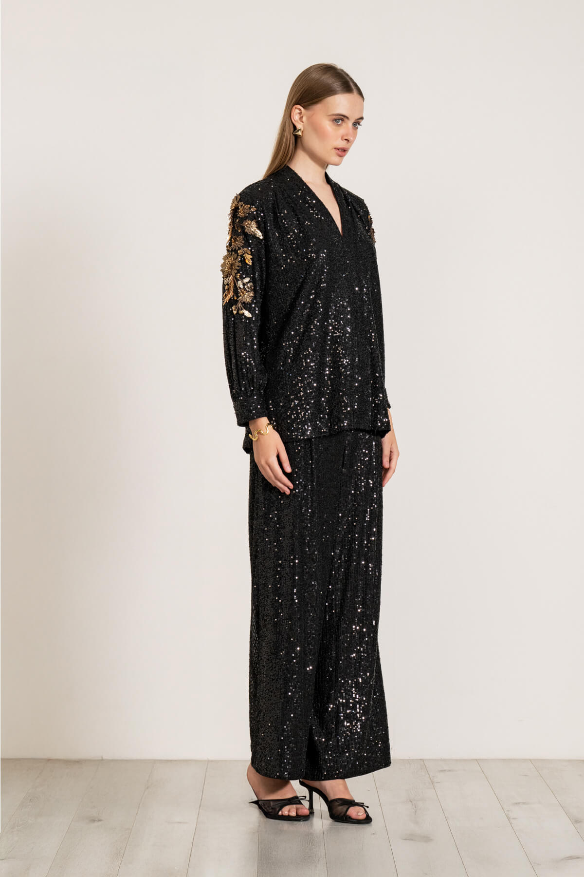 Glamour meets grounded style in the velden sequin pants, crafted in black sequin fabric with a straight-leg silhouette. The all-over sequin embroidery provides shine and texture without overwhelming the frame. Perfect for cocktail evenings, festive celebrations, or night-time social events, these pants elevate simple styling into bold, confident dressing.