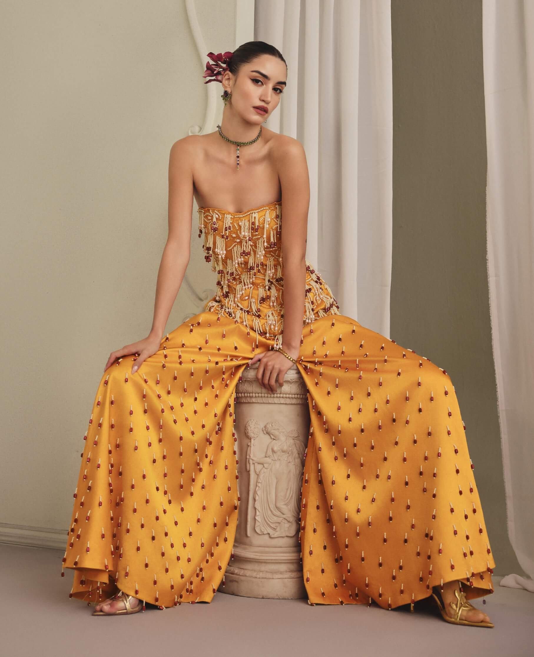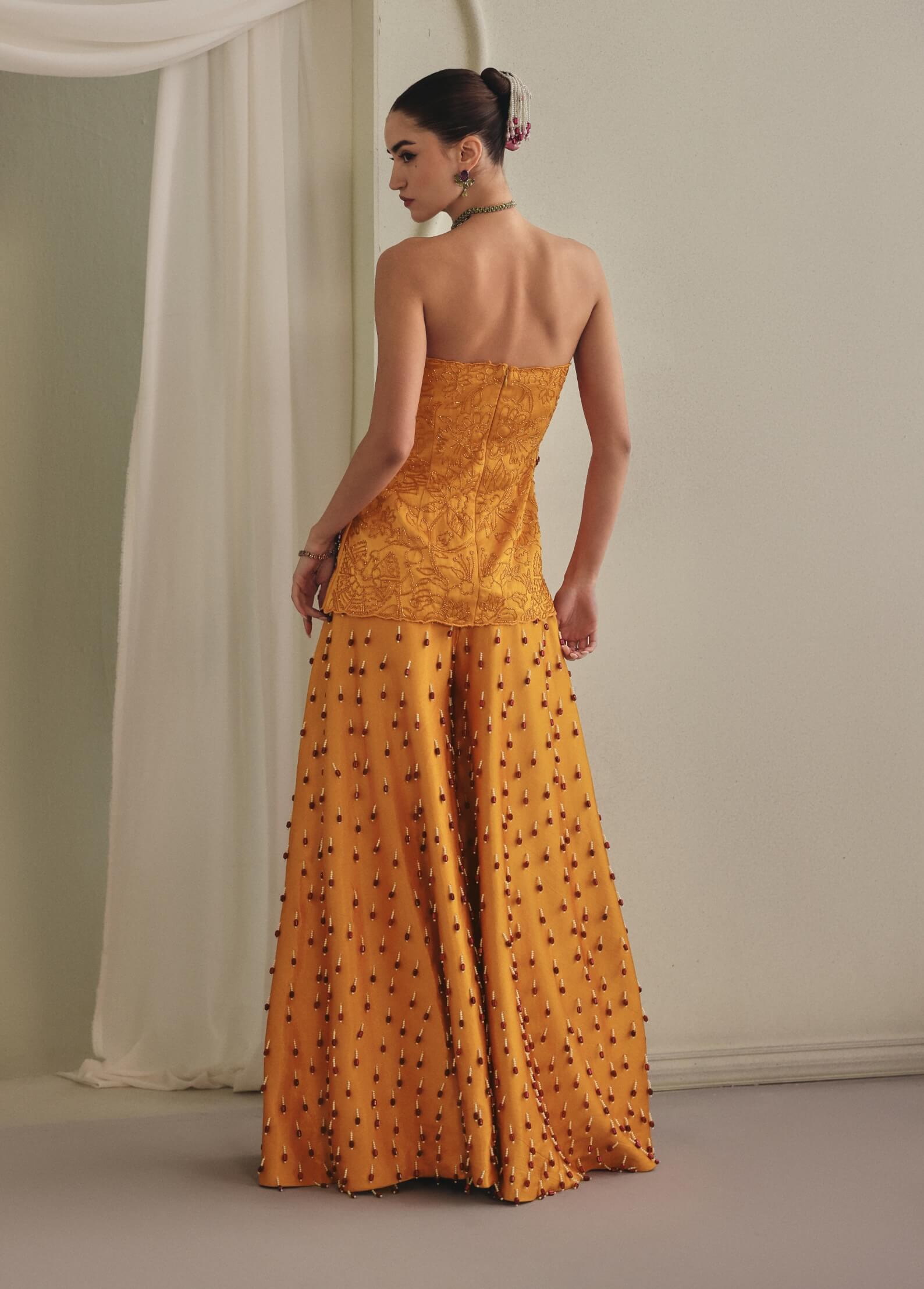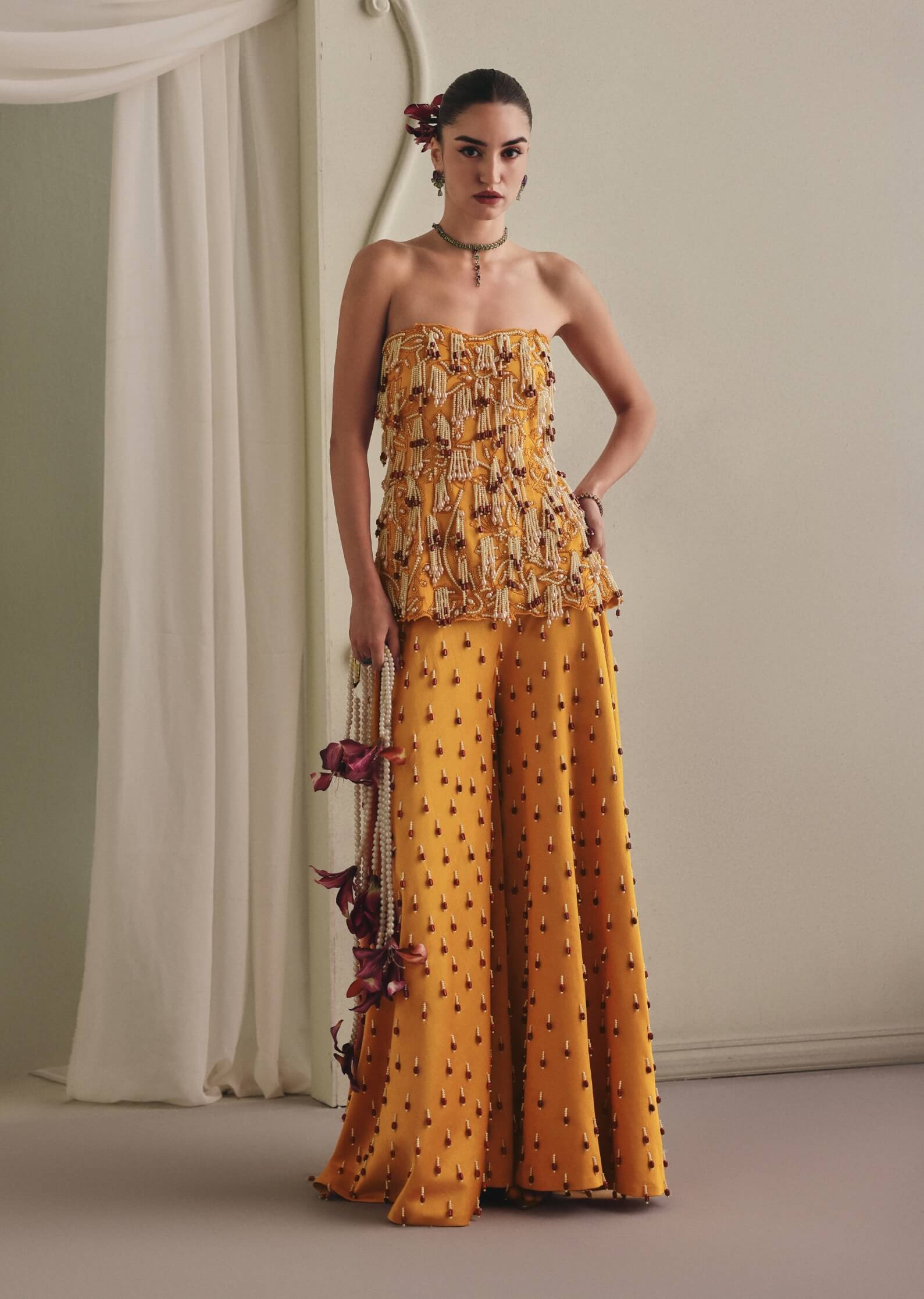 A statement in structure and shimmer — this Gaji silk co-ord set pairs a strapless top with wide-legged palazzos. Intricately detailed with pearls and cutdana work, it flows with refined grace — perfect for modern festivities.