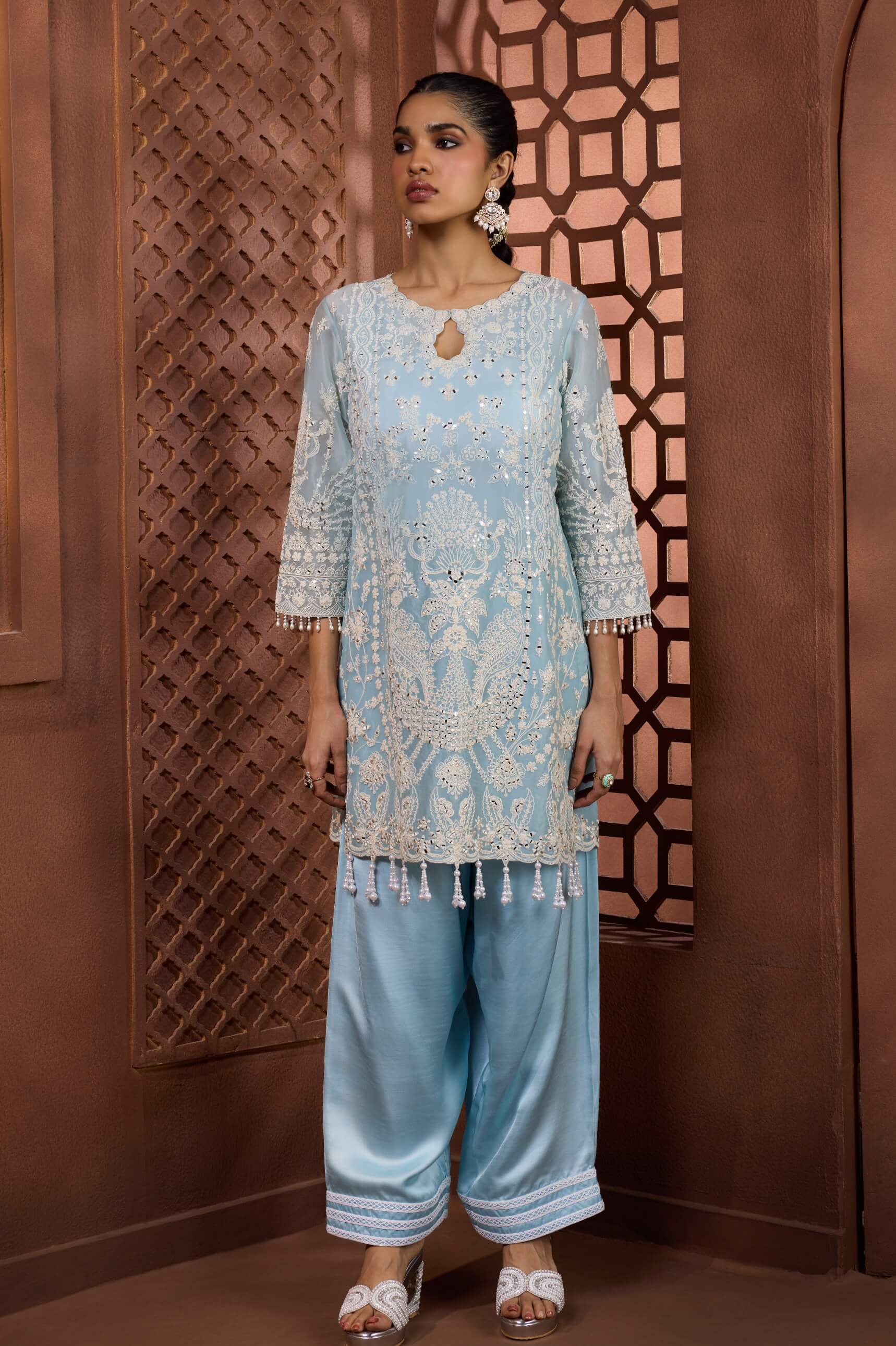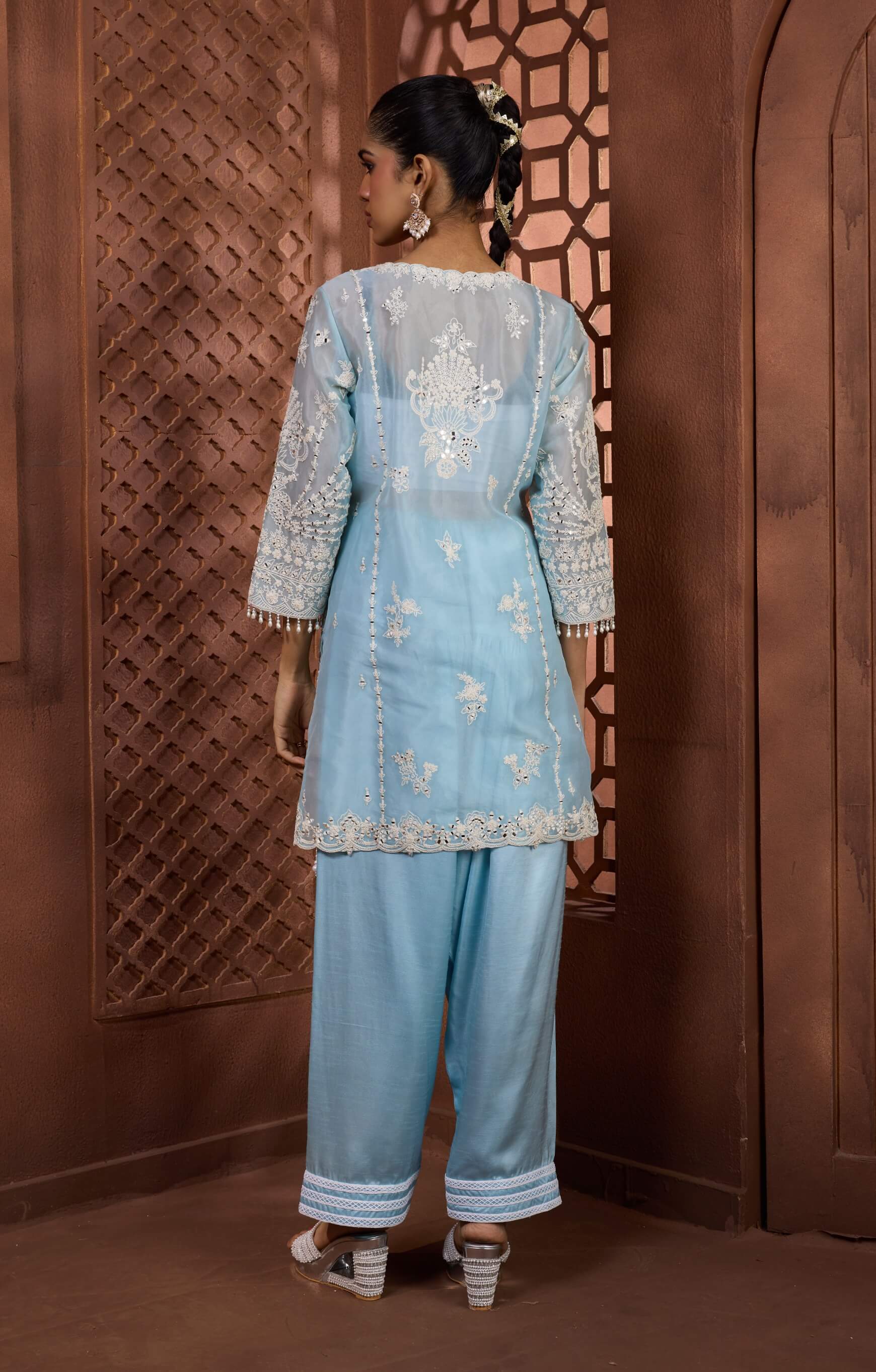 Light as summer air, the aakash-ganga set is rendered in ethereal powder blue hues. The sheer organza kurta is intricately embroidered with white tonal motifs, mirrors, and a pearl-fringed hemline. Paired with matching salwar finished with lace borders, it offers luminous elegance. Ideal for summer festivities and daytime events.