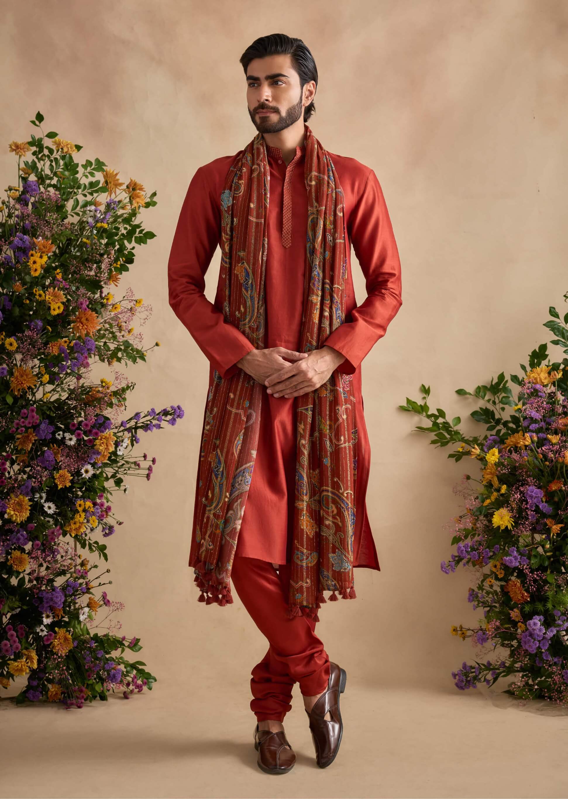 Radiate energy in this orange poppy kurta set. Crafted in chanderi silk, the ensemble combines a traditional silhouette with a bold contemporary hue. Ideal for haldi ceremonies and daytime festivities.