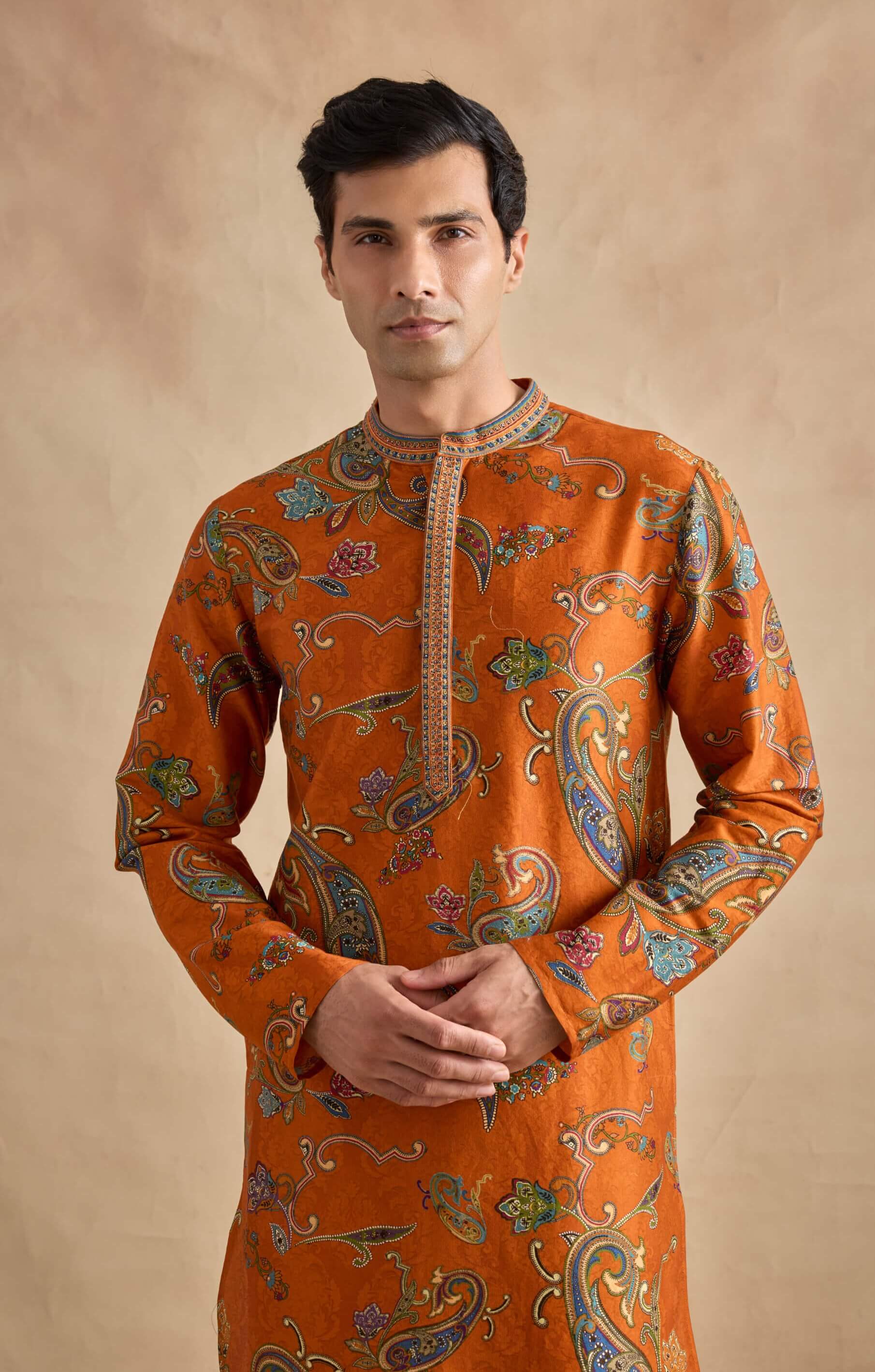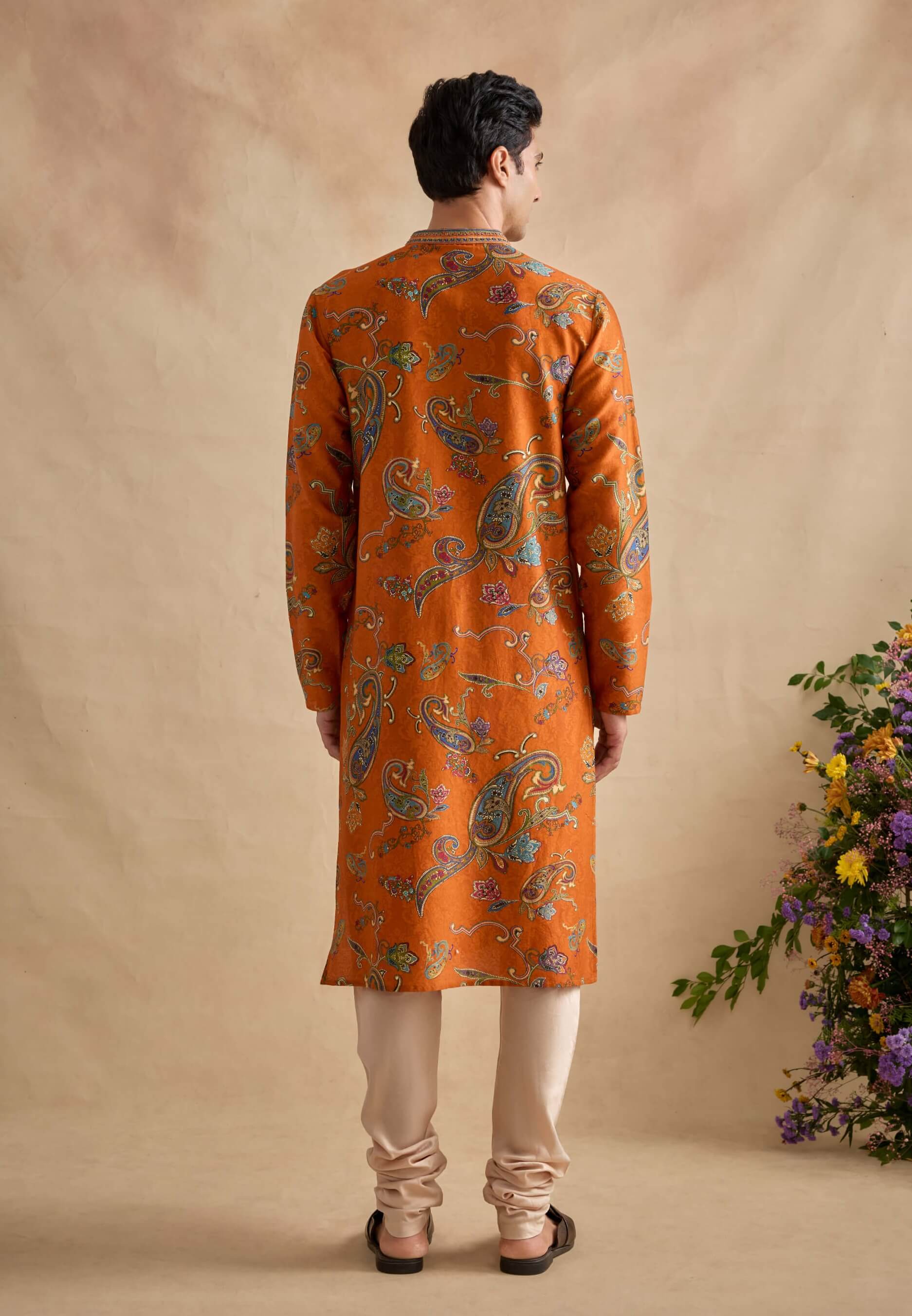 A vibrant and festive tangerine kurta set crafted in chanderi silk. Paired with a beige churidar, it offers a classic yet energetic look for celebrations.
