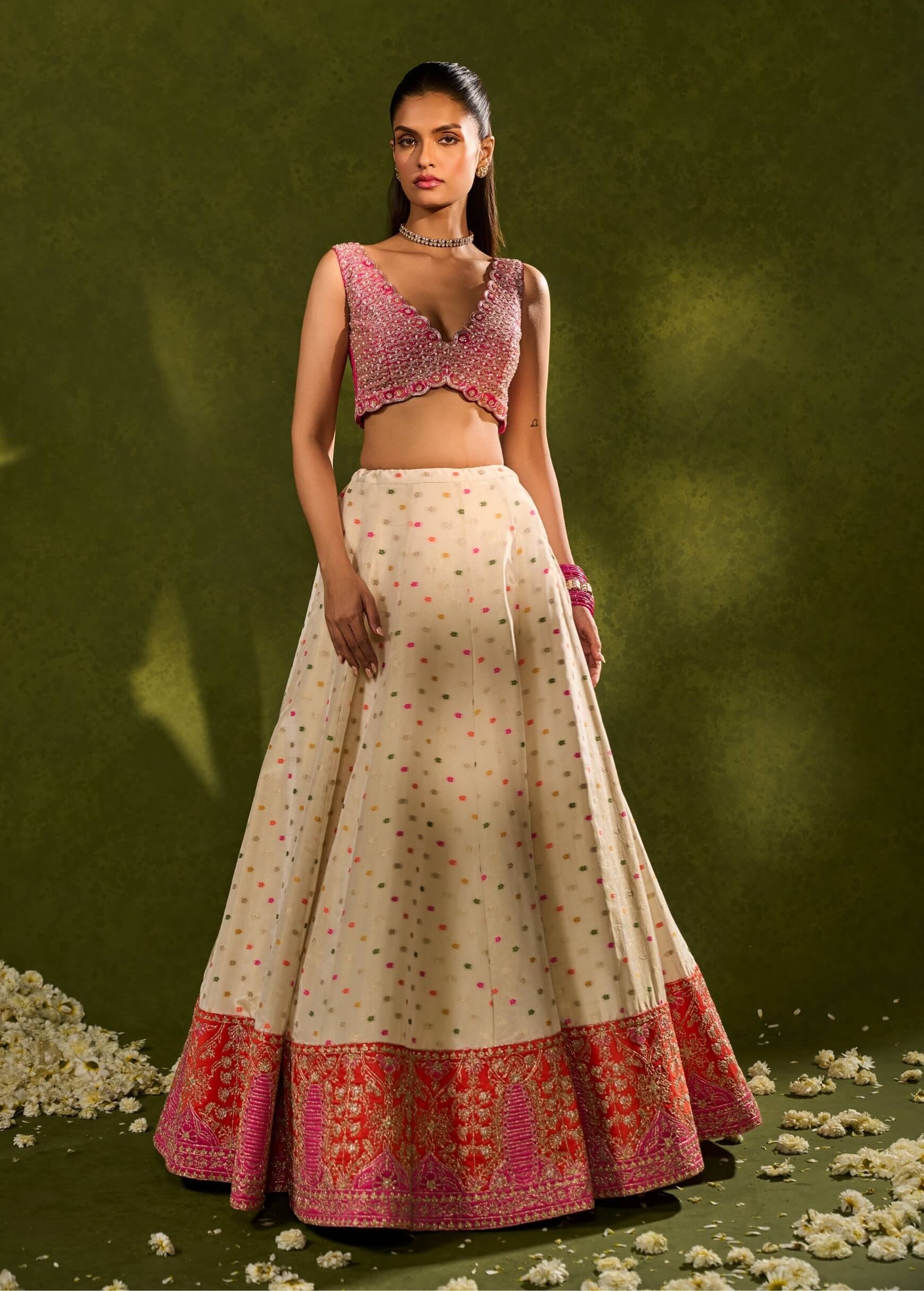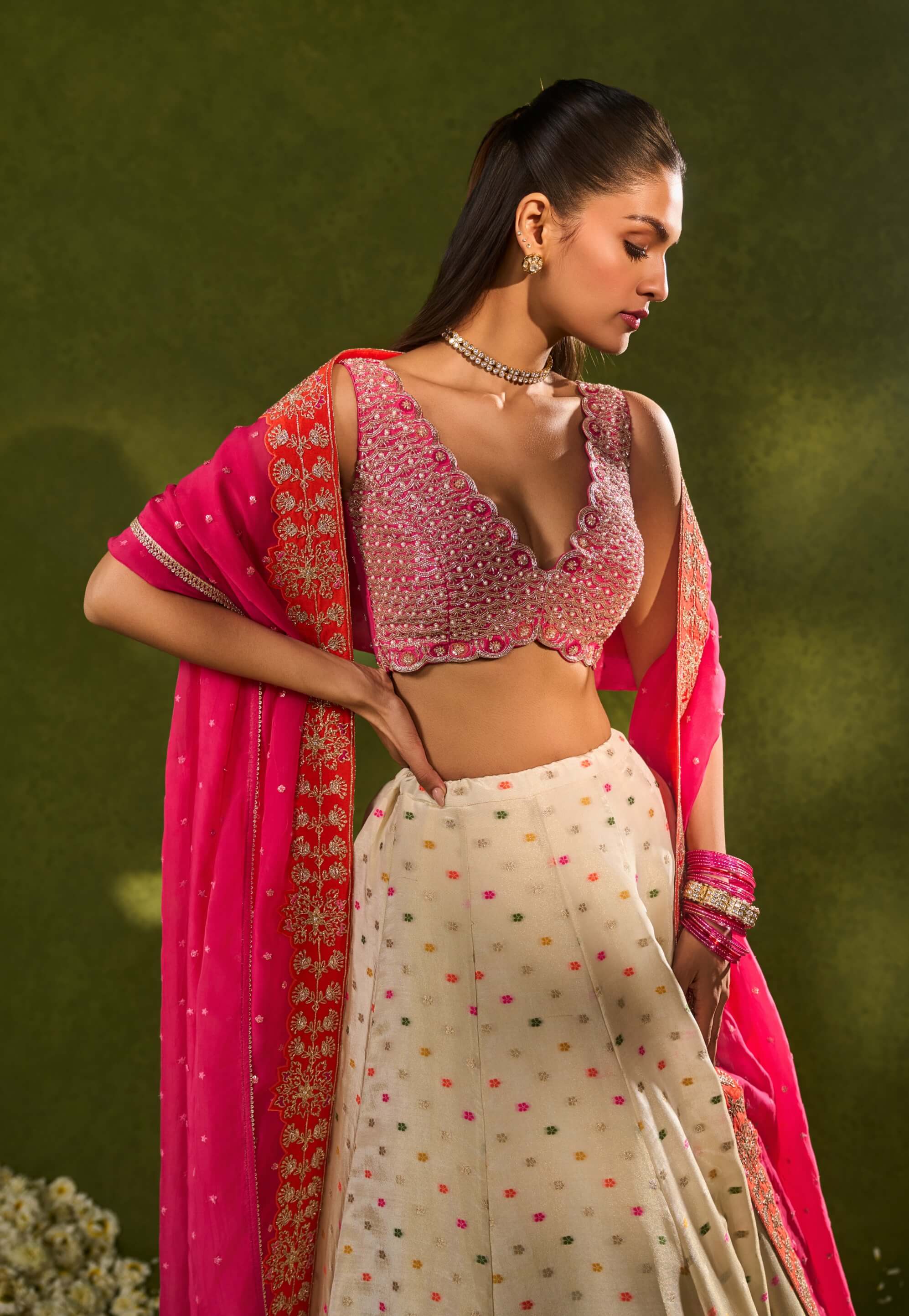 Artfully detailed, this ivory multicolour tissue jamewar lehenga features finely embroidered appliqué and zari detailing along the hem. The pink raw silk blouse is delicately embellished with resham, sequins, zardozi, glass beads, and pearls. The organza dupatta adds contrast and softness. Designed for elevated festive wear. Perfect for wedding rituals.