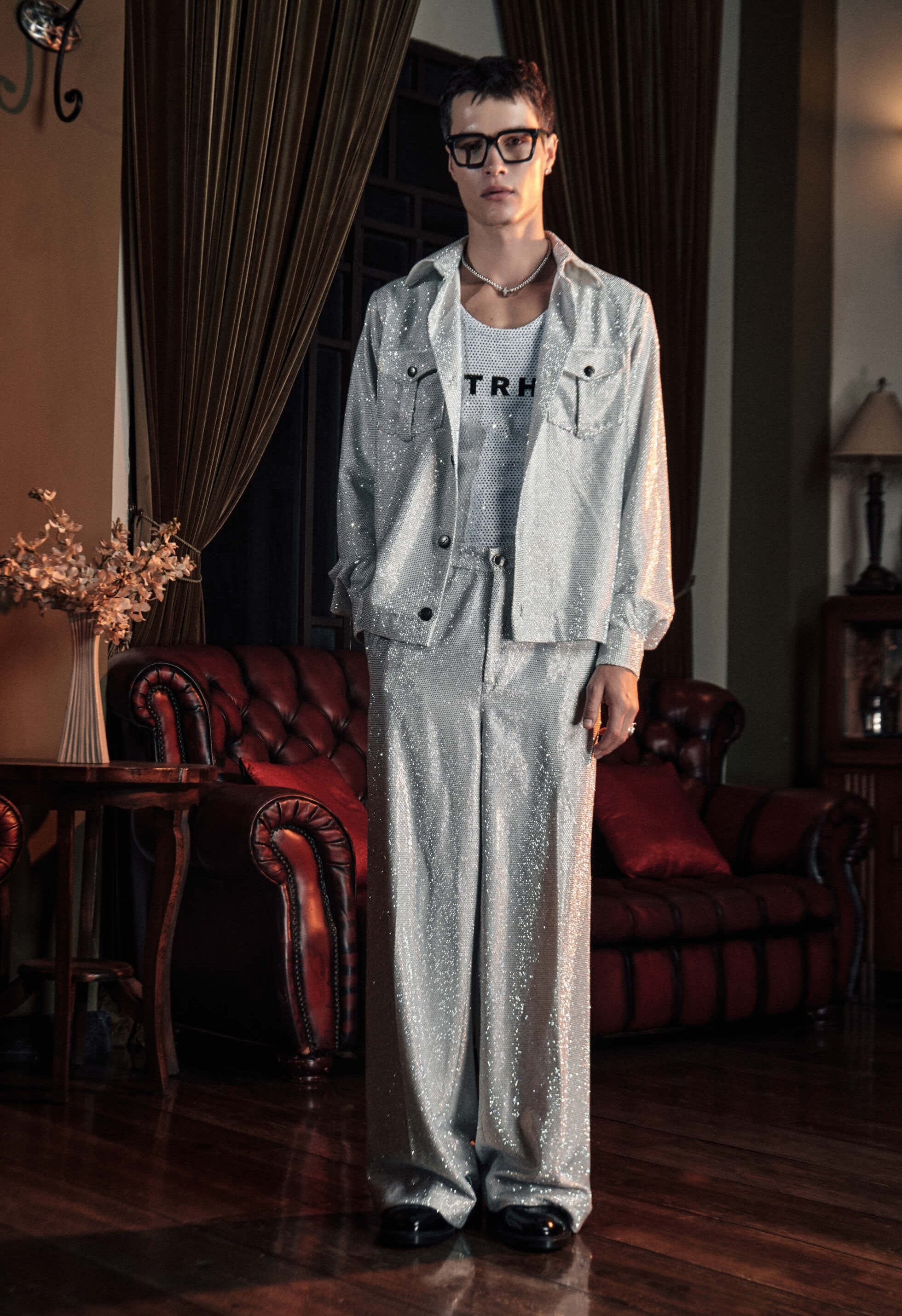Step into a futuristic aesthetic with this white melon crepe bomber and silver trousers. Complemented by a metallic tank, this high-contrast look is designed for the bold trendsetter.