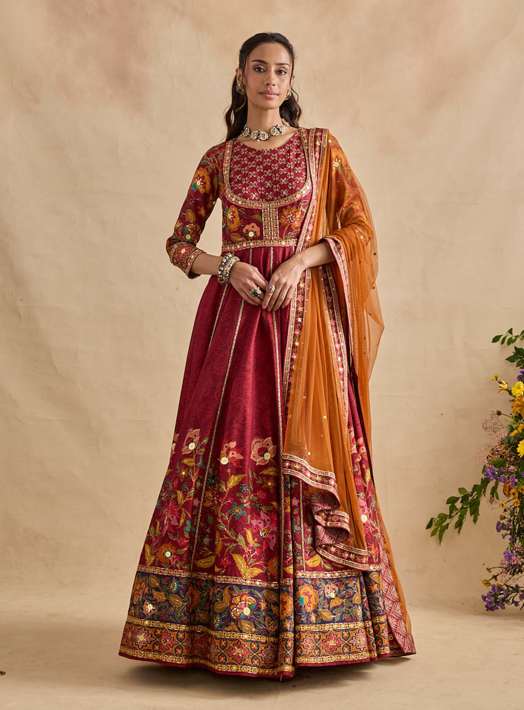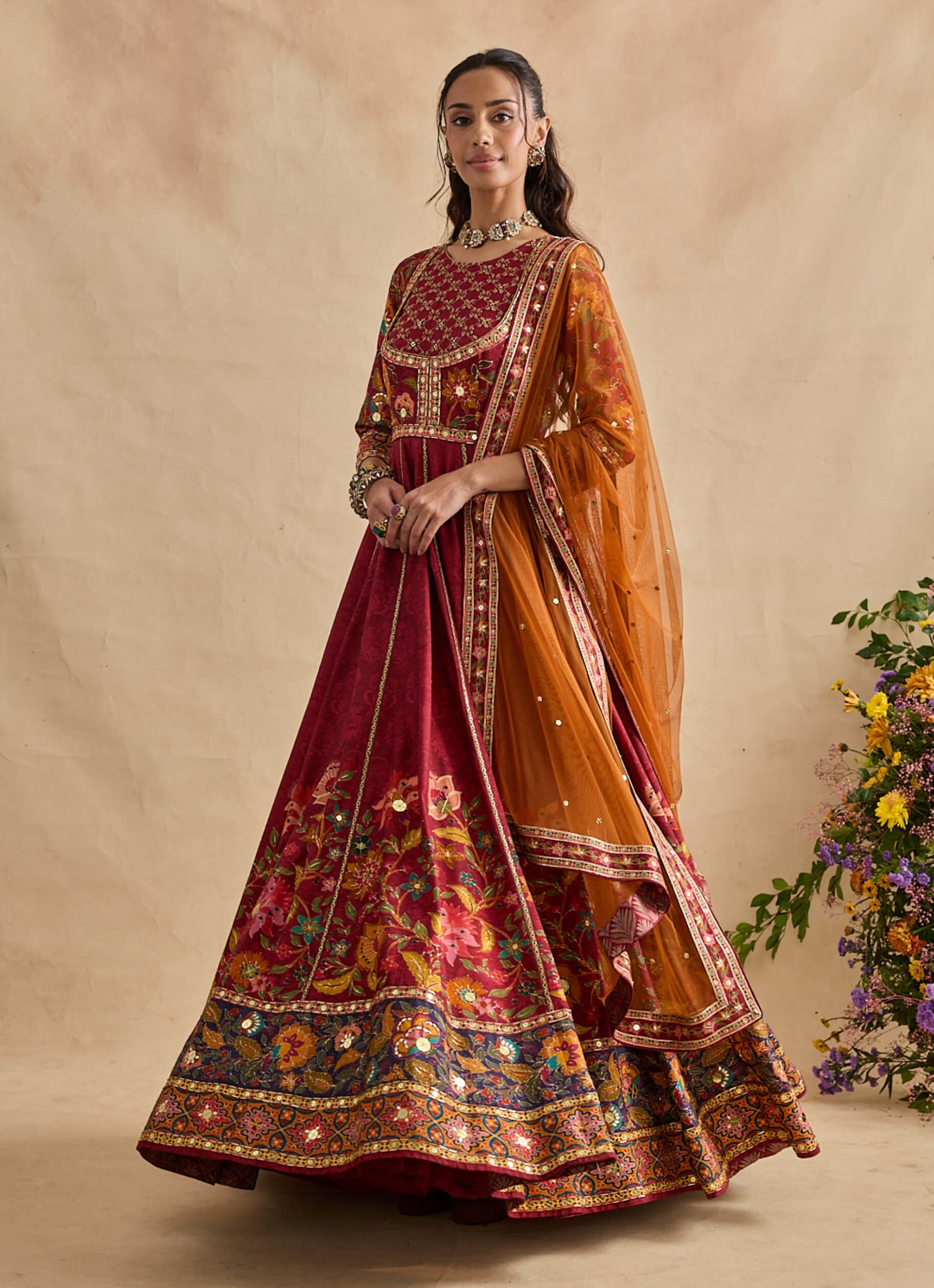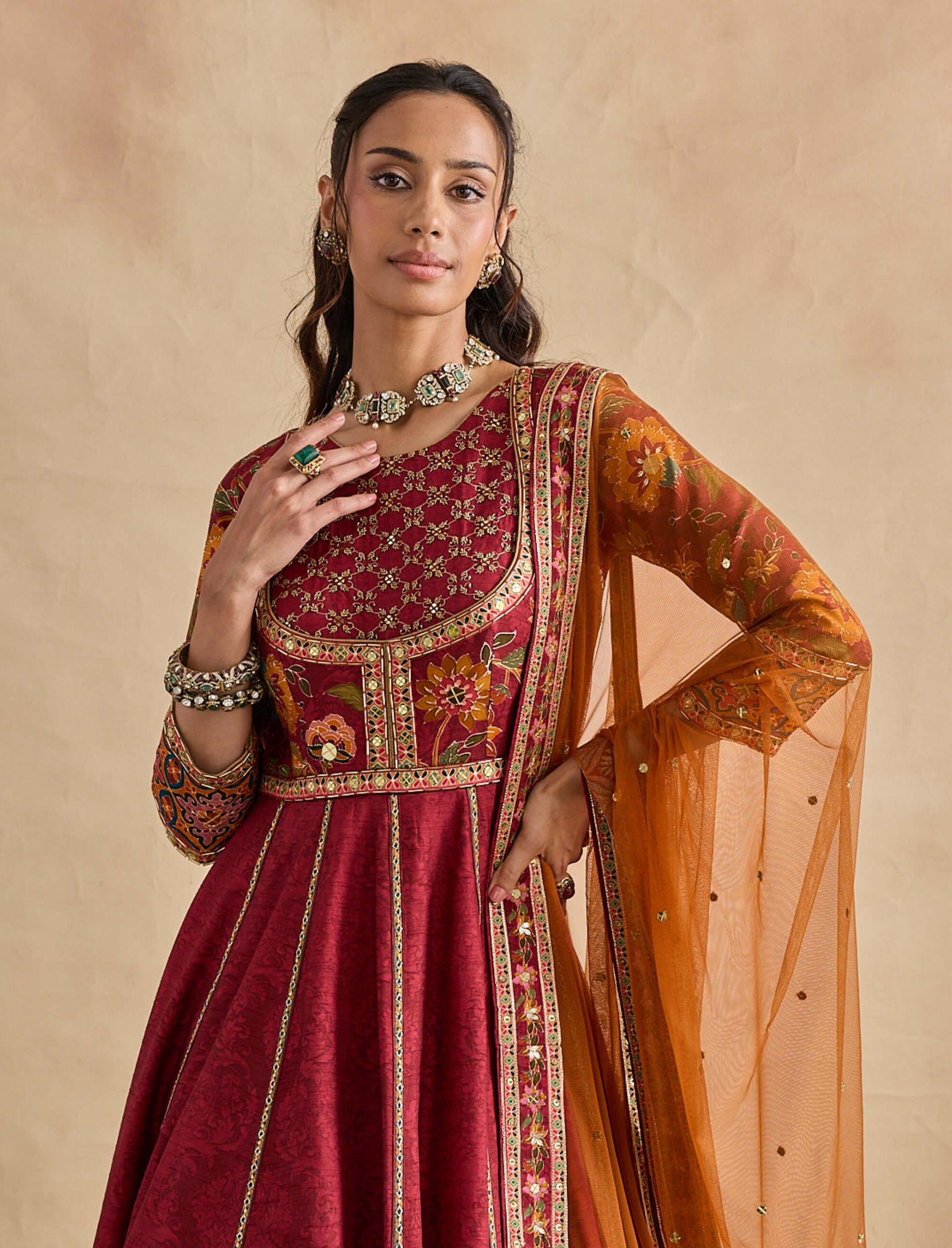 Rooted in regal inspiration, this crimson red anarkali features persian floral motifs with intricate hand embroidery on the yoke and a jacket-style silhouette, paired with a contrasting orange dupatta and crafted in viscose silk tulle, perfect for festive evenings and wedding functions.