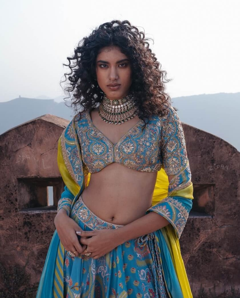 A poetic blend of mist blue and dry henna florals, this noor lehenga set is crafted for refined celebrations. Intricate detailing and fluid movement create a regal silhouette. Ideal for wedding festivities, sangeet nights, and elegant evening soirées.