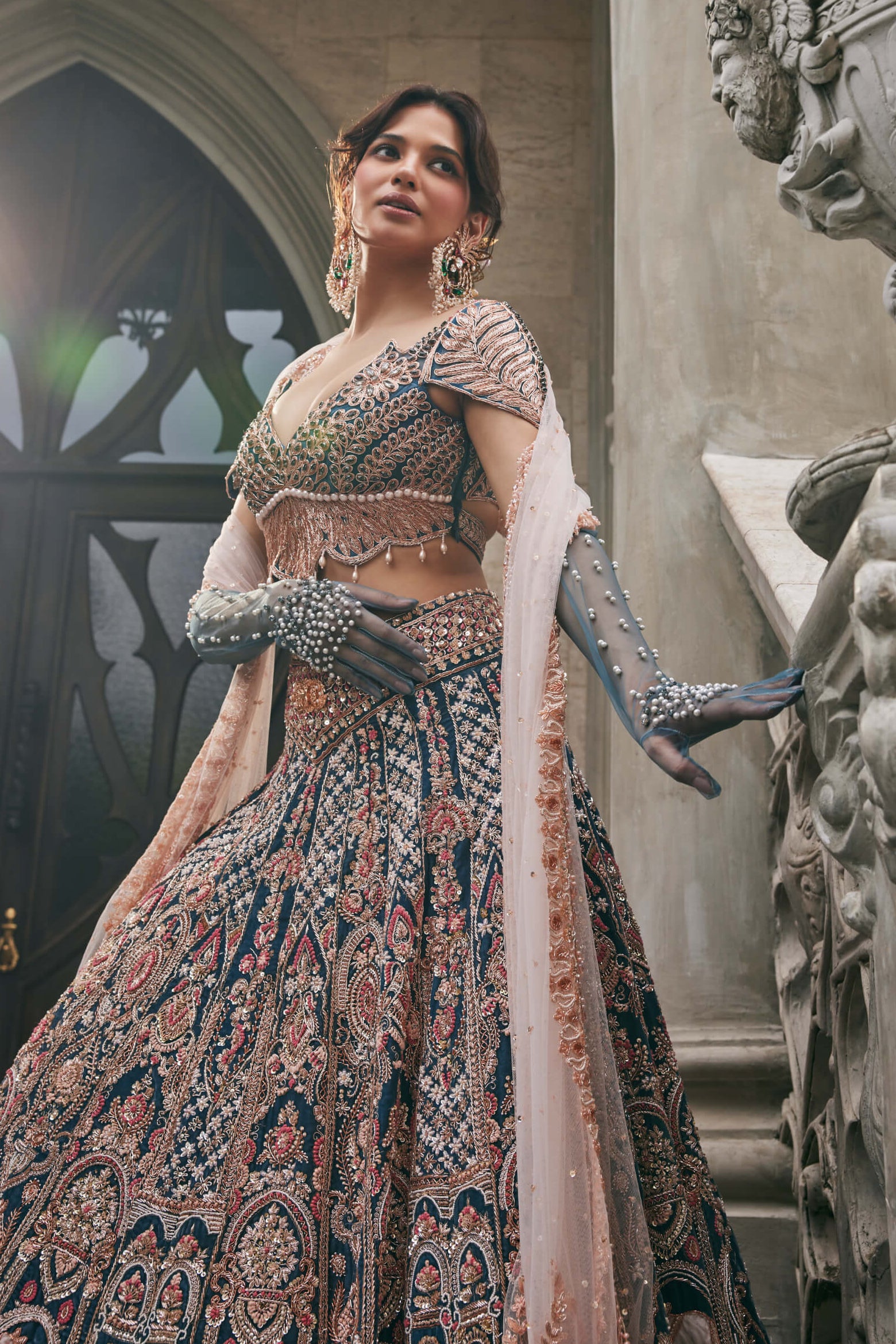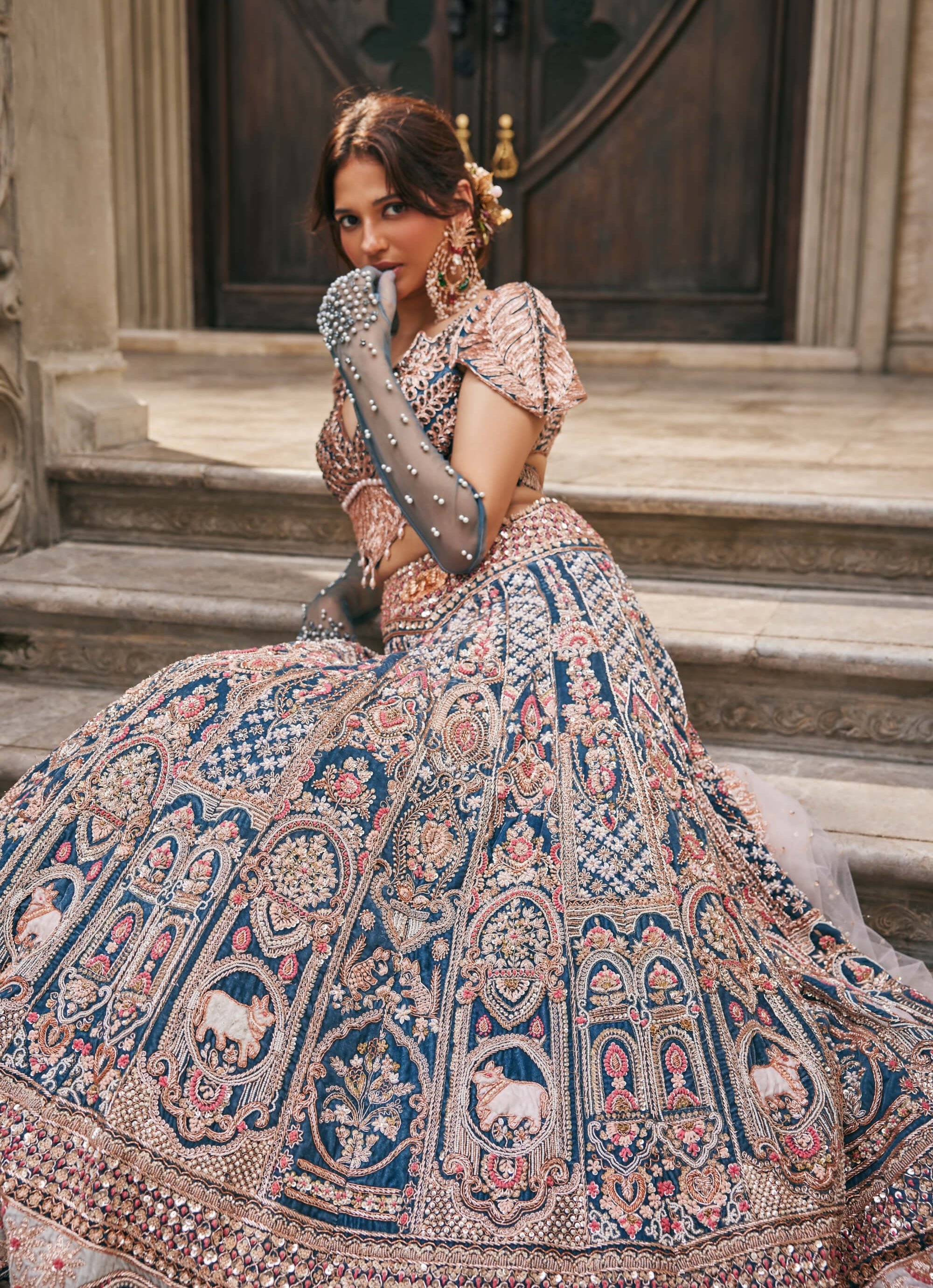A majestic velvet lehenga in French blue, adorned with blush pink appliqué and intricate hand embroidery. Regal motifs including Kamdhenu Mata and a serene garden scene narrate divine femininity and abundance. Finished with a V-shaped broad belt, a net blouse with cap sleeves, and a soft net dupatta, this ensemble is perfect for bridal events and heritage-inspired celebrations.
