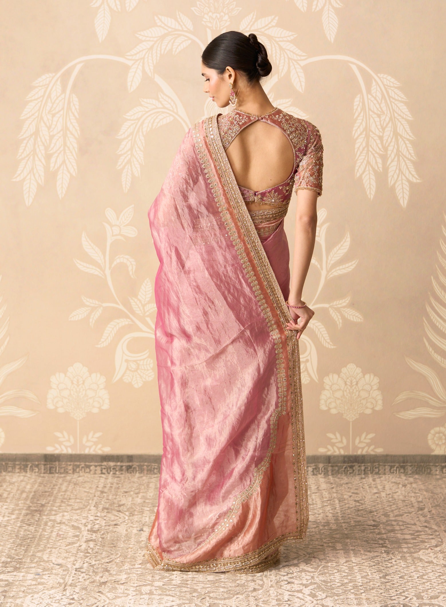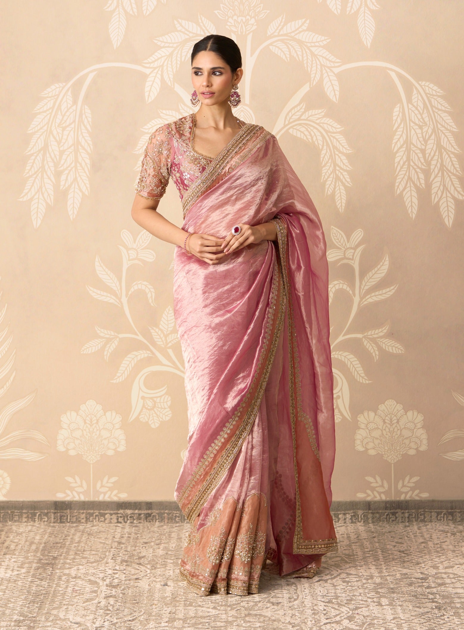 True to its name, this tissue embroidered blouse with a tissue flat sari and crepe petticoat offers ceremonial elegance for weddings, receptions, and festive occasions.