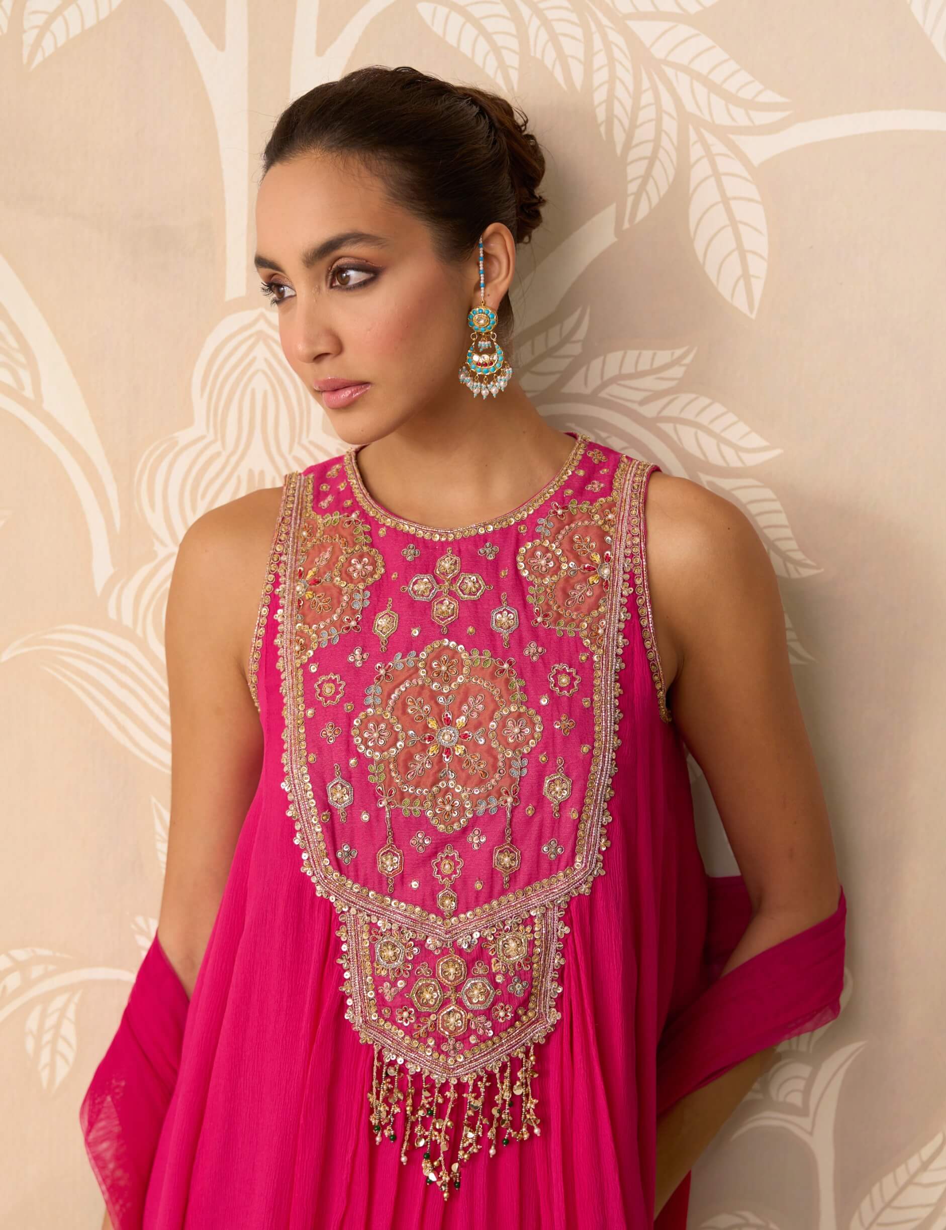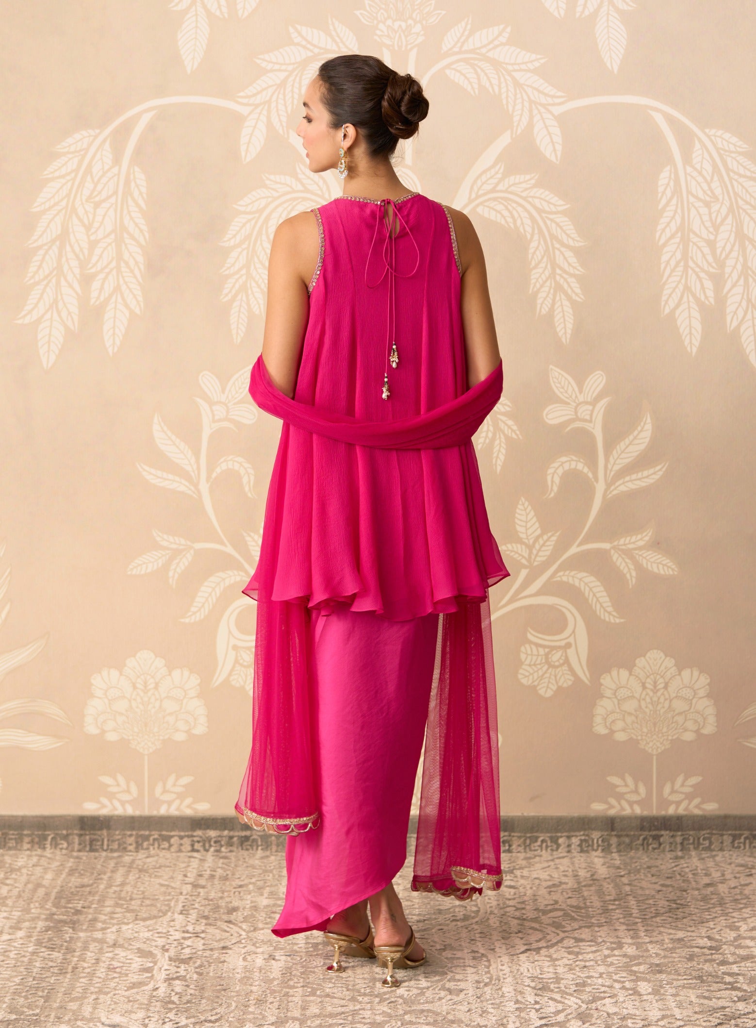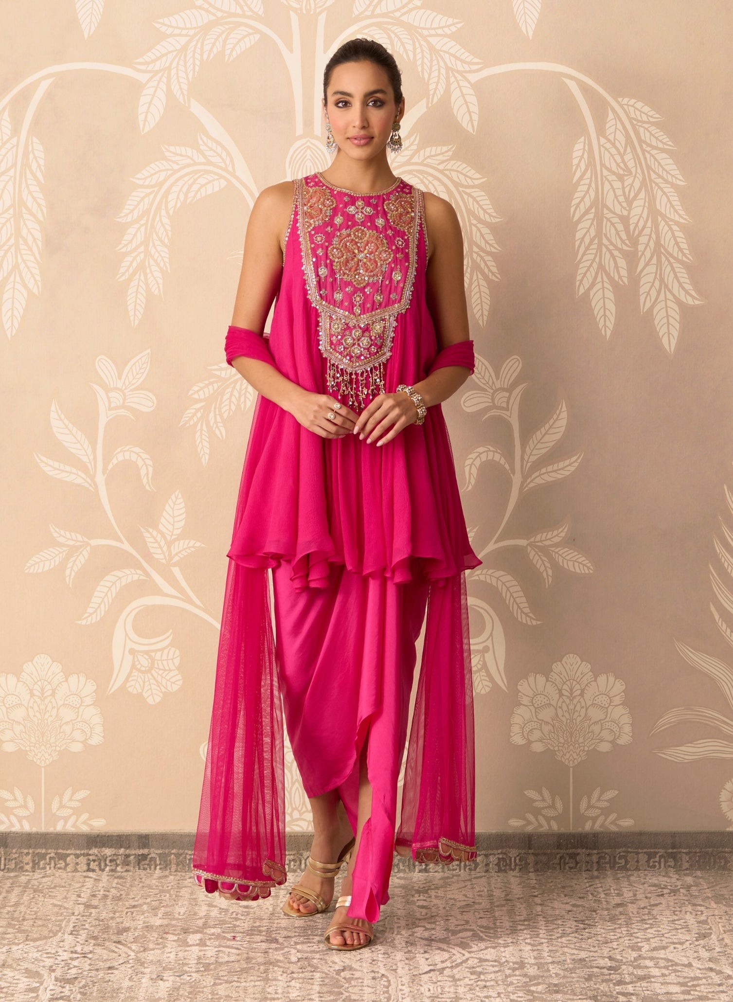 Playful yet elegant, this chiffon embroidered short kurti paired with a silk draped skirt and net dupatta is ideal for mehendi functions and festive daytime events.