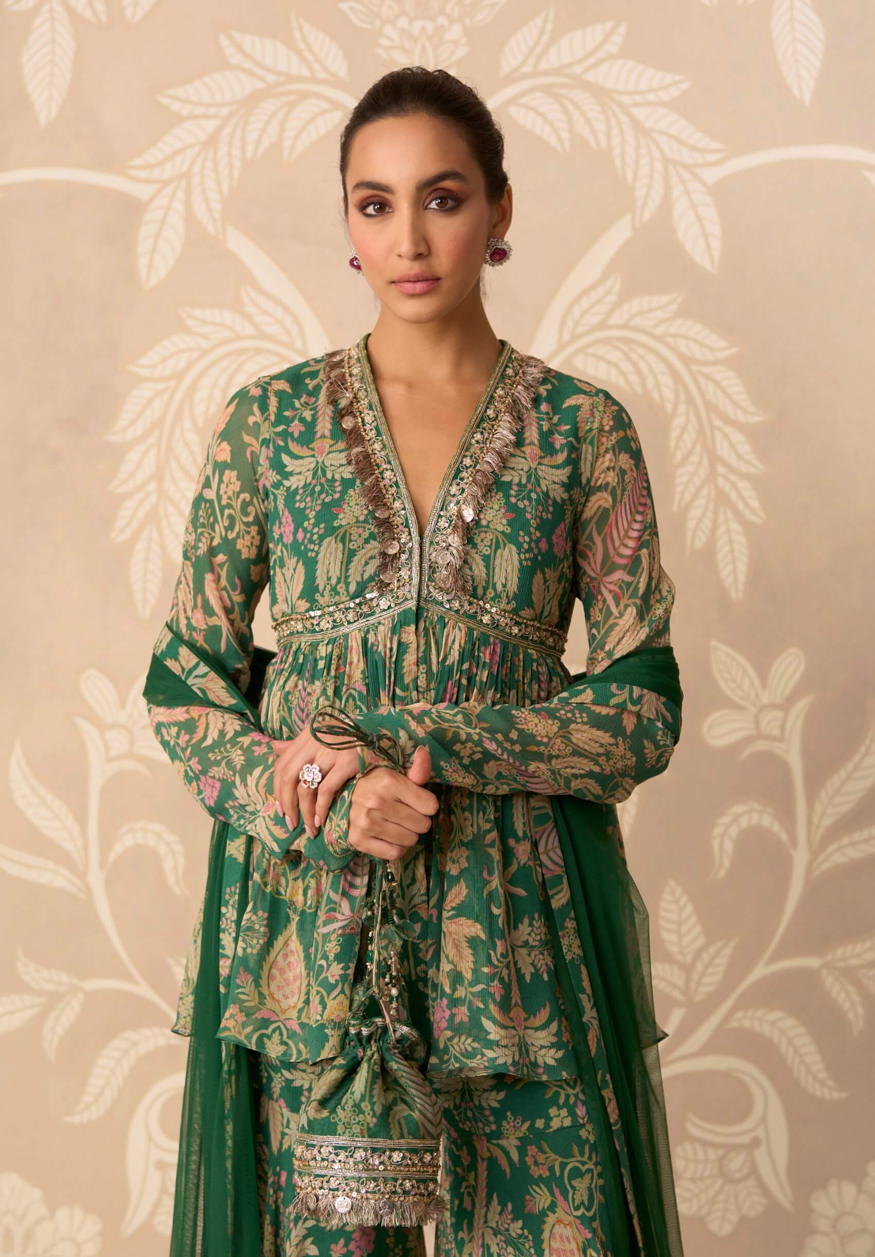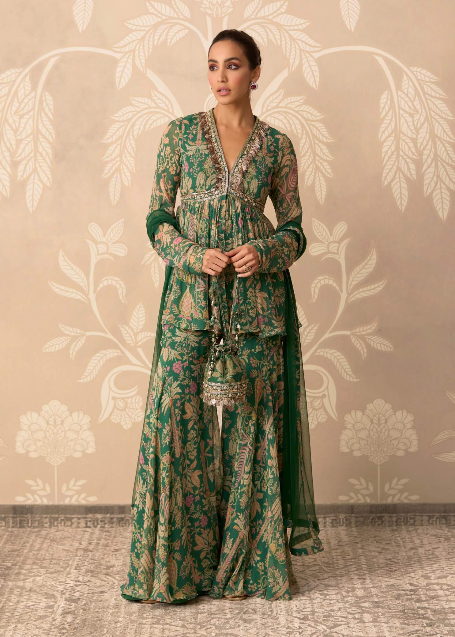 Modern and festive, this printed chiffon embroidered peplum top with garara and net dupatta is perfect for mehendi ceremonies and celebratory gatherings.