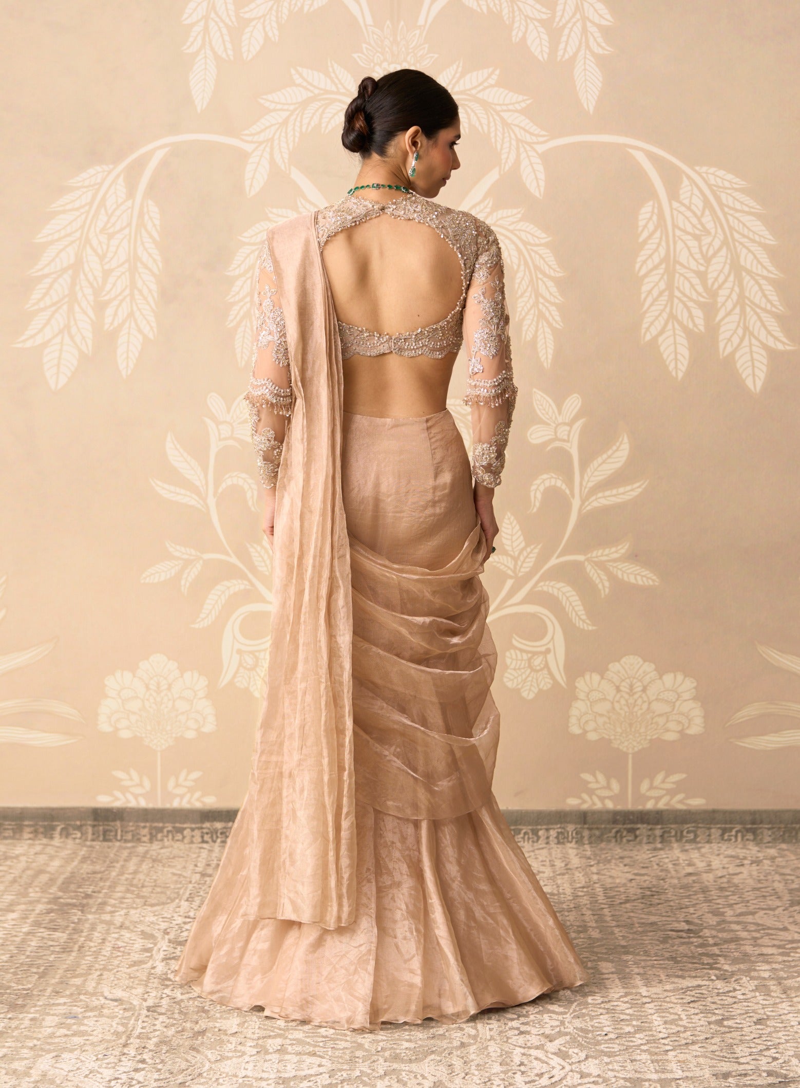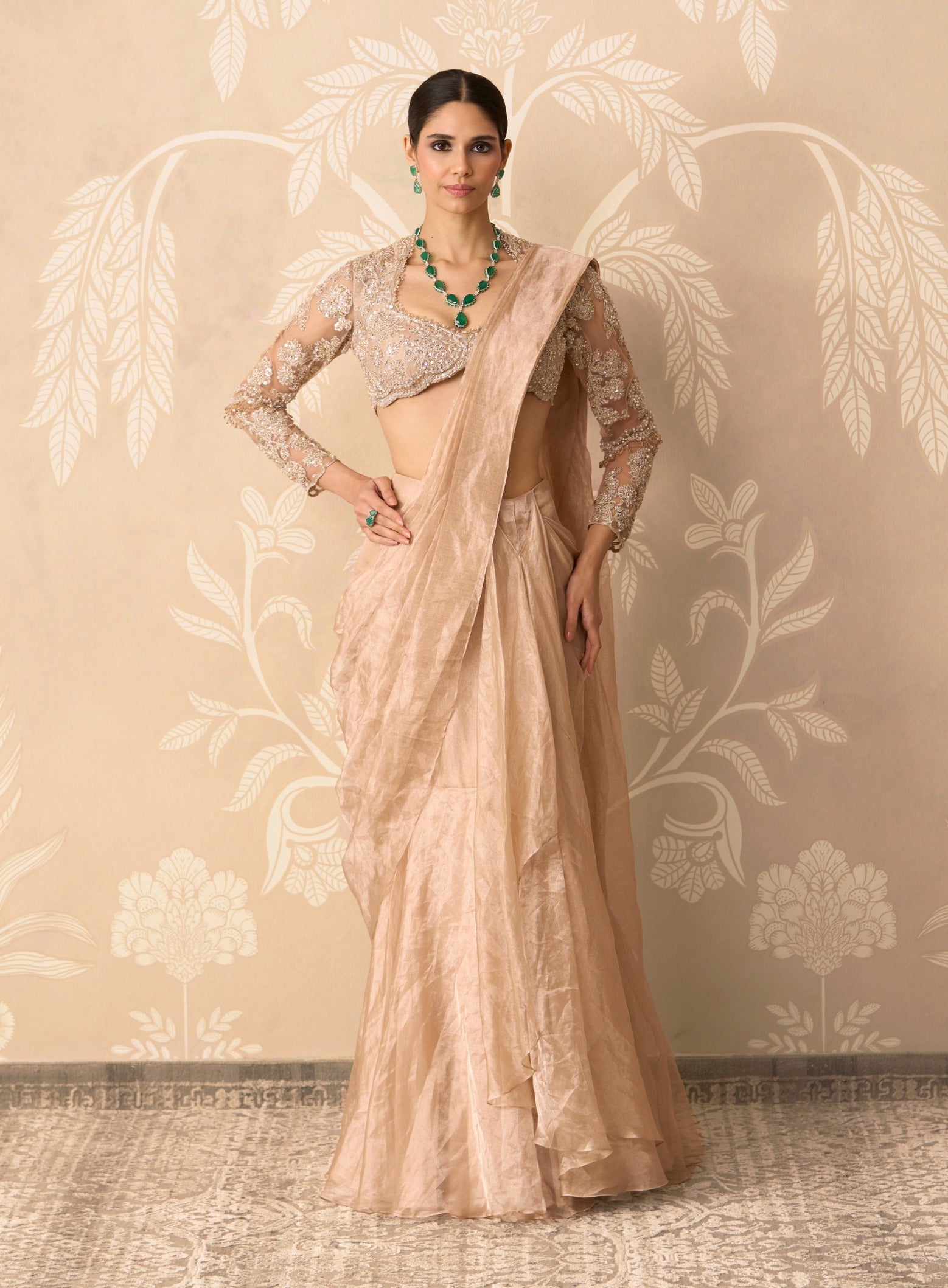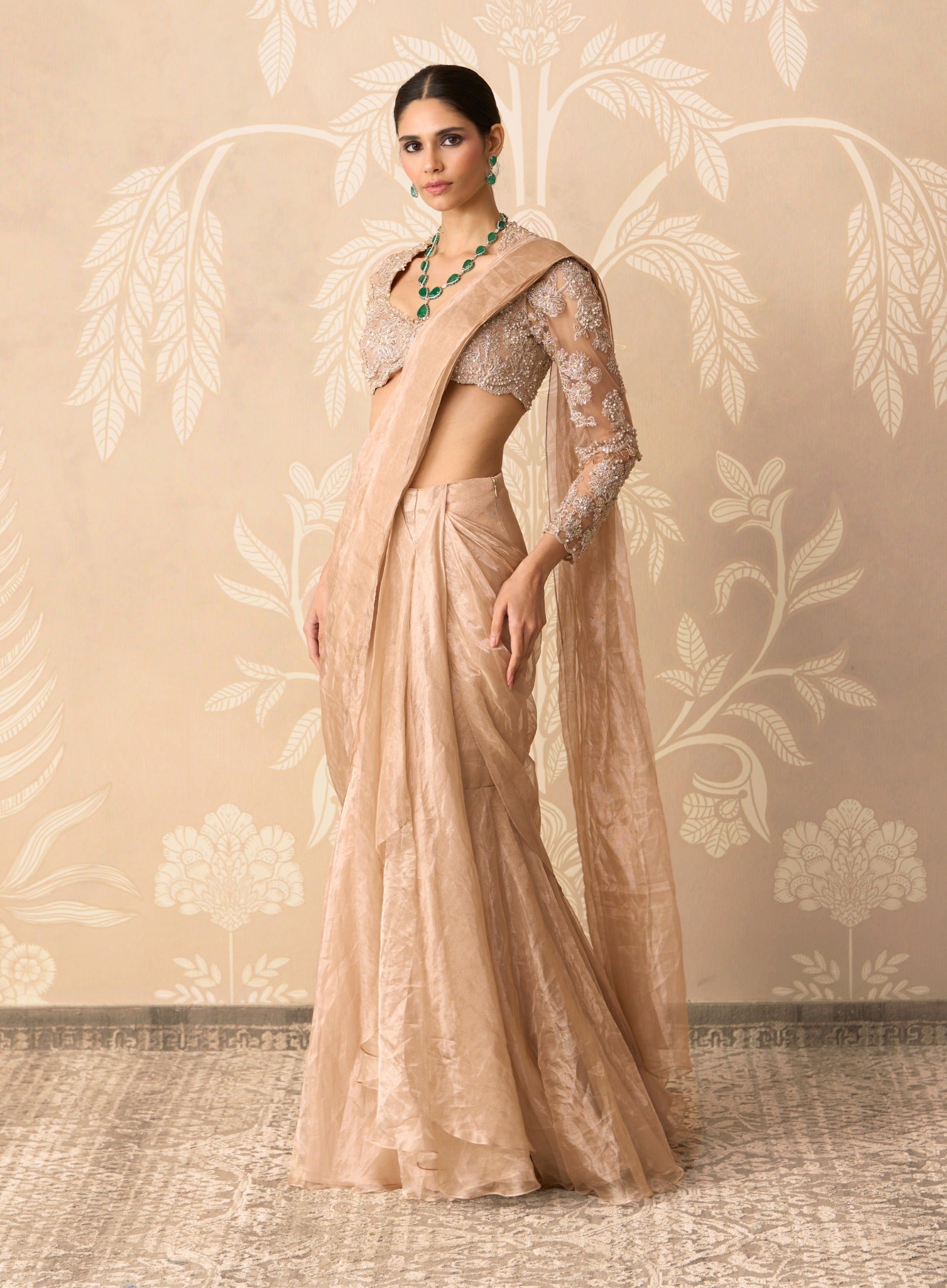 Elegant and fluid, this net and tissue embroidered blouse paired with a tissue draped stitched sari offers timeless appeal for wedding guests and festive evenings.