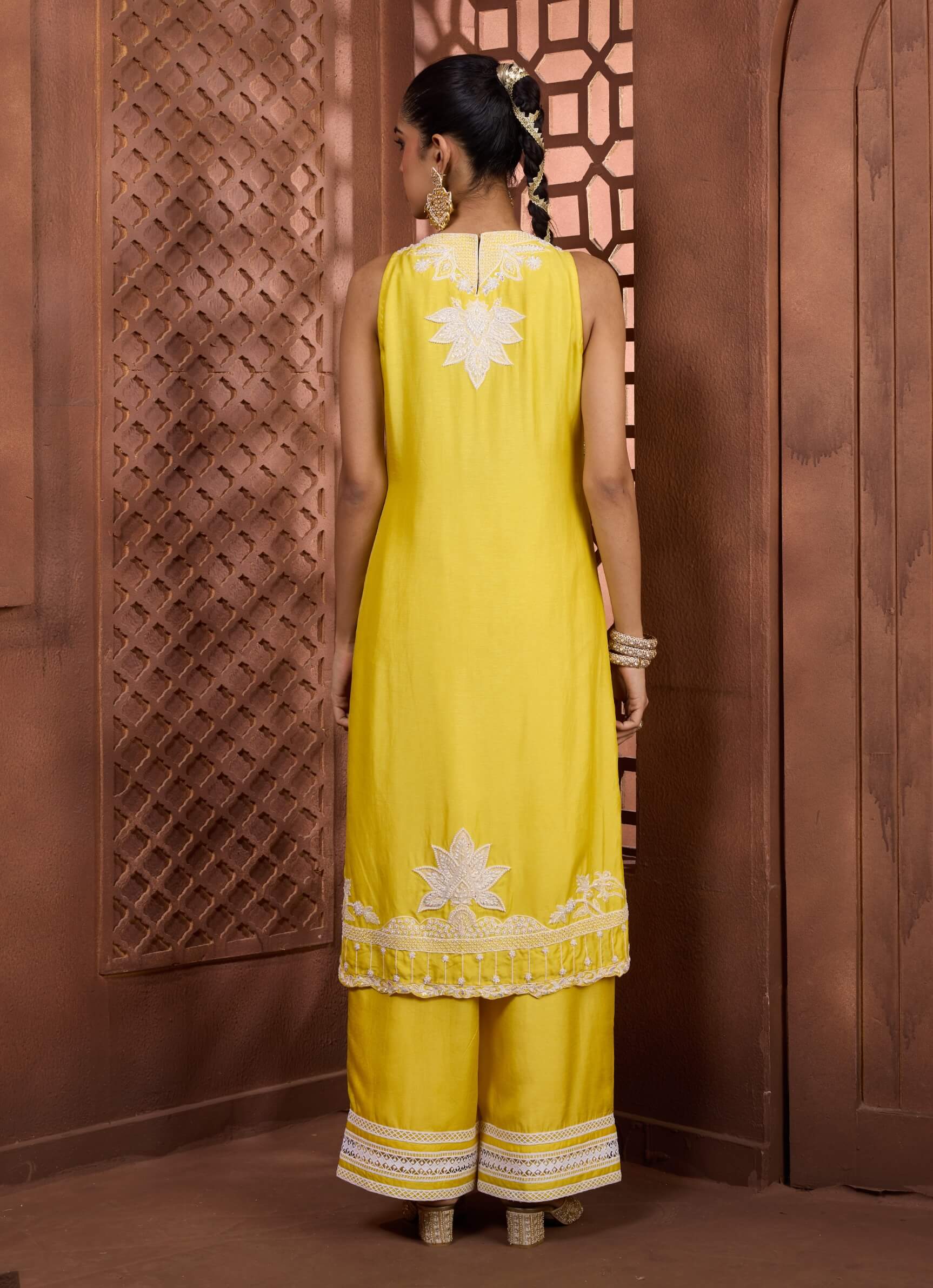 Effortlessly cheerful and refined, the hamsa pushpa set shines in vibrant yellow hues. The sleeveless kurta is hand embroidered with white floral pearlwork, sequins, and bead detailing, offering a relaxed yet festive silhouette. Paired with wide-leg trousers finished with lace-trimmed hems, it feels contemporary and elegant. Perfect for festive celebrations and daytime events.