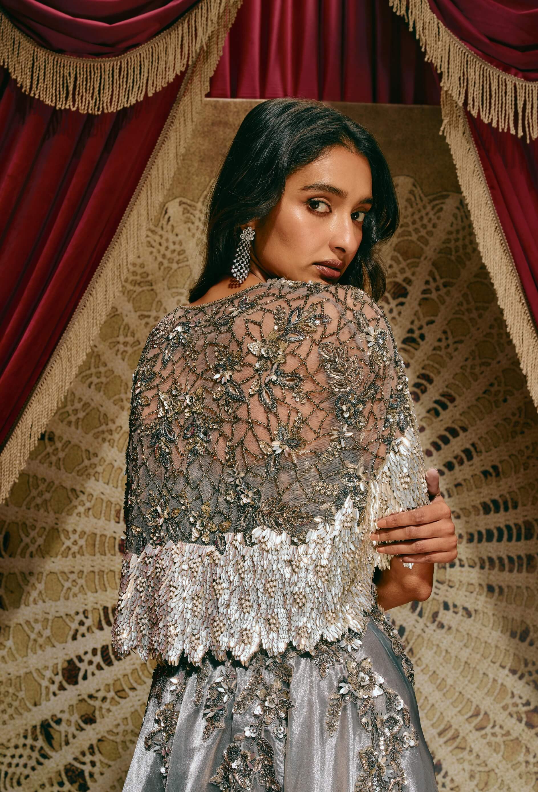 An expression of stylised luxury, this charcoal grey gown showcases a structured strapless bodice adorned with metallic beadwork and sequins. A delicate embellished cape enhances its regal aura while the fluid skirt moves with grace. Ideal for cocktail evenings, receptions, and formal celebrations.