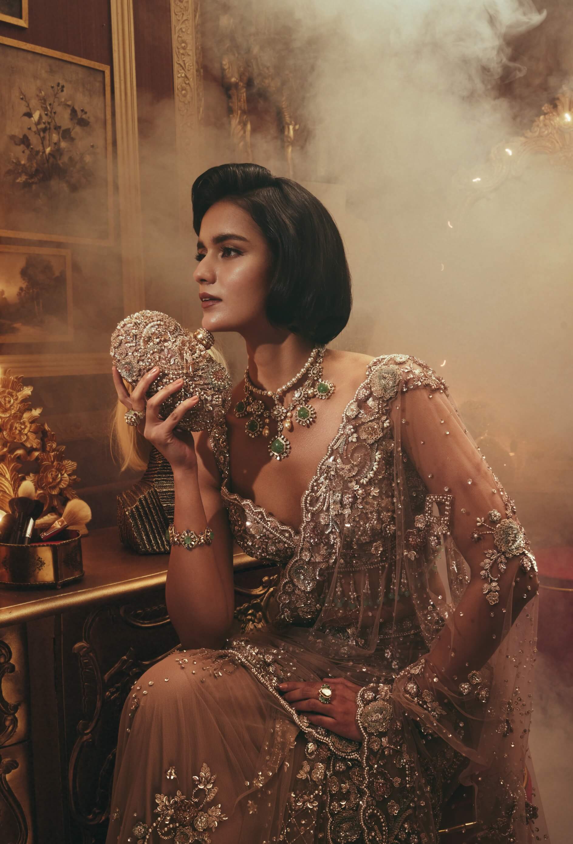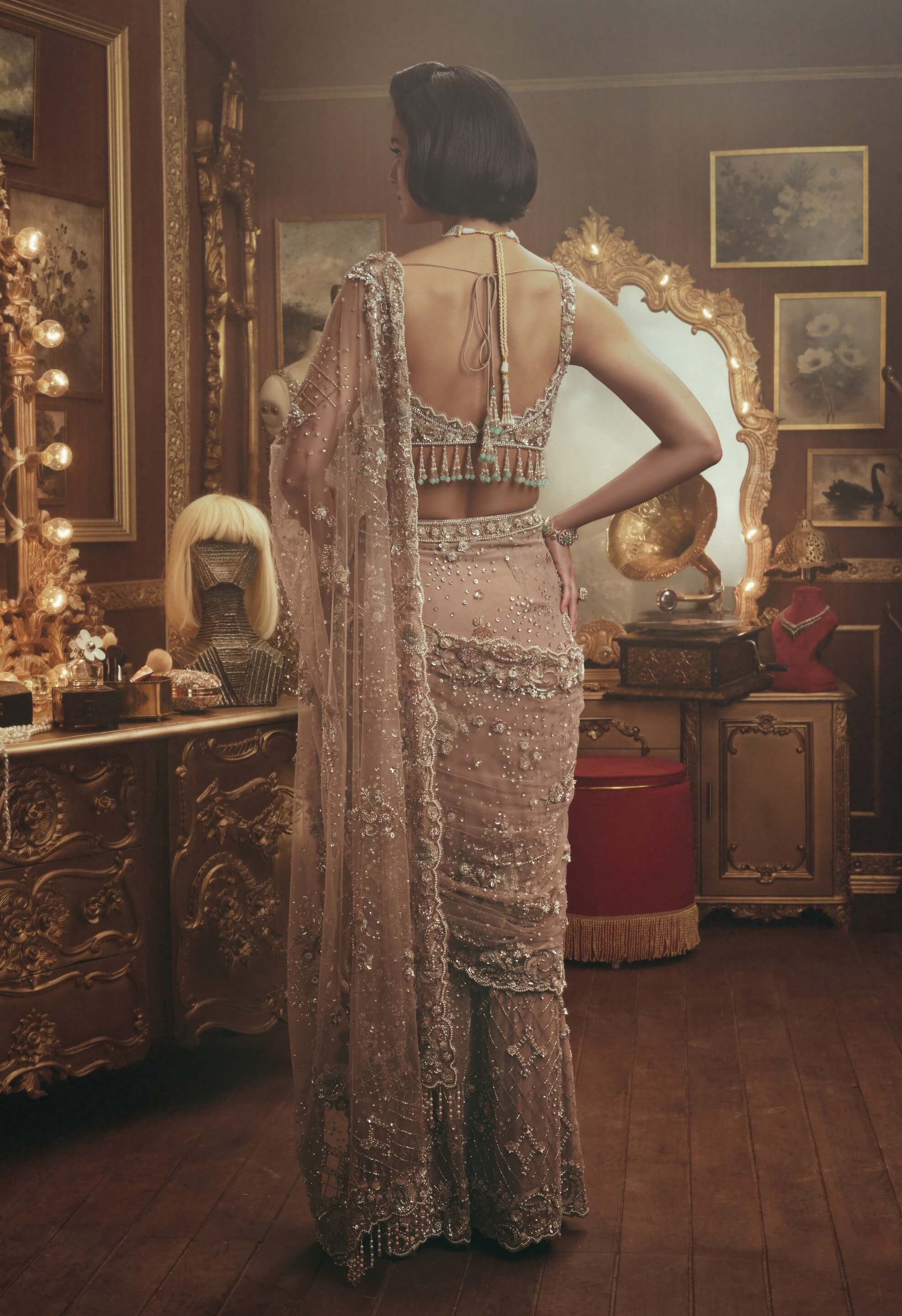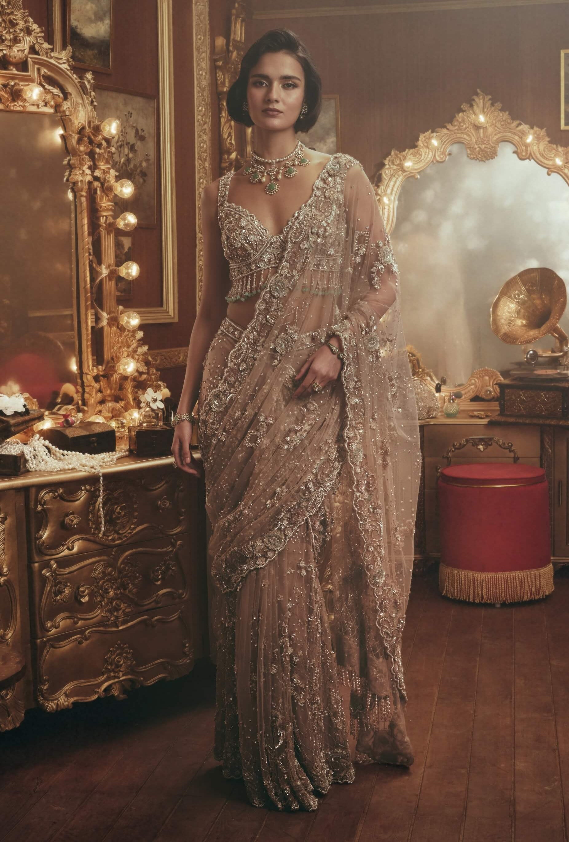 Timeless stylised luxury defines this nude brown drape sari adorned with delicate hand embroidery and ornate motifs. The finely embellished blouse complements the fluid drape with subtle shimmer and graceful detailing. Designed for understated sophistication. Ideal for wedding festivities, cocktail dinners, and elegant evening gatherings.