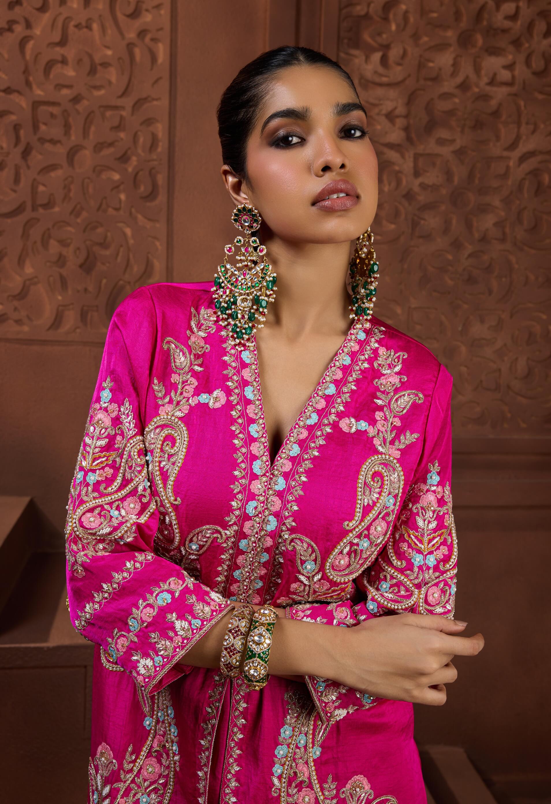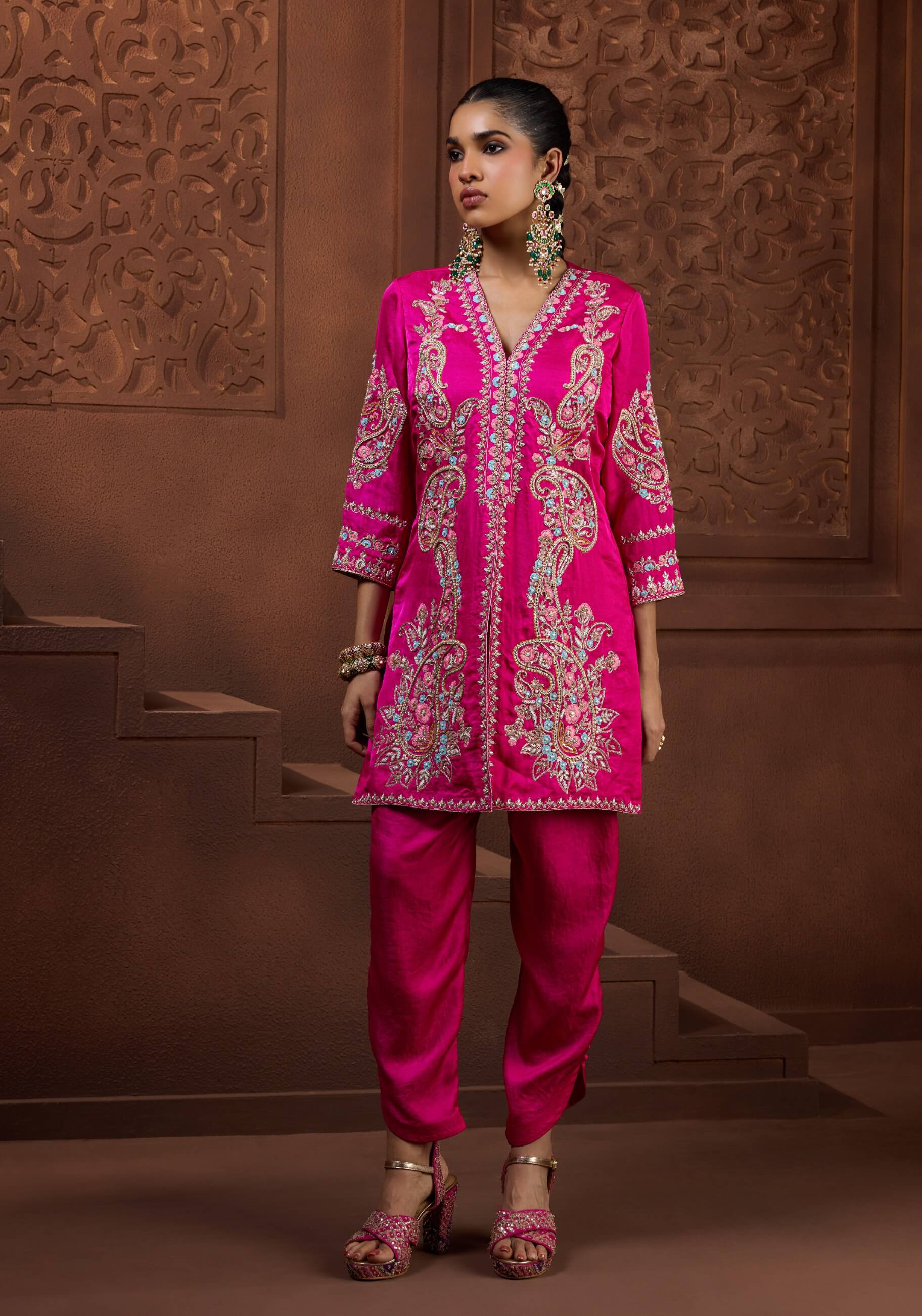 Designed to dazzle with vibrant elegance, the kanak prabha set features a fuchsia pink silk tunic with a deep v-neckline. Lavishly adorned with gold and turquoise zardosi paisley embroidery, paired with tapered trousers. Rich in colour and detail. Perfect for festive evenings, weddings, and celebratory events.