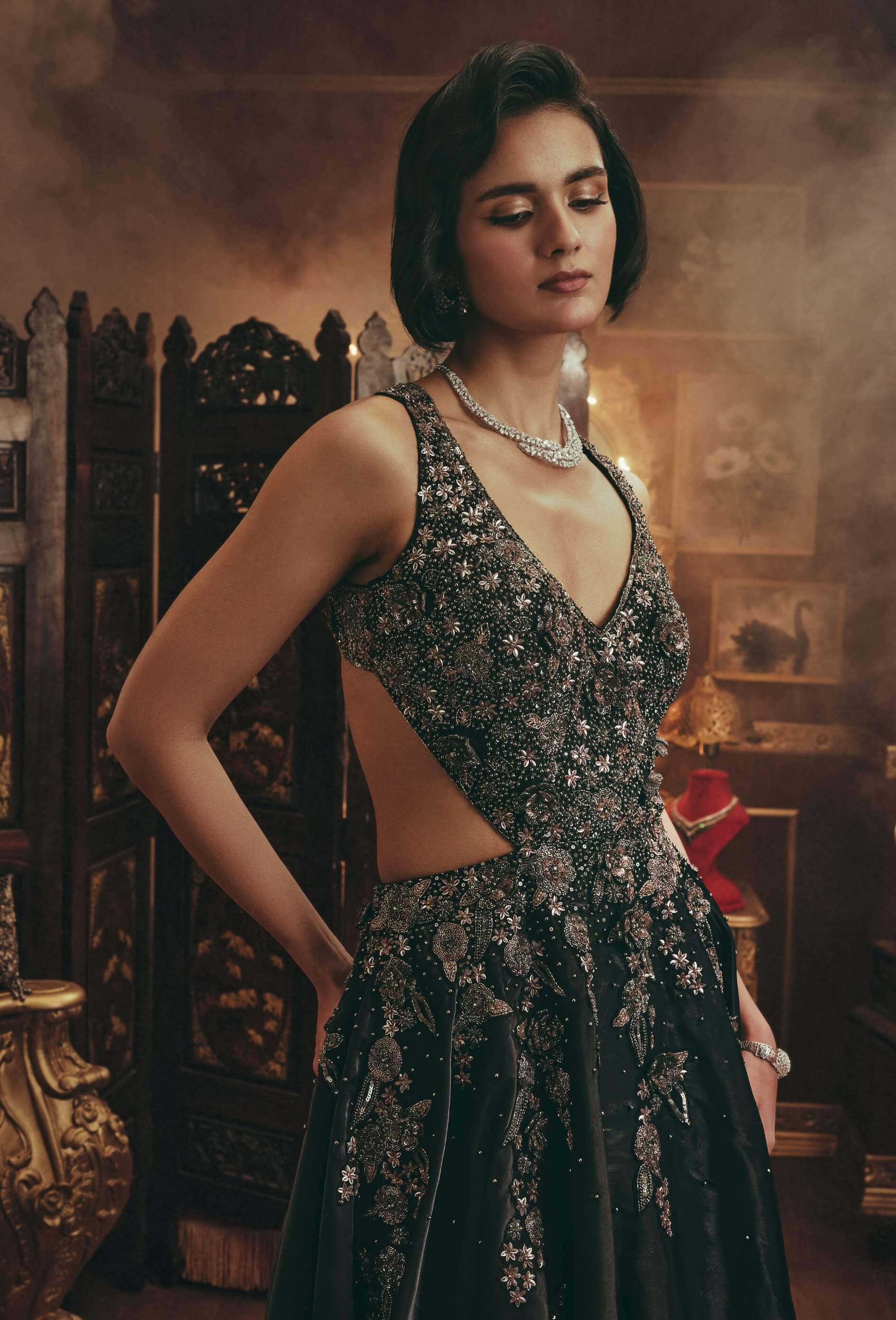 Glamorous stylised luxury shines through this black evening gown featuring a richly embellished bodice and voluminous skirt. Metallic embroidery adds intricate detailing while the sculpted neckline enhances its modern appeal. Elegant and dramatic in silhouette. Perfect for cocktail galas, receptions, and black-tie celebrations.