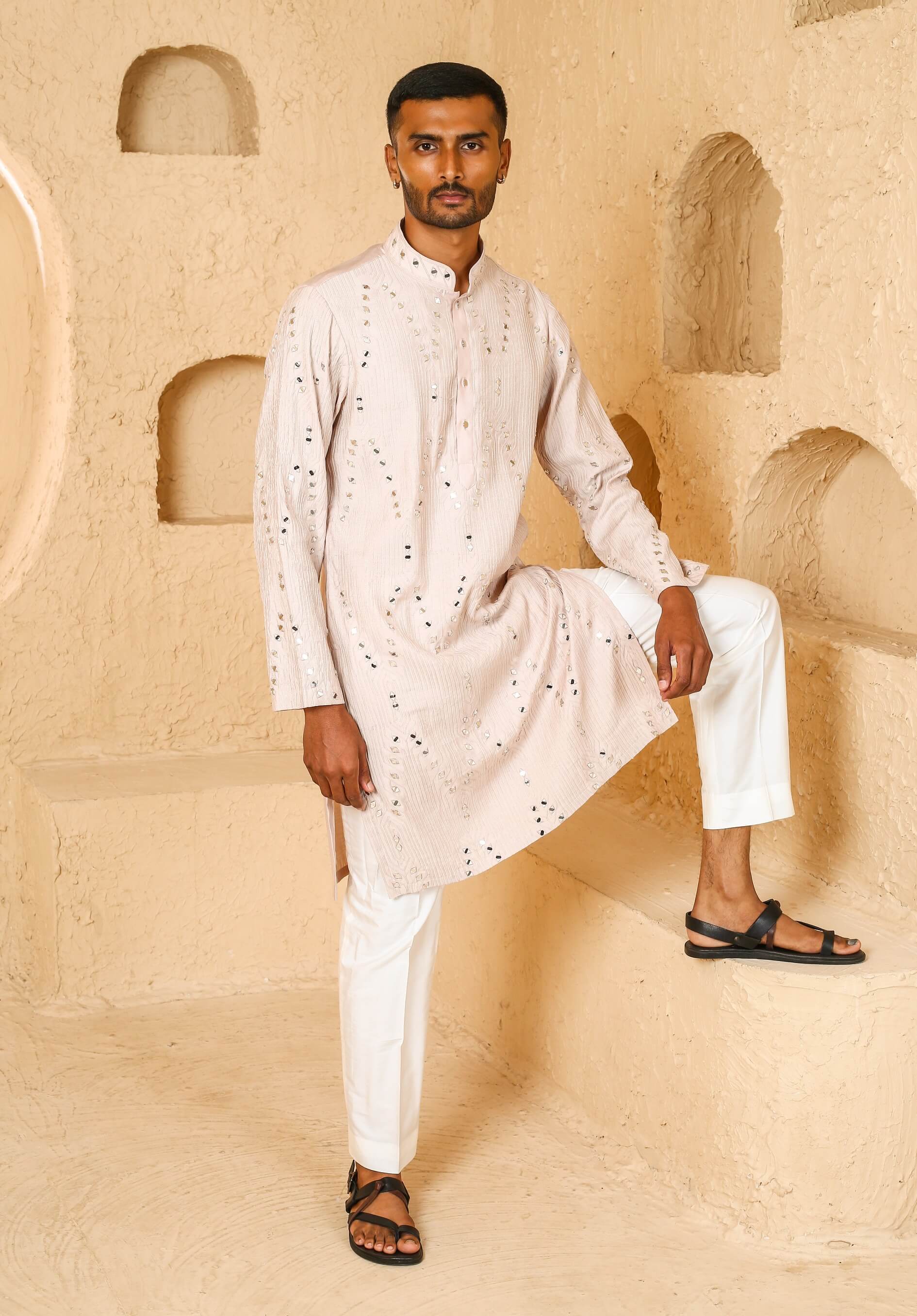 Soft and sophisticated, this beige kurta features delicate mirror work for subtle shine. The neutral tone ensures versatile styling. Ideal for daytime functions and festive rituals.
