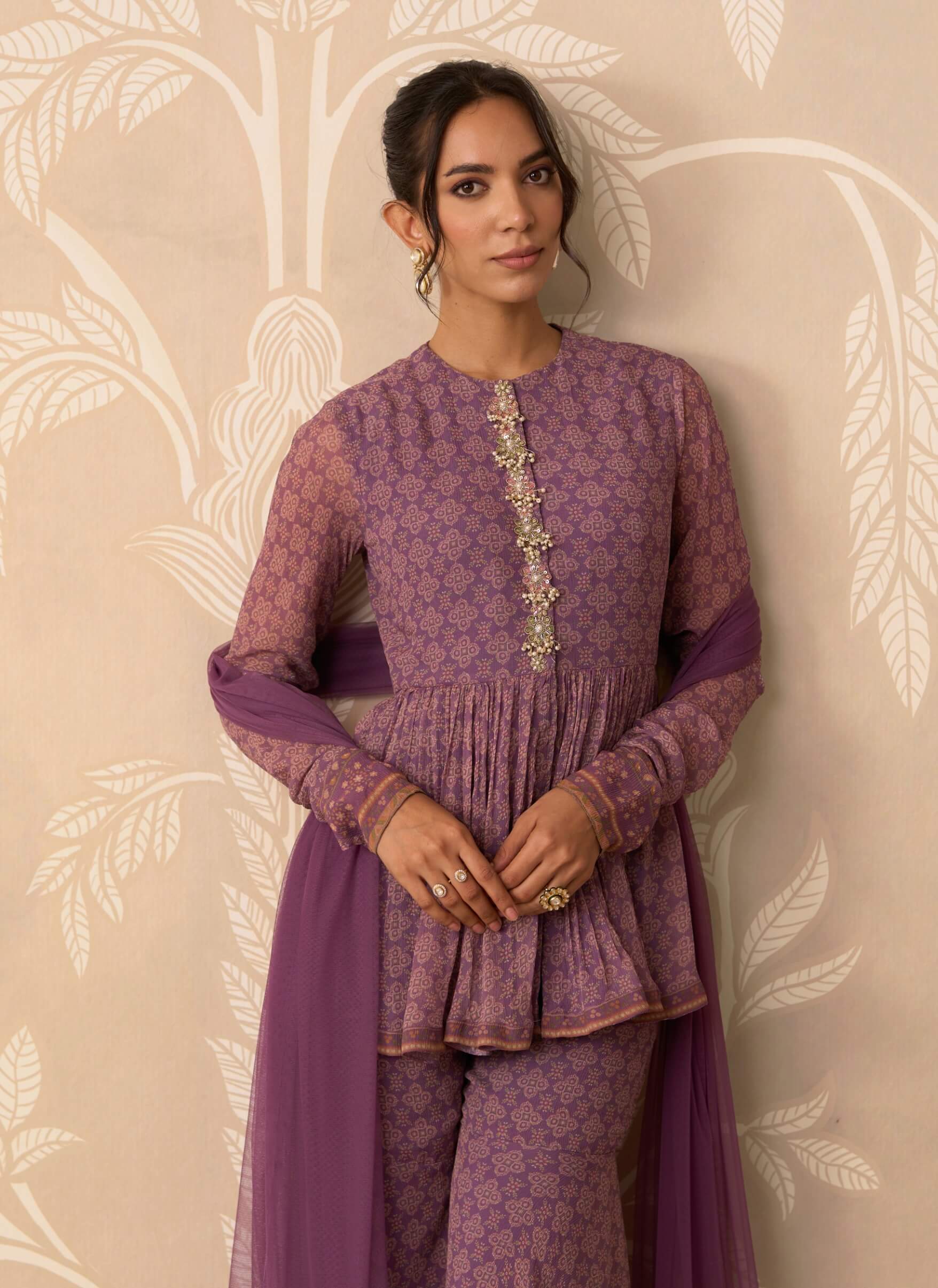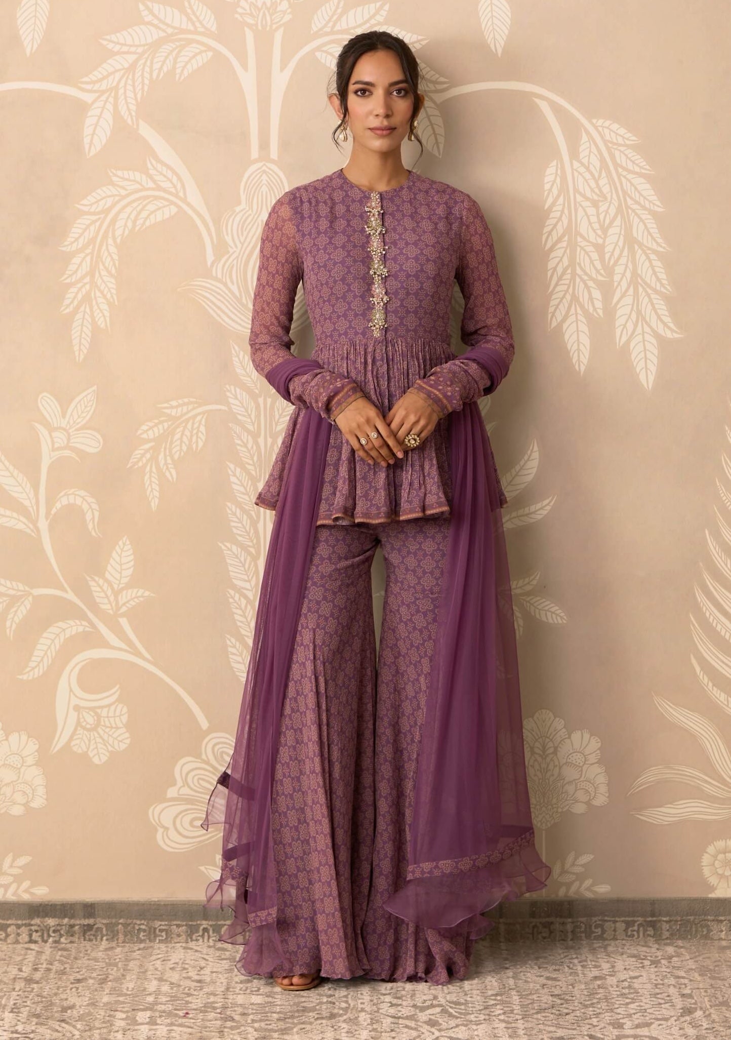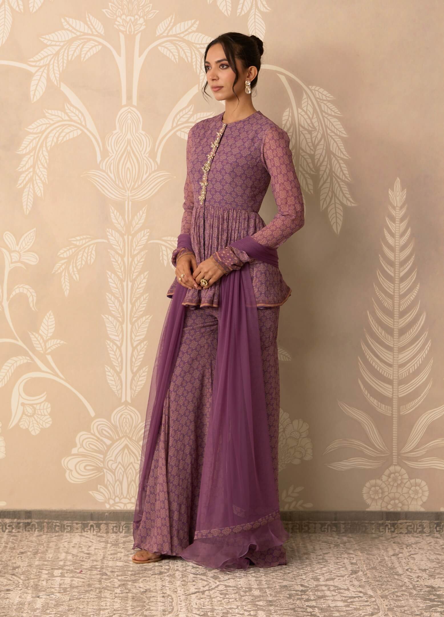 Delicate and expressive, this printed chiffon peplum and garara set with net dupatta is designed for festive days and elegant celebrations.