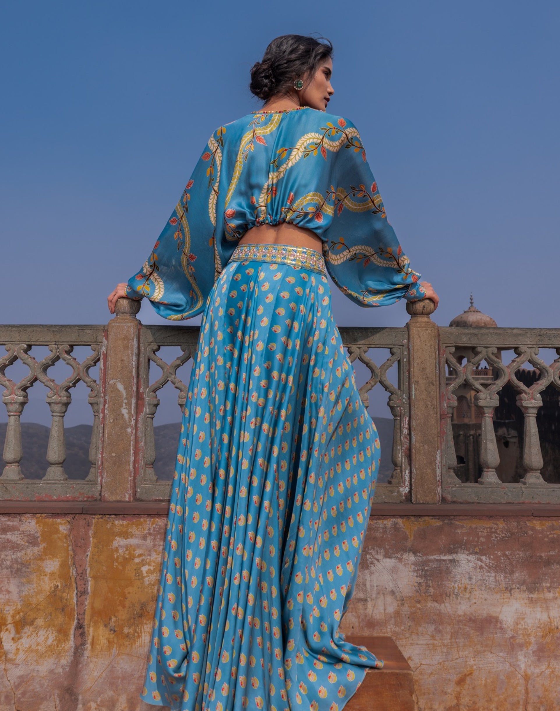 Rendered in serene mist blue, the kumari set offers effortless grace. Clean lines and subtle detailing define its charm. Ideal for intimate festivities, daytime celebrations, and elegant gatherings.