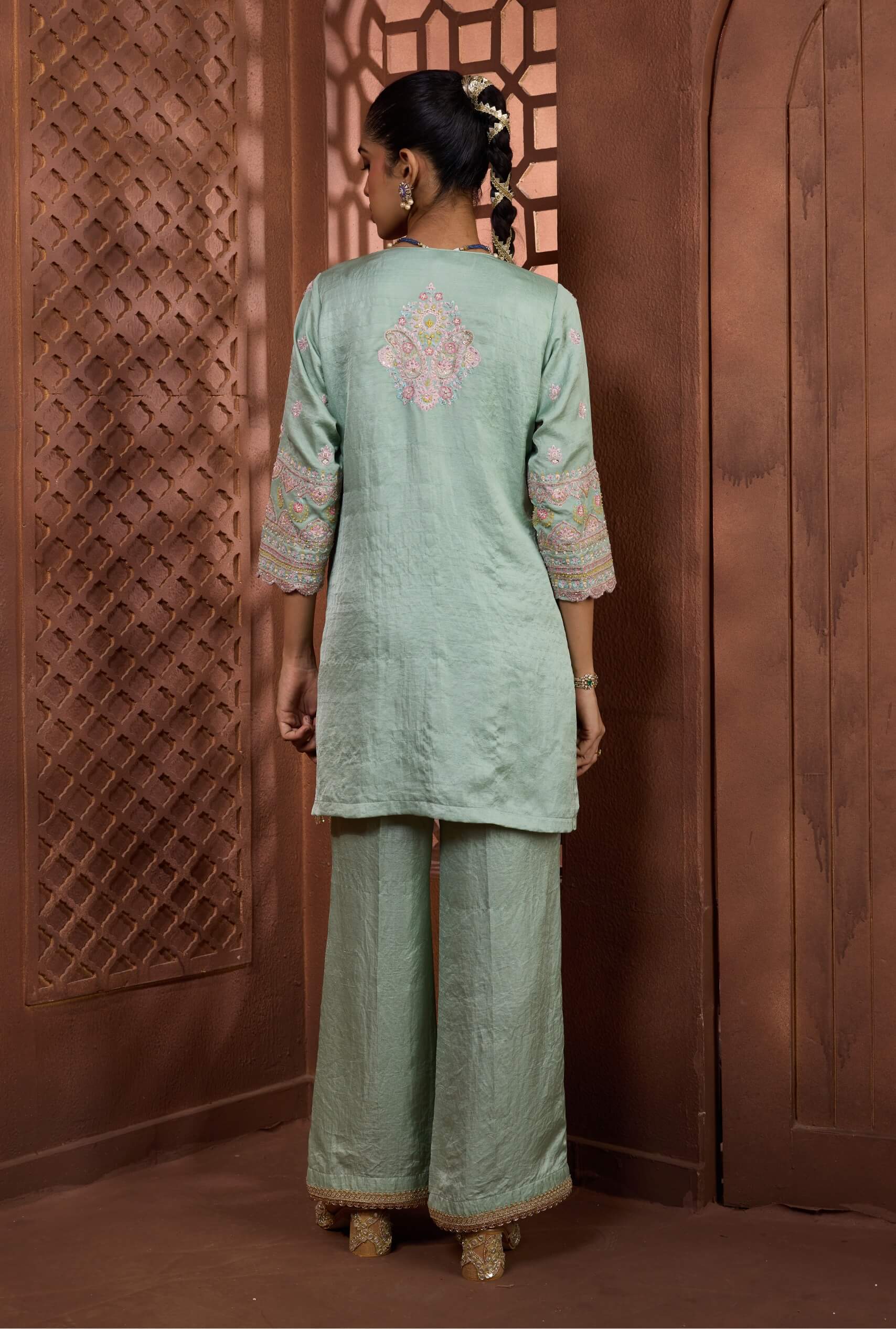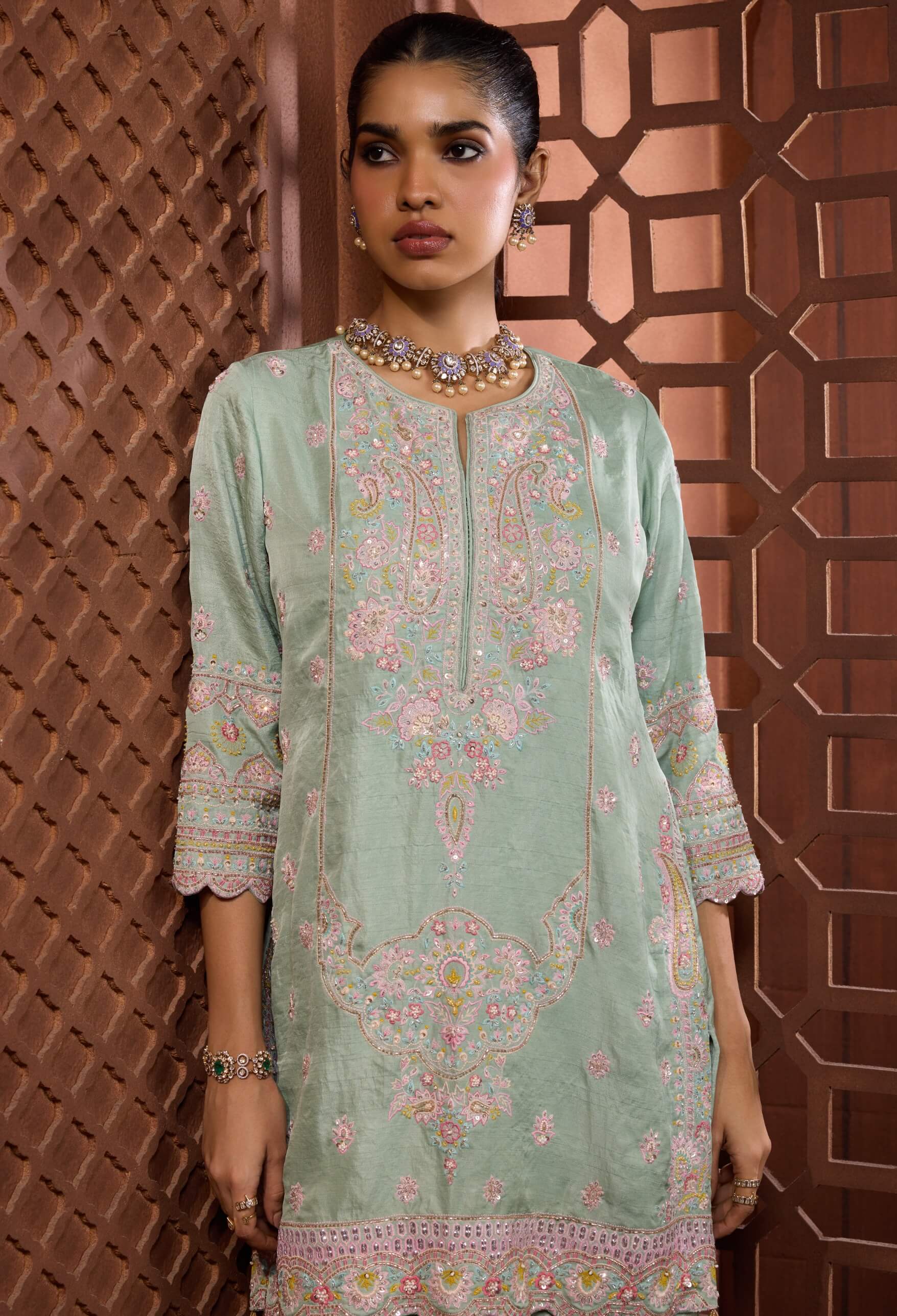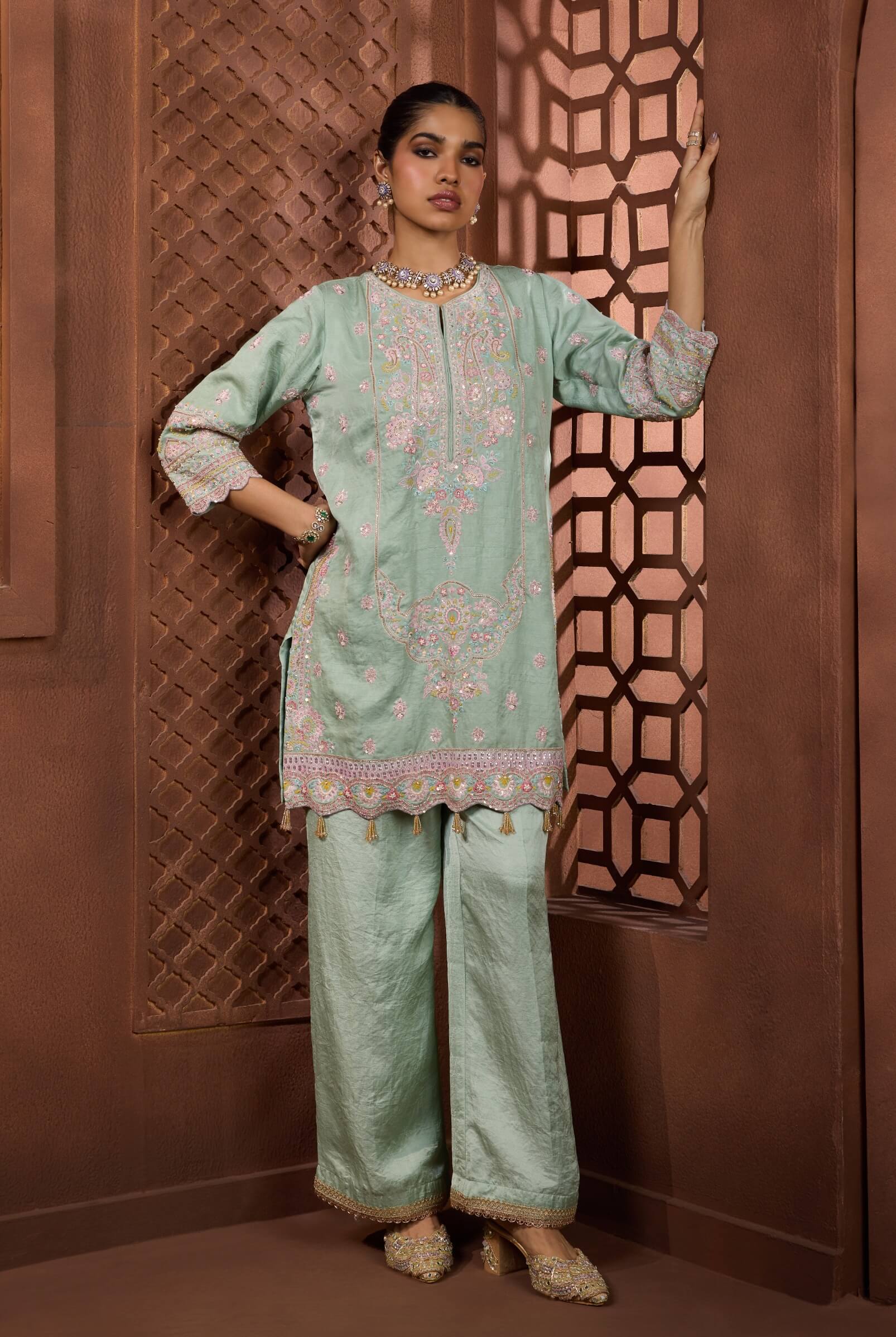 Fresh and celebratory with artisanal charm, the mridu manjari ensemble blooms in mint green silk. The mid-length kurta features pink and gold floral embroidery with a scalloped hem finished with playful tassels. Paired with straight salwar accented with delicate gold lace at the ankles, it feels refined yet joyful. Perfect for festive lunches and cultural gatherings.