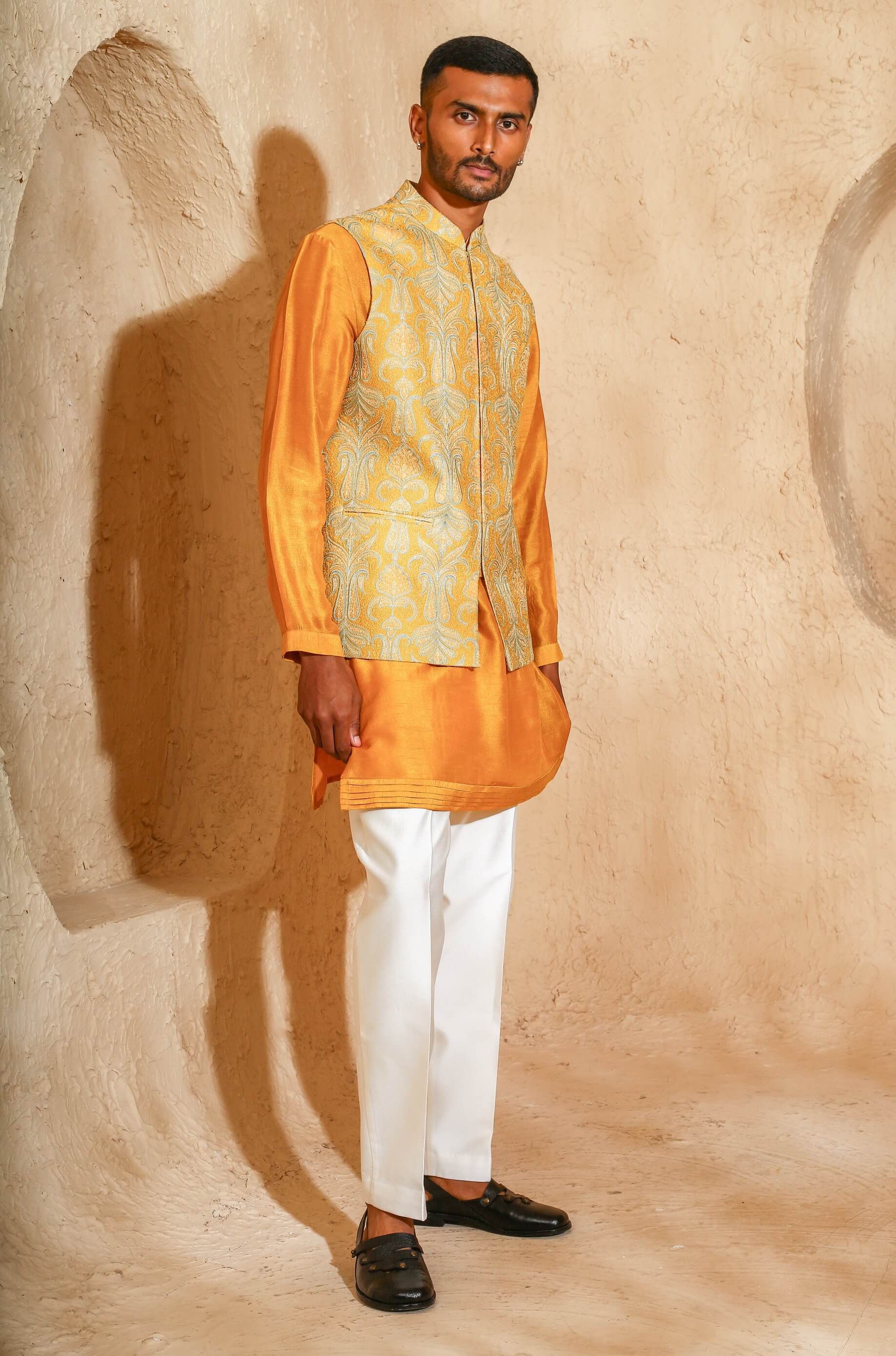 A striking festive ensemble, this mustard nehru jacket set is detailed with intricate embroidery and paired with a kurta. Tailored for elevated celebrations. Ideal for weddings and festive ceremonies.
