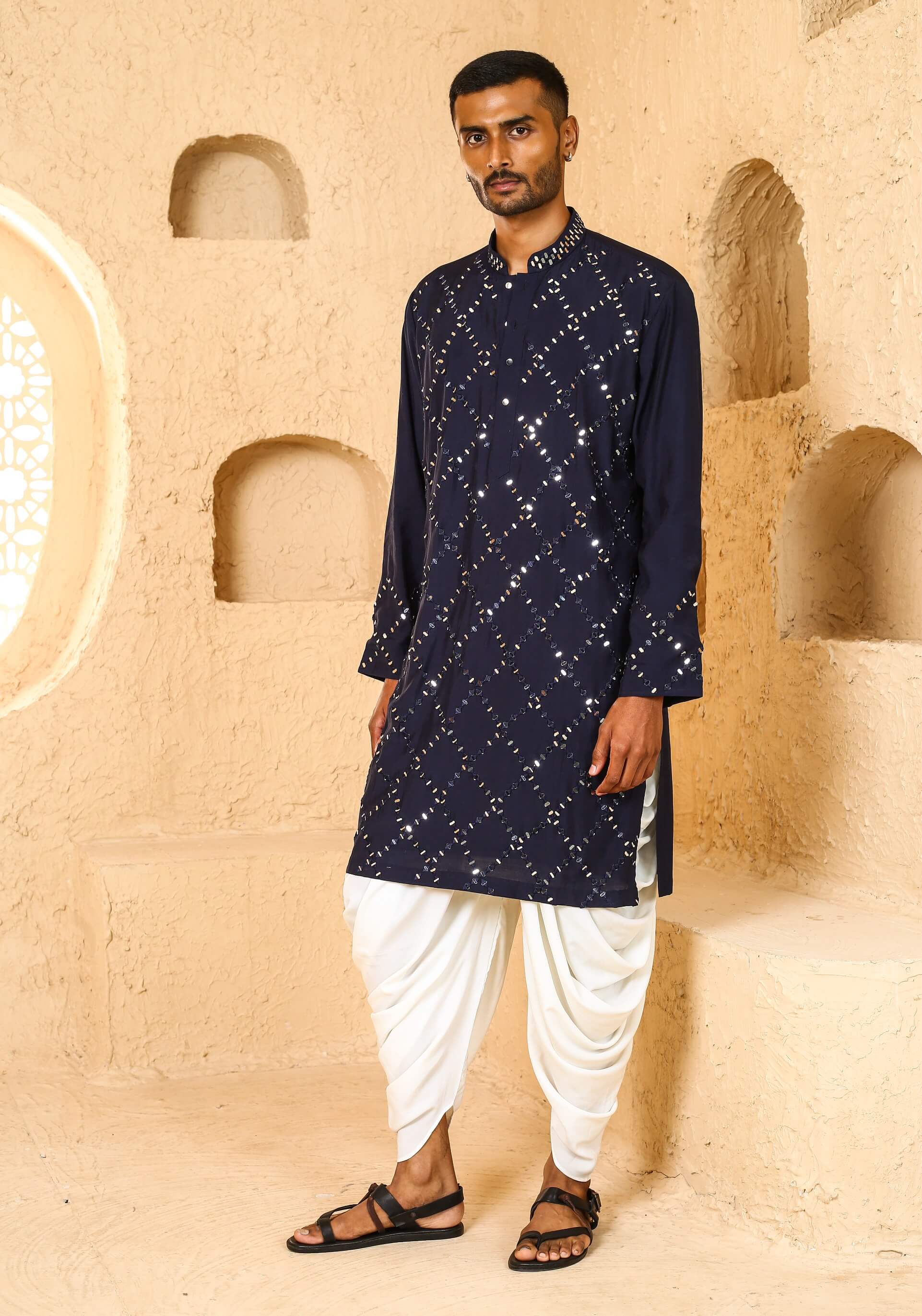A sophisticated festive essential, this navy kurta is adorned with refined mirror work accents. The deep hue enhances its evening appeal. Ideal for sangeets, festive dinners, and celebration nights.