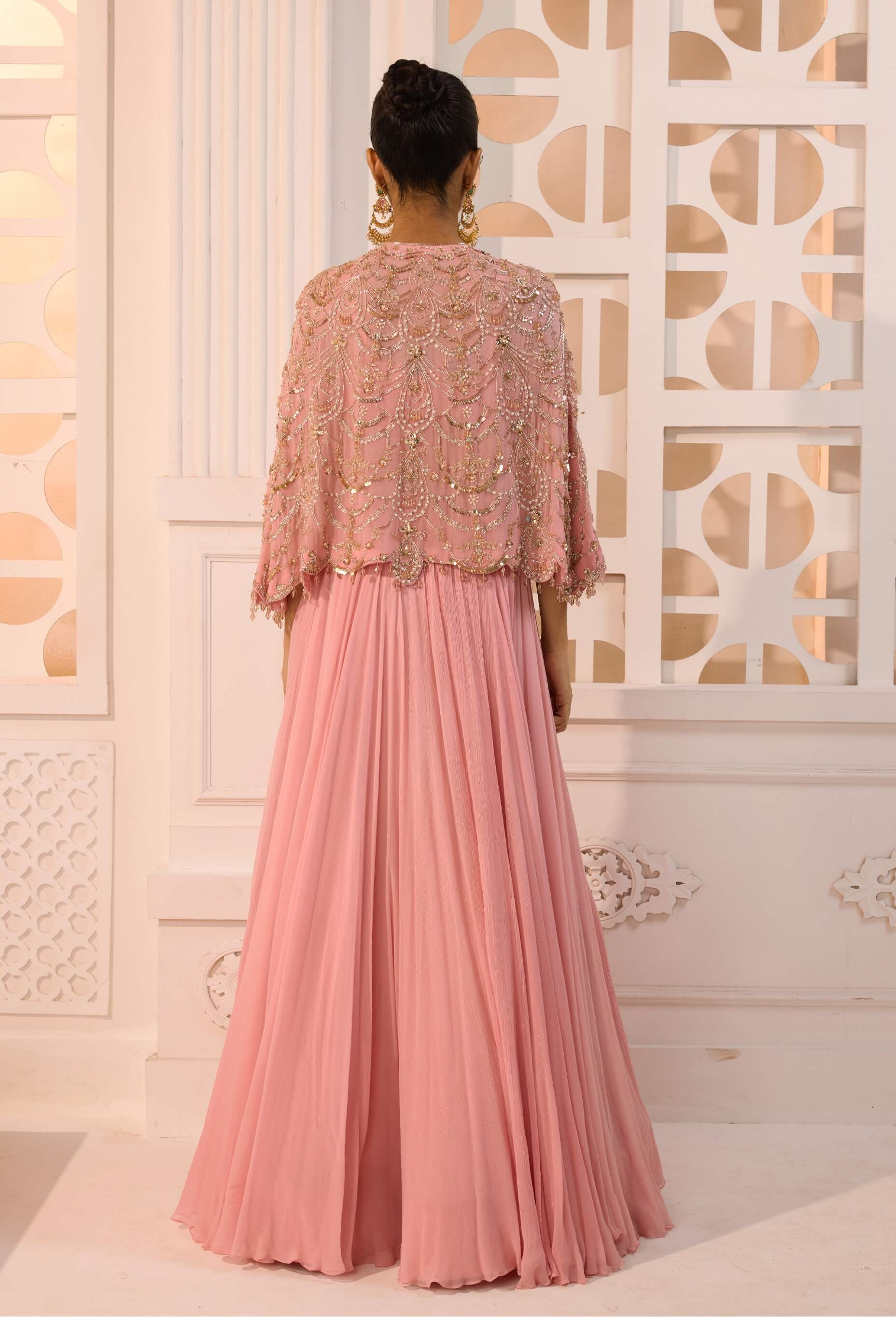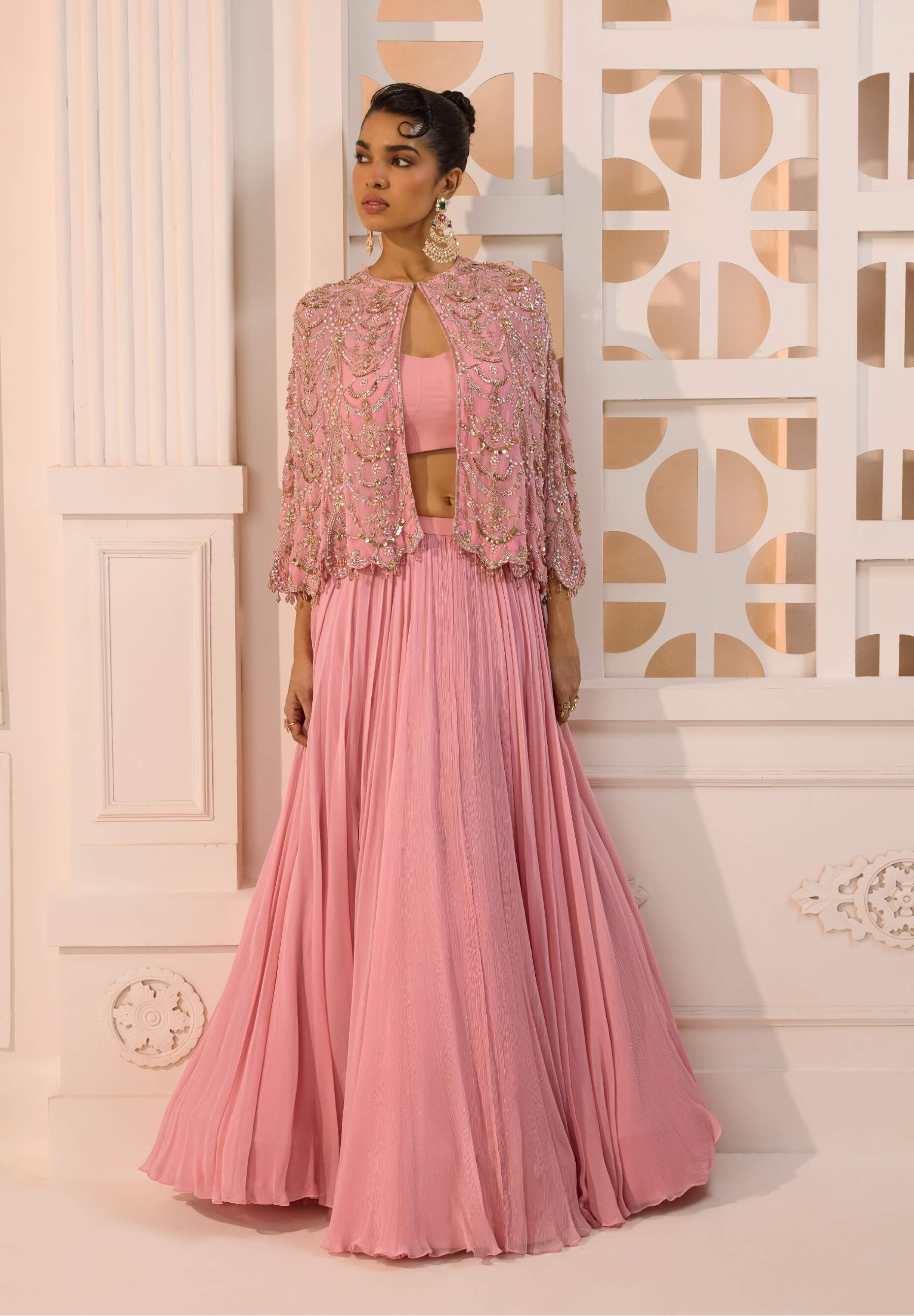 Ethereal and fashion-forward, the nayantara cape ensemble embodies modern femininity in rose hues. Featuring a floor-sweeping chiffon skirt paired with a structured bustier and a hand-embroidered cape detailed with pearls, crystals, sequins, and bugle beads. Light, fluid, and dramatic in motion. Perfect for festive nights and statement celebrations.