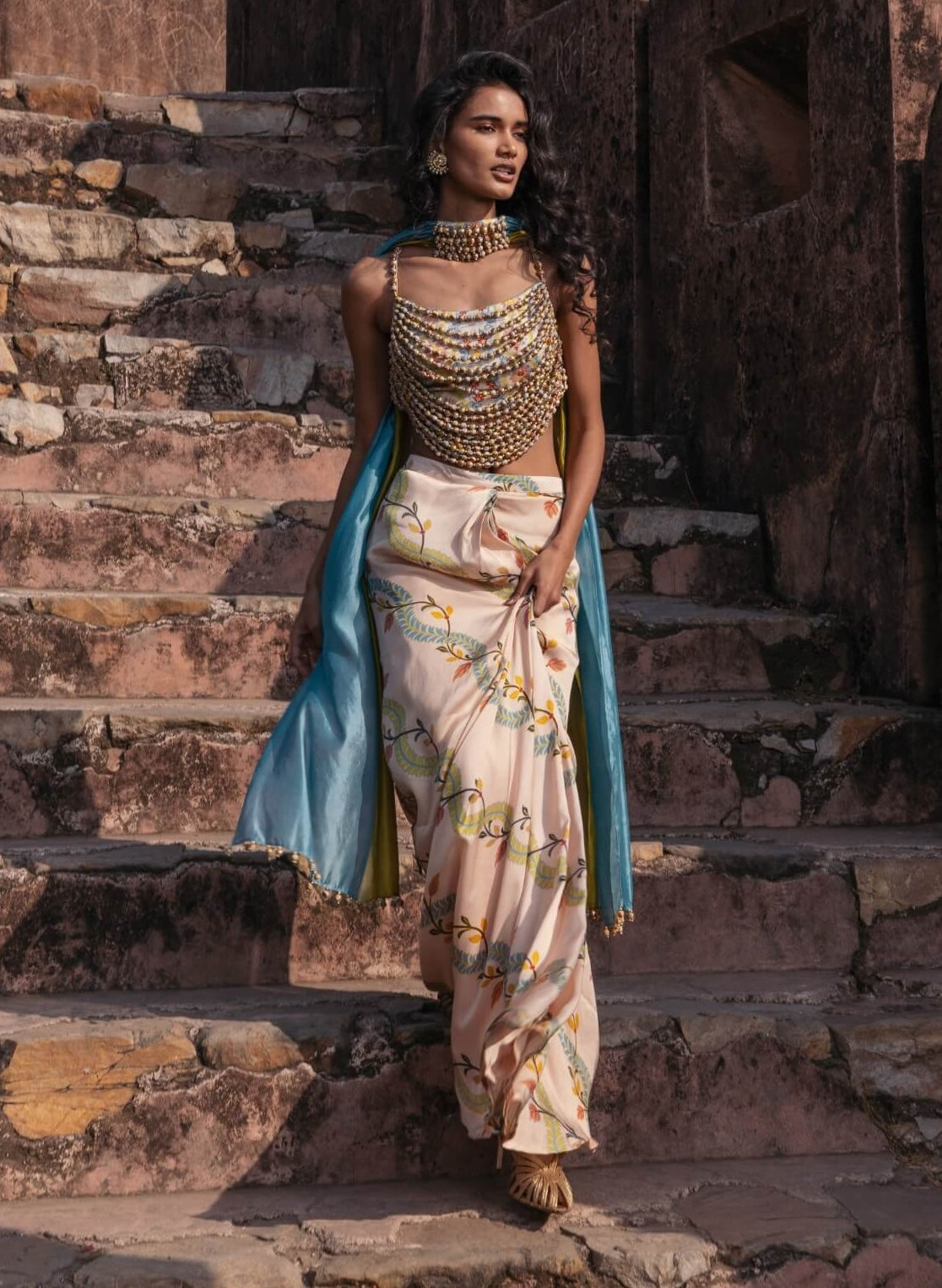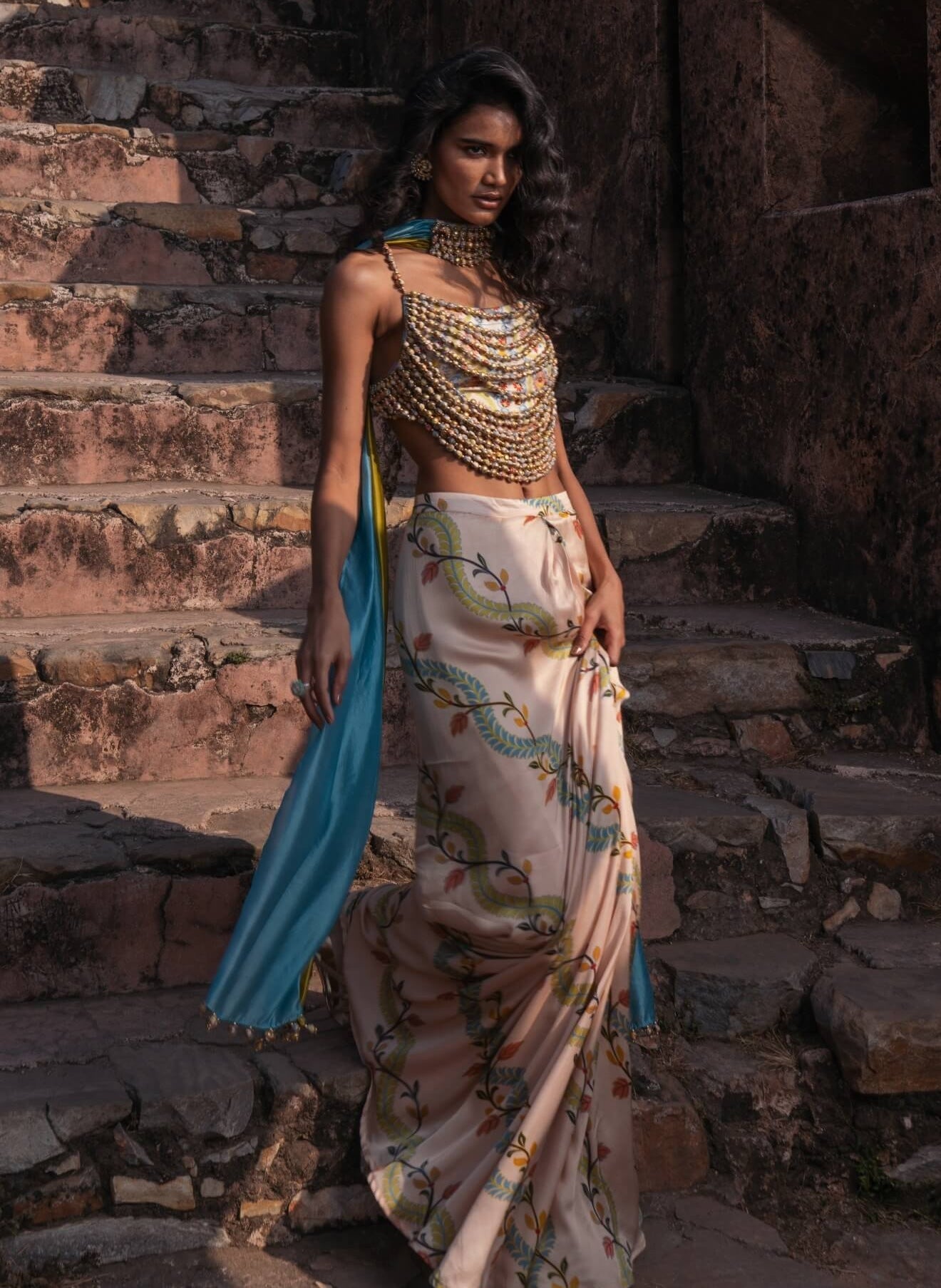 A modern drape skirt set in buttercup, mist blue, and dry henna hues, designed with fluid elegance. Perfect for mehendi celebrations and destination weddings.
