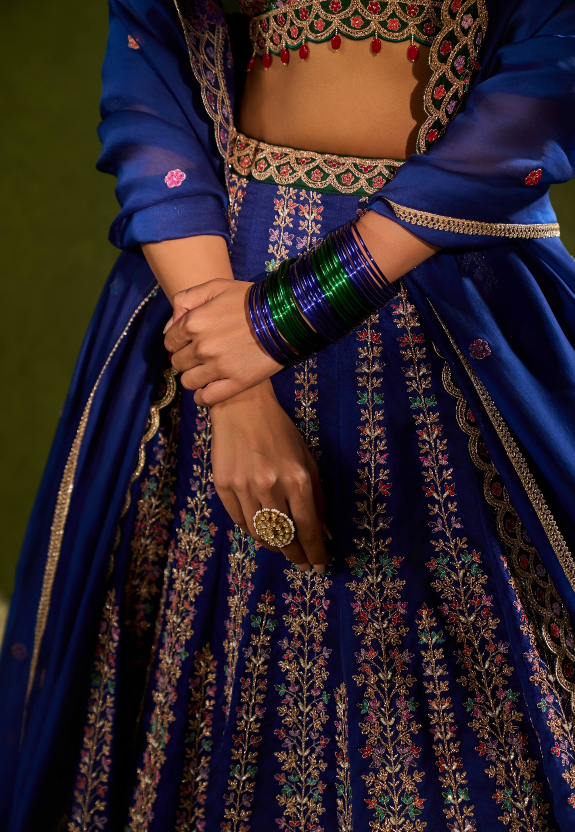 Artfully scalloped and richly detailed, this blue and green soft silk lehenga is embellished with vibrant resham, zari, pearls, and sequence work, in a graceful scallop pattern paired with a green, intricately embroidered plunging-neck blouse and a sheer blue organza dupatta adorned with delicate embroidered green appliqué. Designed for refined glamour. Perfect for weddings and sangeet celebrations.