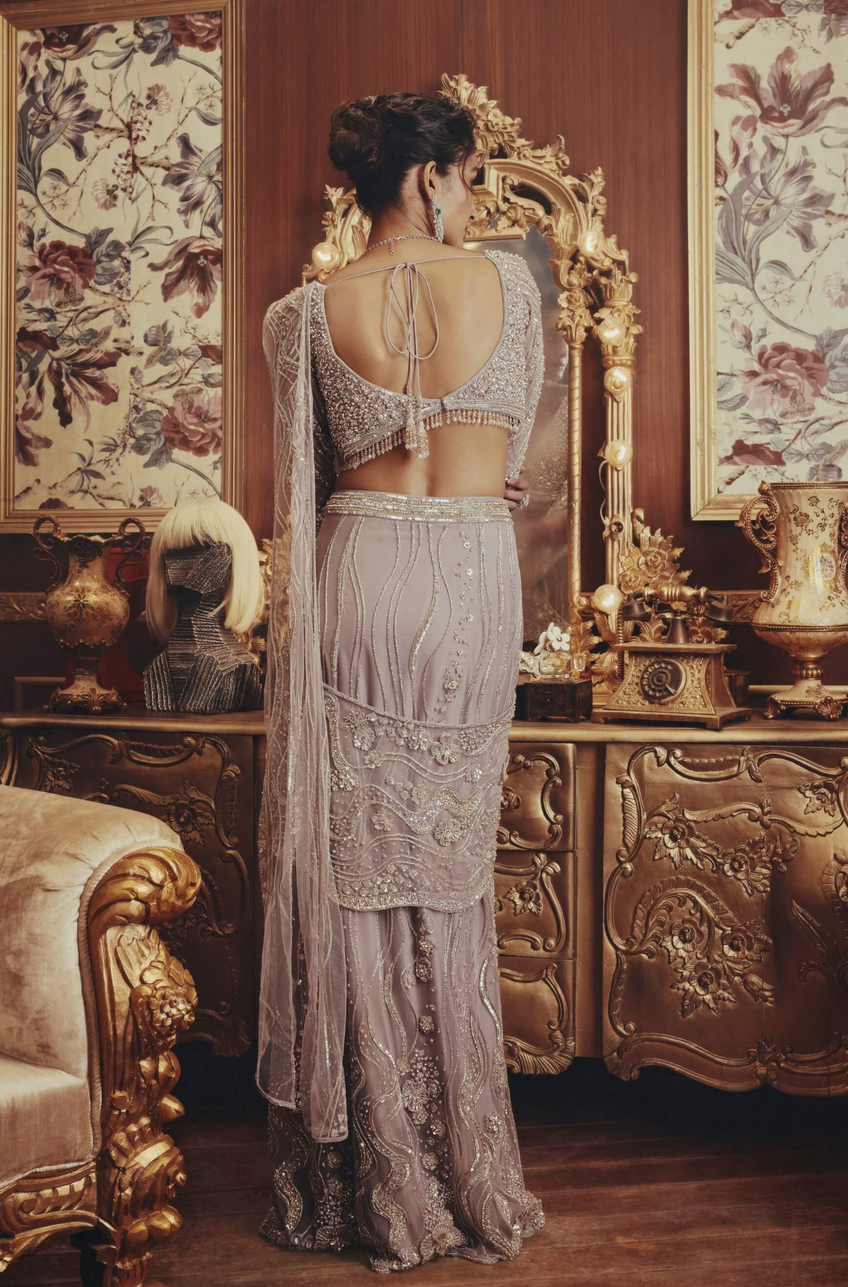 Delicate stylised luxury defines this lilac grey drape sari adorned with intricate beadwork and sequins across a sculpted blouse. Vertical embellishments elongate the silhouette while floral motifs soften the design. Perfect for cocktail evenings, receptions, and glamorous festivities.