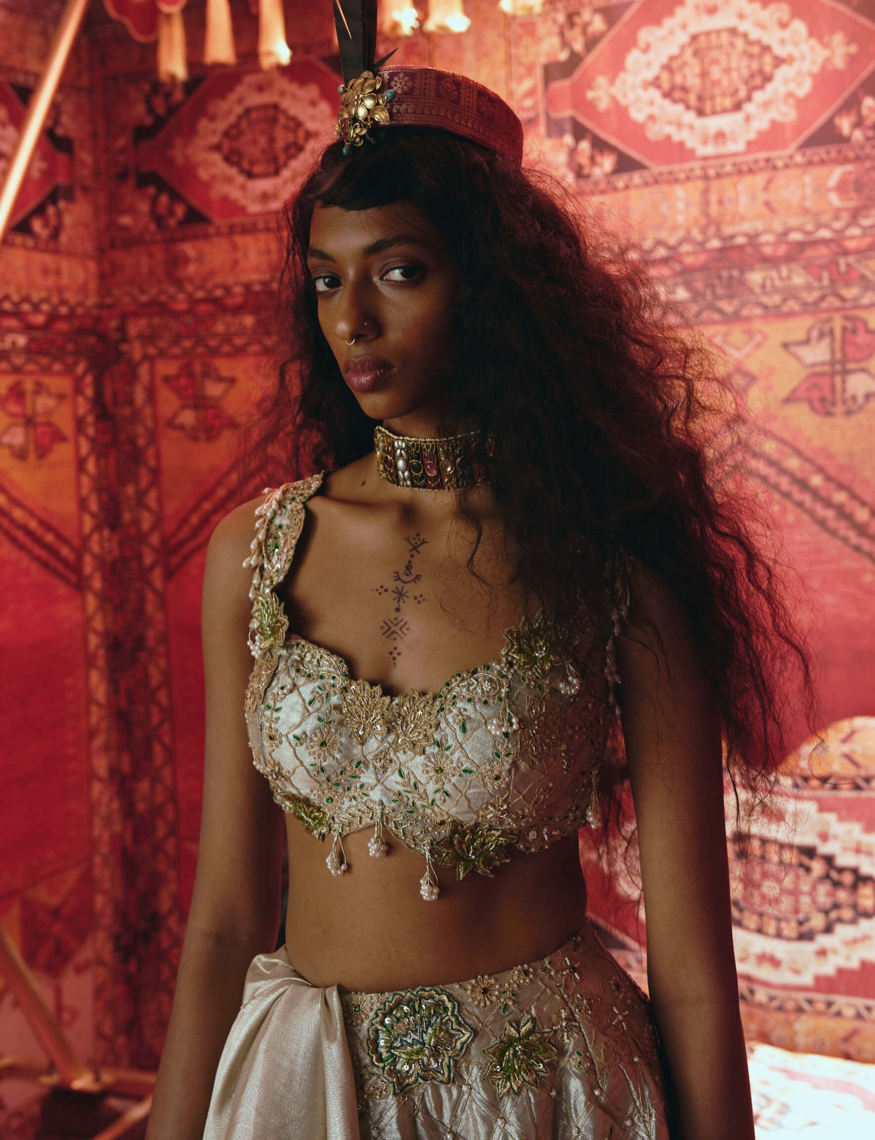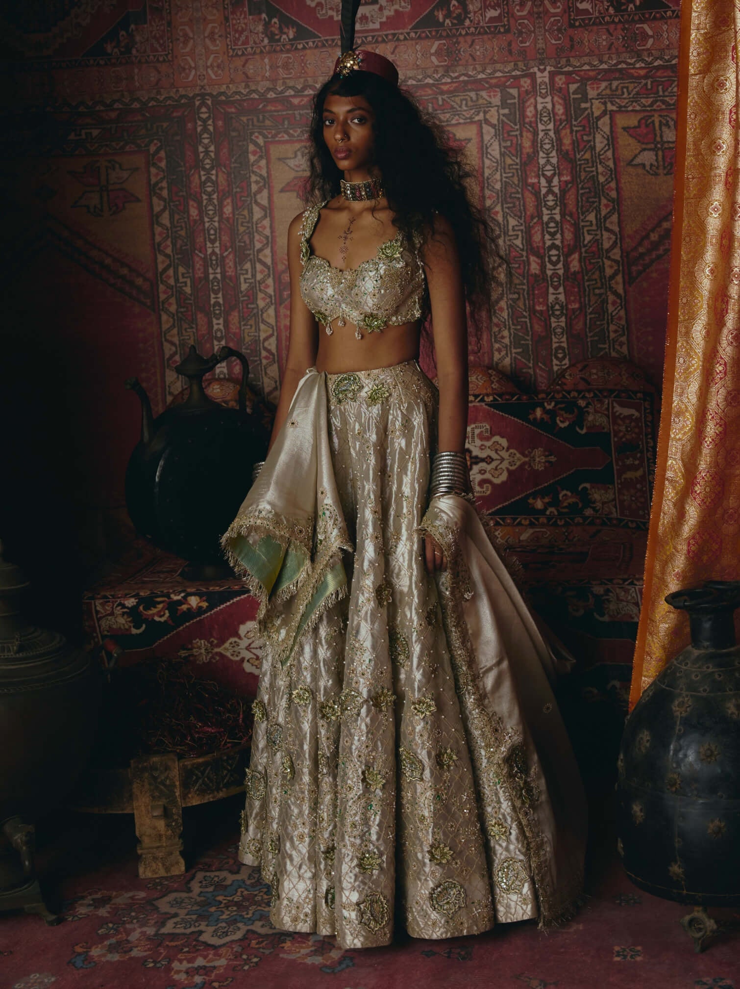 Crafted in pearl-gold pure tissue, this lehenga set showcases intricate floral and chatai textures enhanced with delicate 3D flower embellishments. The richly embroidered lehenga is adorned with 3D florals and structured with a can-can flare for elegant volume. Paired with an embroidered blouse accented with playful latkans and a dupatta detailed with pearls, stones, and textured motifs.