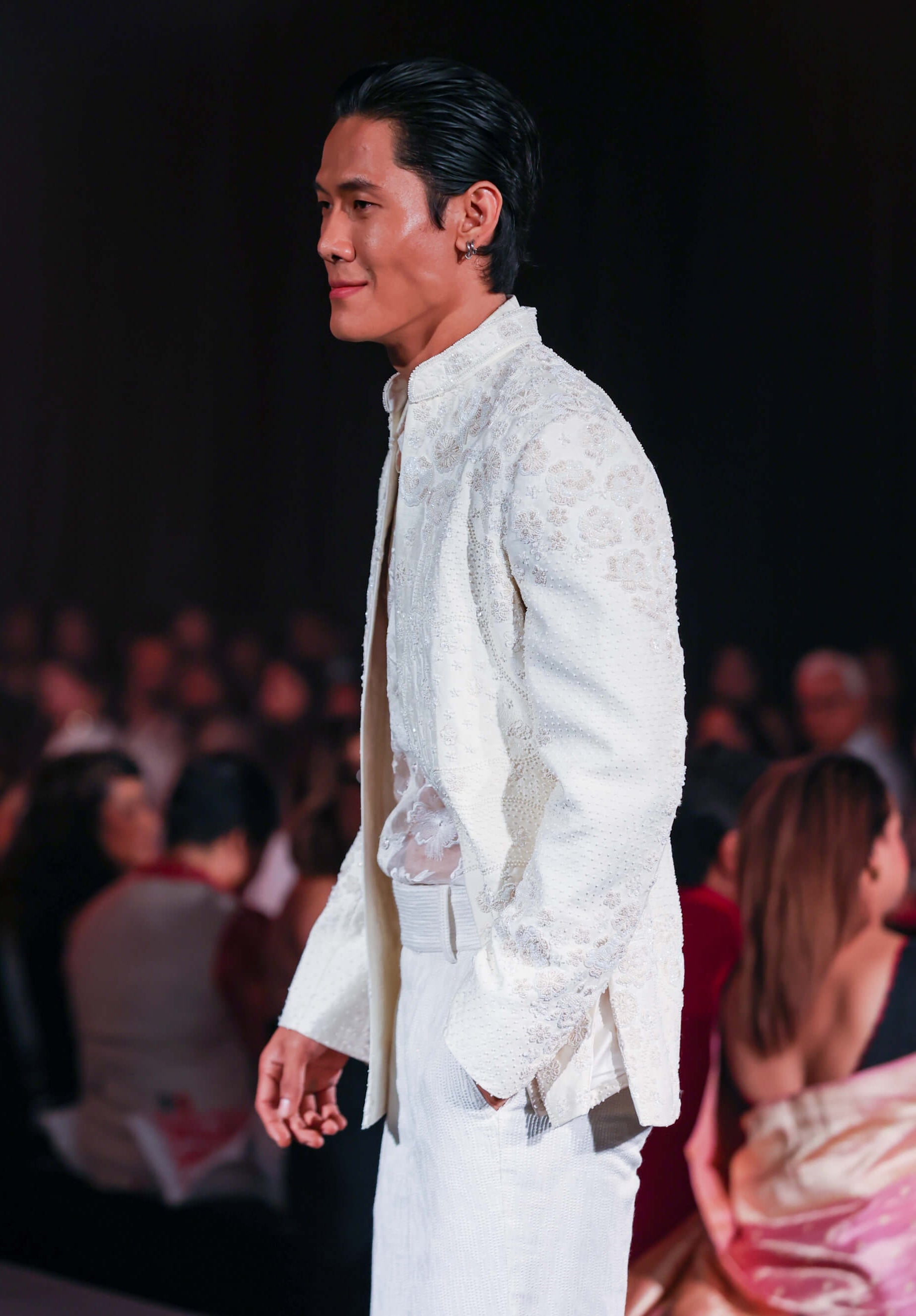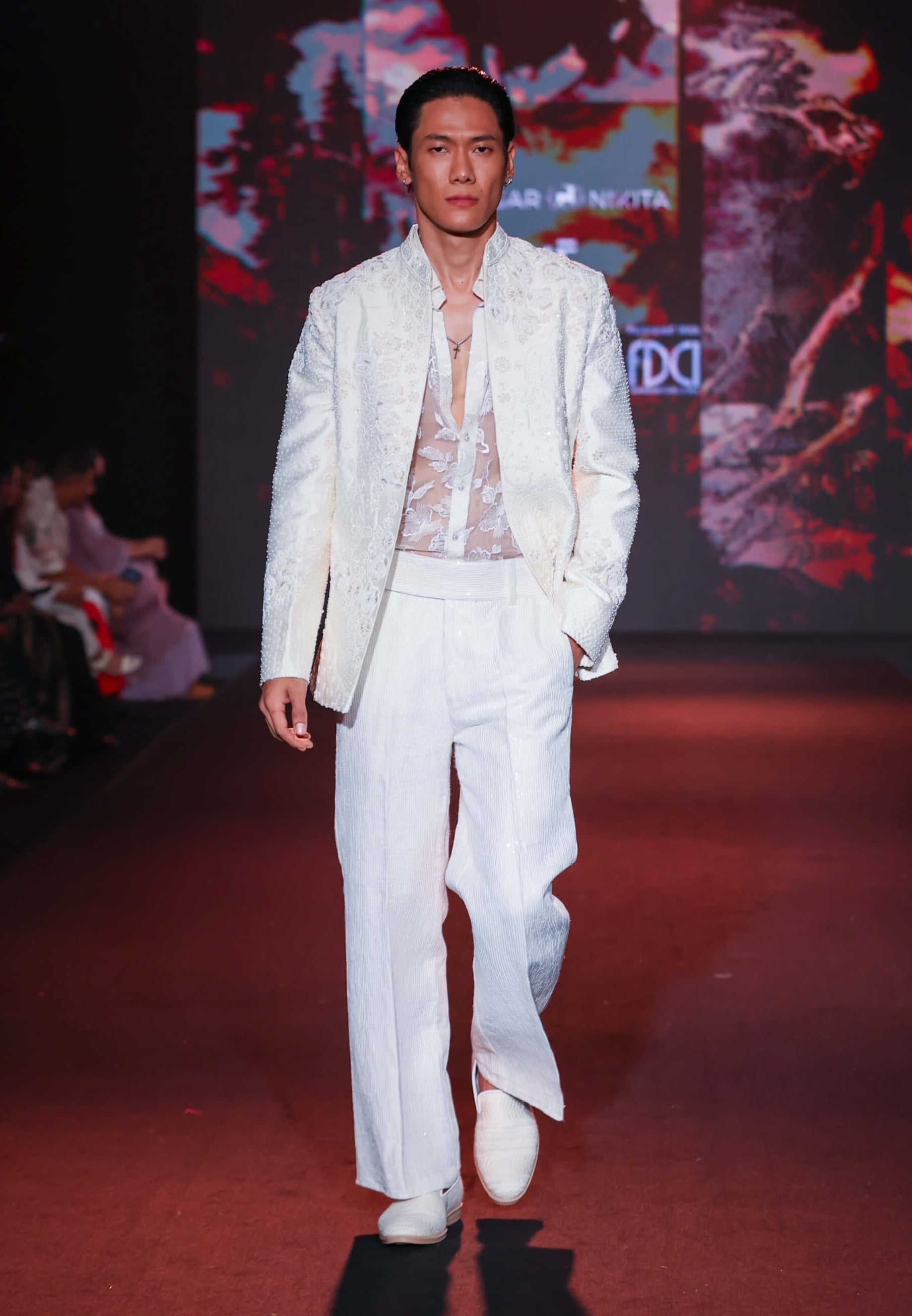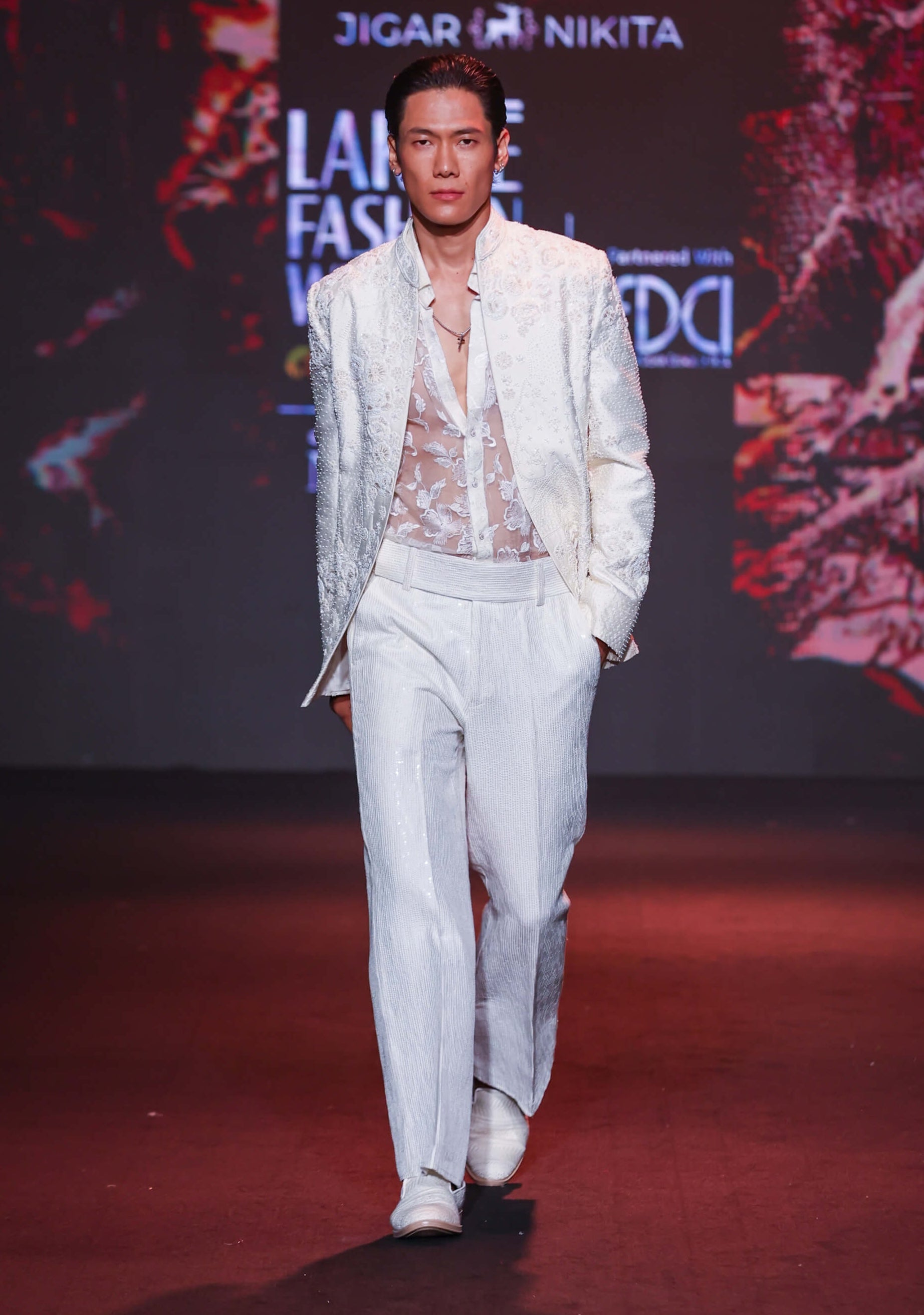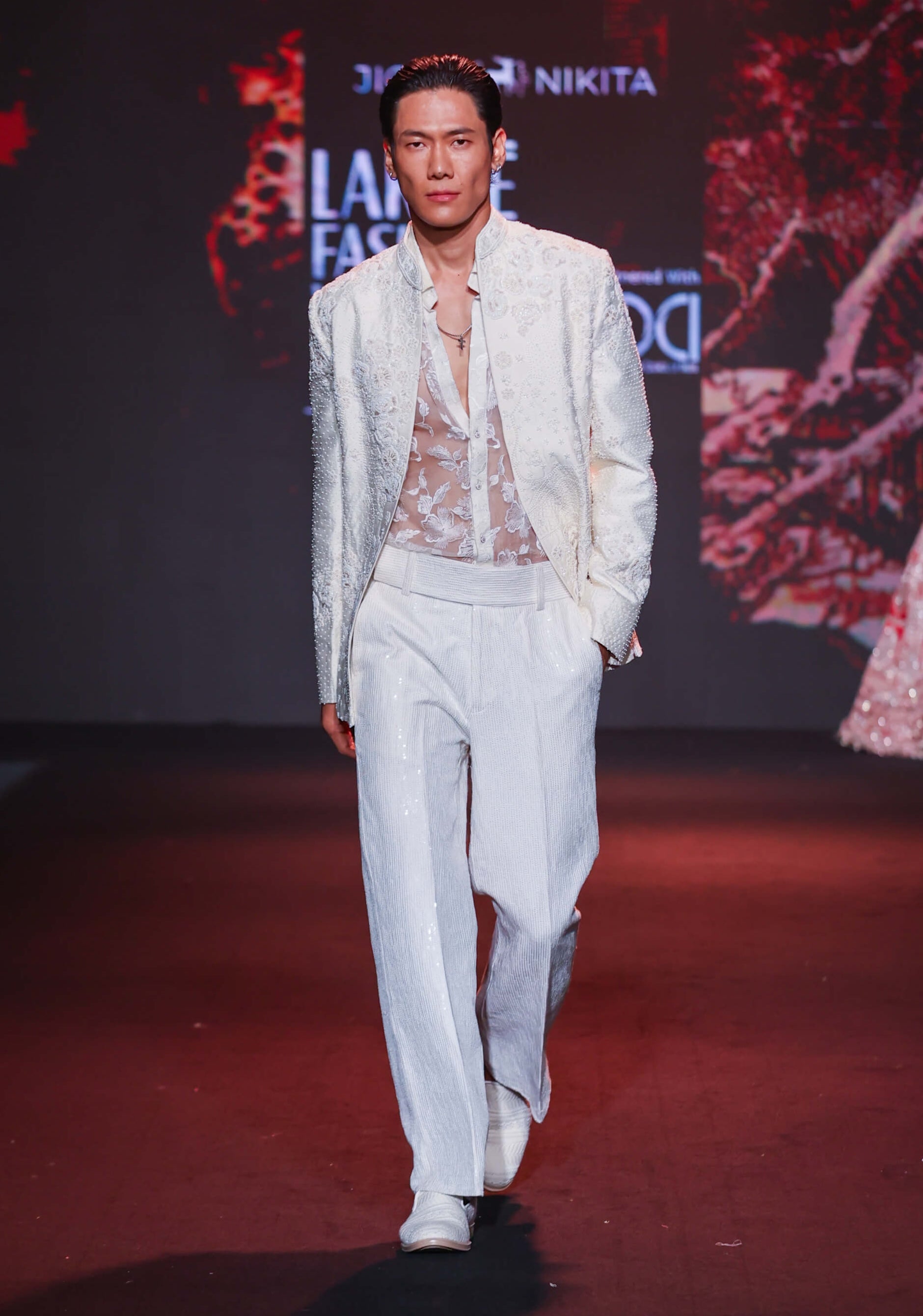 A modern menswear ensemble featuring a short open jacket paired with a sheer embroidered shirt and subtly sequinned trousers. Delicate floral threadwork adds refined detail and youthful charm.