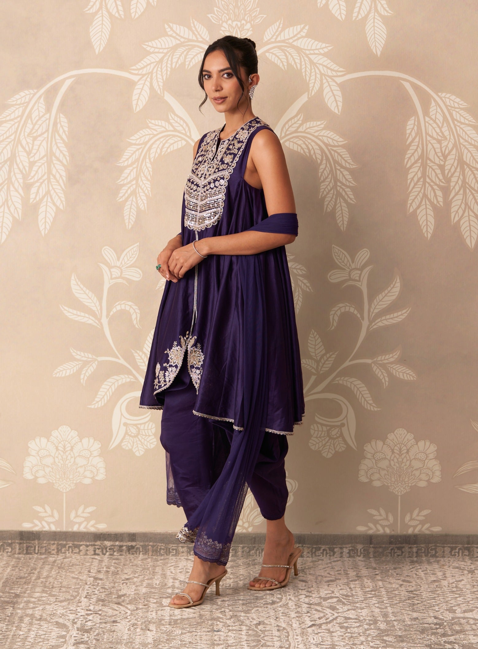 Deeply elegant, this chanderi embroidered kali kurta with drape salwar and net dupatta is ideal for evening functions and celebrations.
