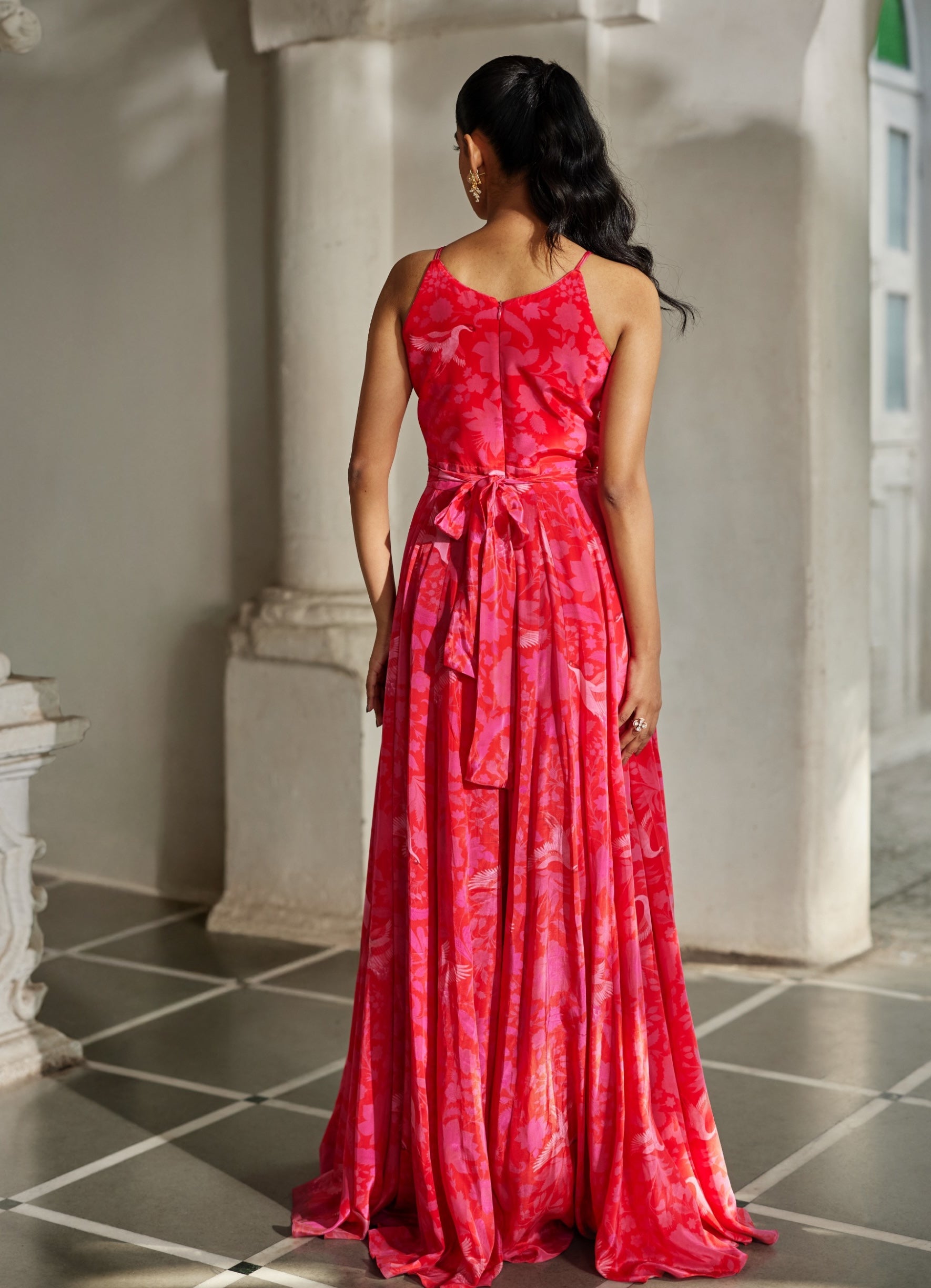 Flowing and expressive, this red jumpsuit showcases mono prints with bird motifs and a delicately hand-embroidered yoke in luxurious crepe.