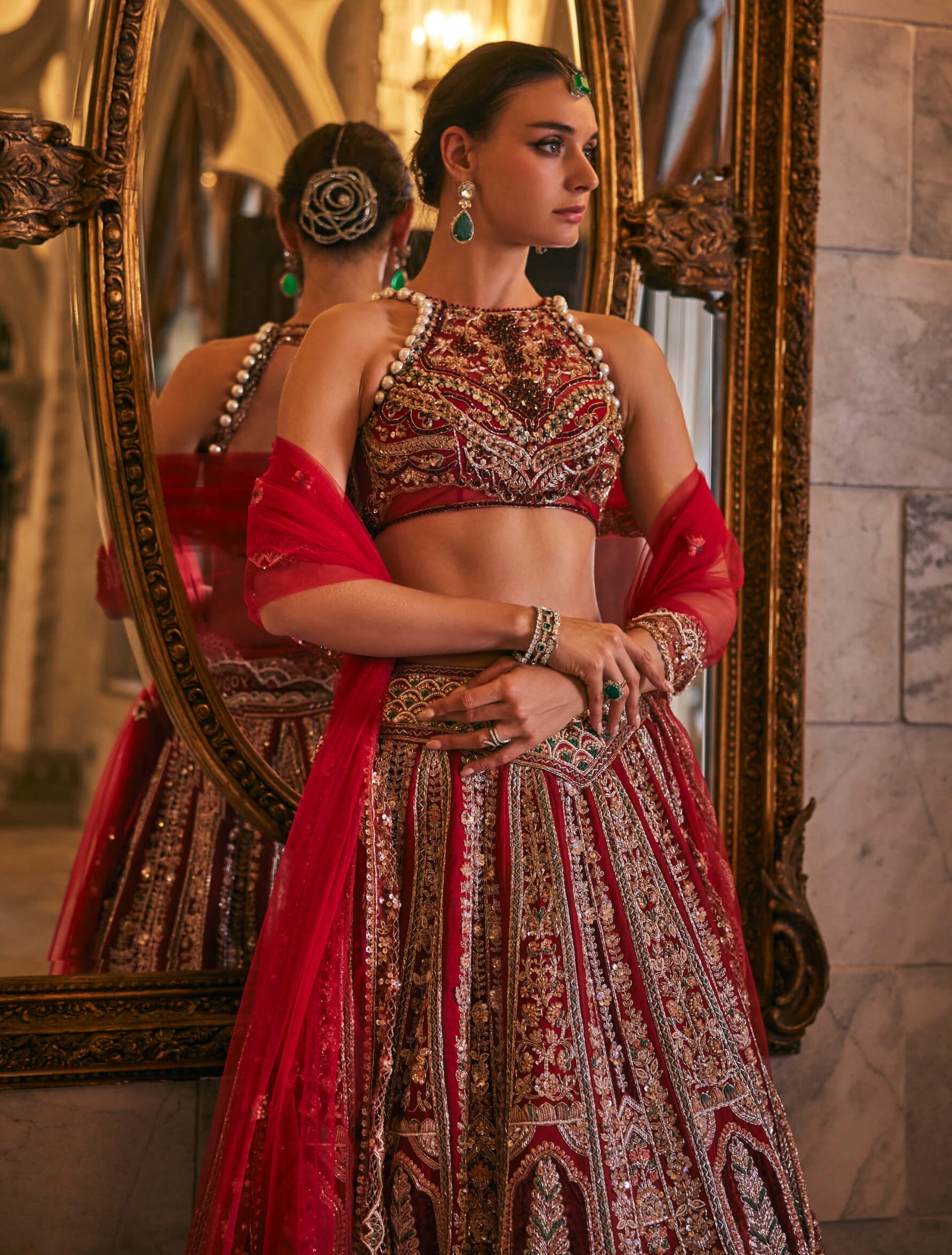 Drenched in royal red with maroon velvet appliqué, this habutai silk lehenga showcases intricate Rajwadi hand embroidery. The net blouse is highlighted with crystal and pearl accents, while the sheer net dupatta adds softness. Finished with a playful back belt inscribed “Love me like you do,” this ensemble is ideal for bridal ceremonies and grand wedding celebrations.