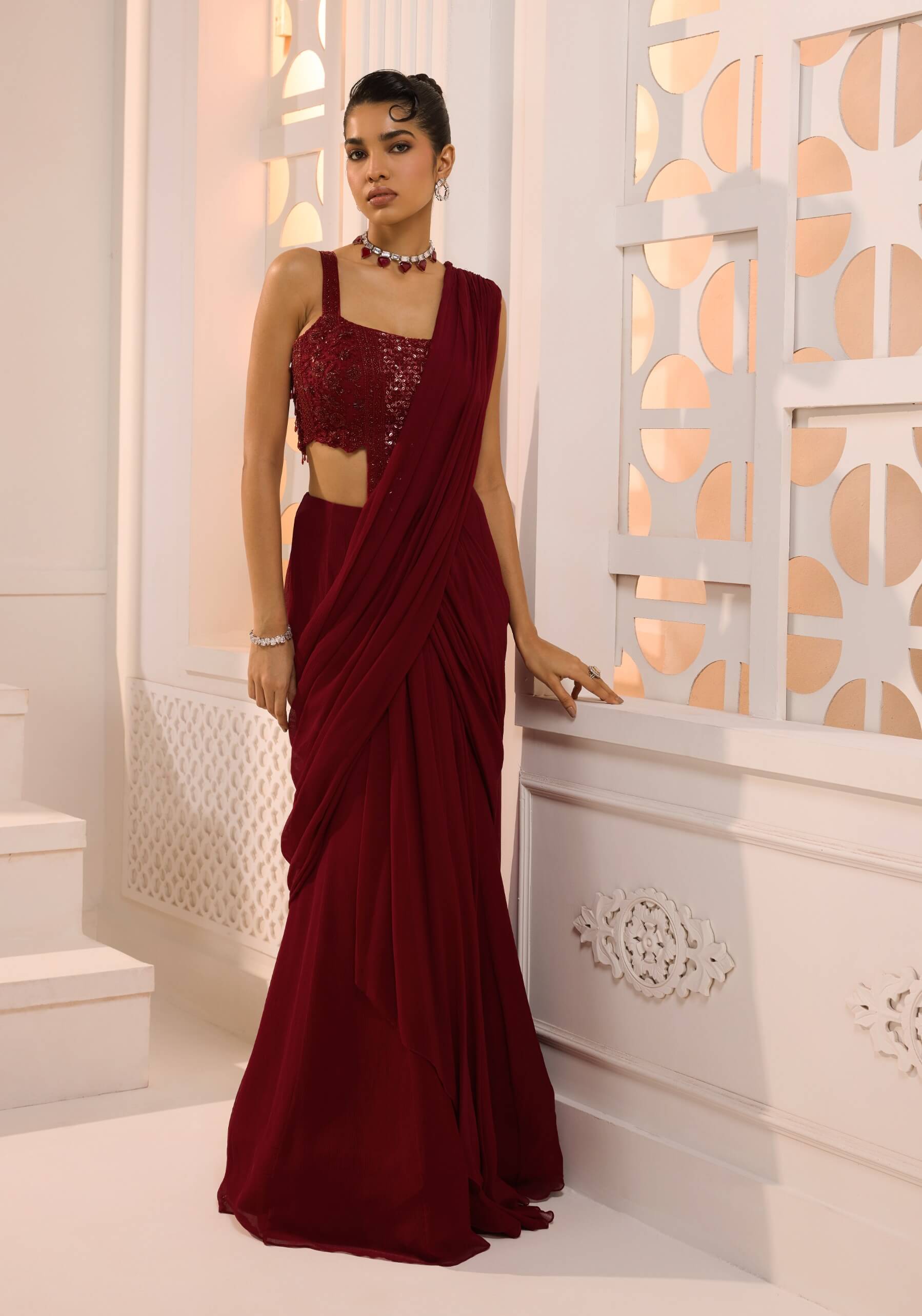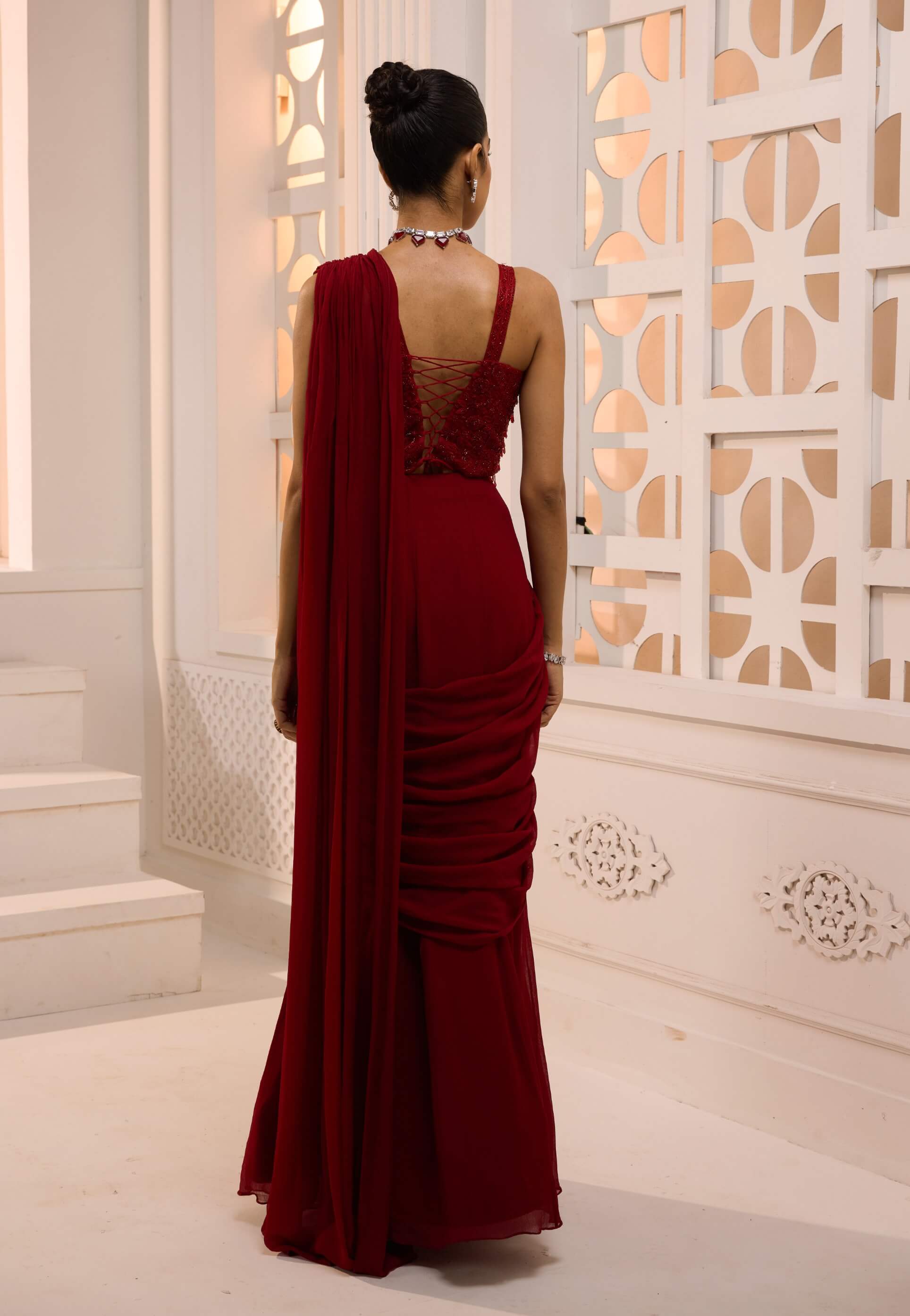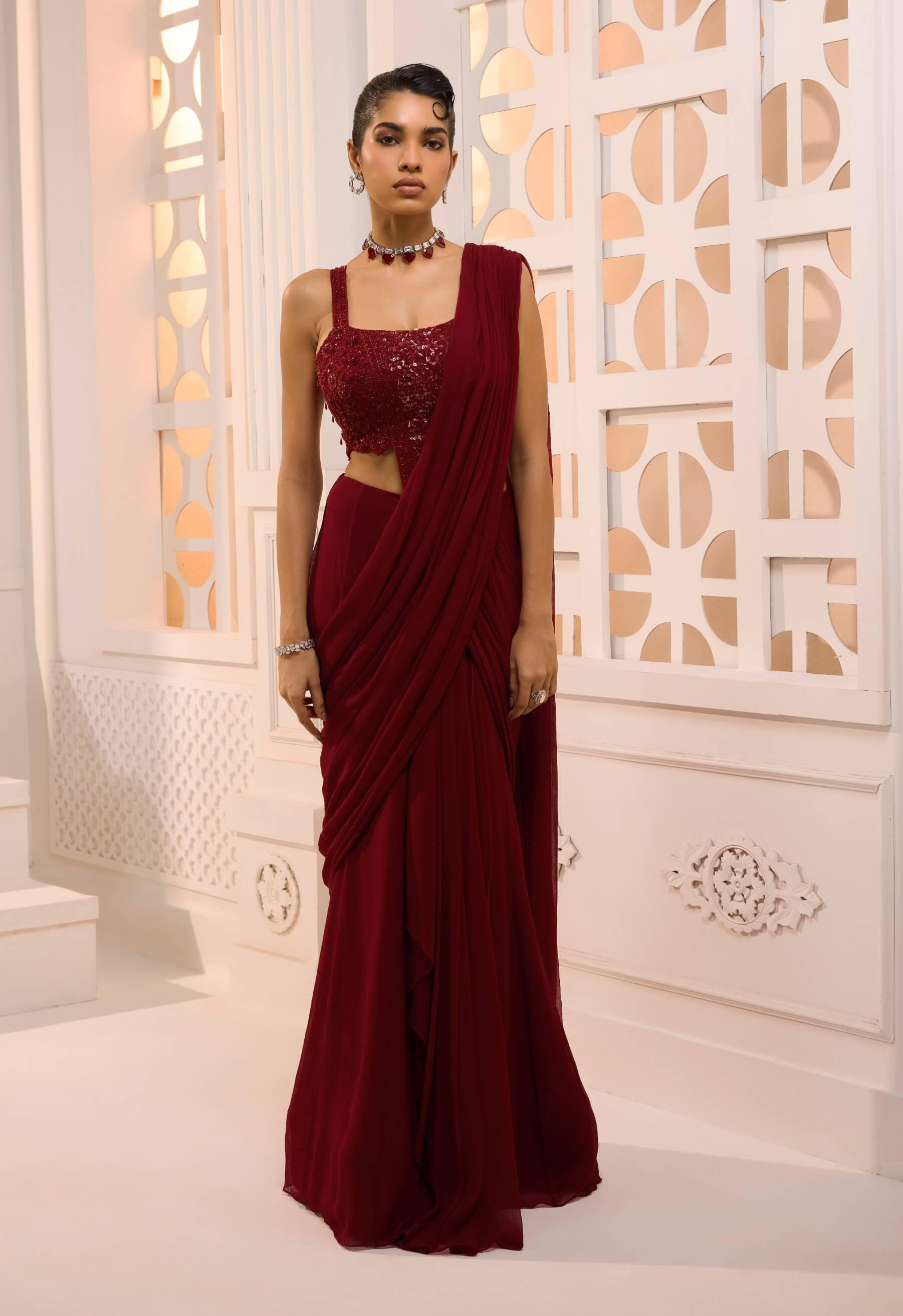 An ode to timeless allure drenched in deep ruby hues, the ruhani ruby drape sari is designed to command attention effortlessly. The fluid chiffon drape is paired with an intricately embellished organza blouse that adds refined sparkle. Crafted to flatter the silhouette with graceful movement and modern glamour. Perfect for wedding receptions, evening soirees, and celebratory festivities.