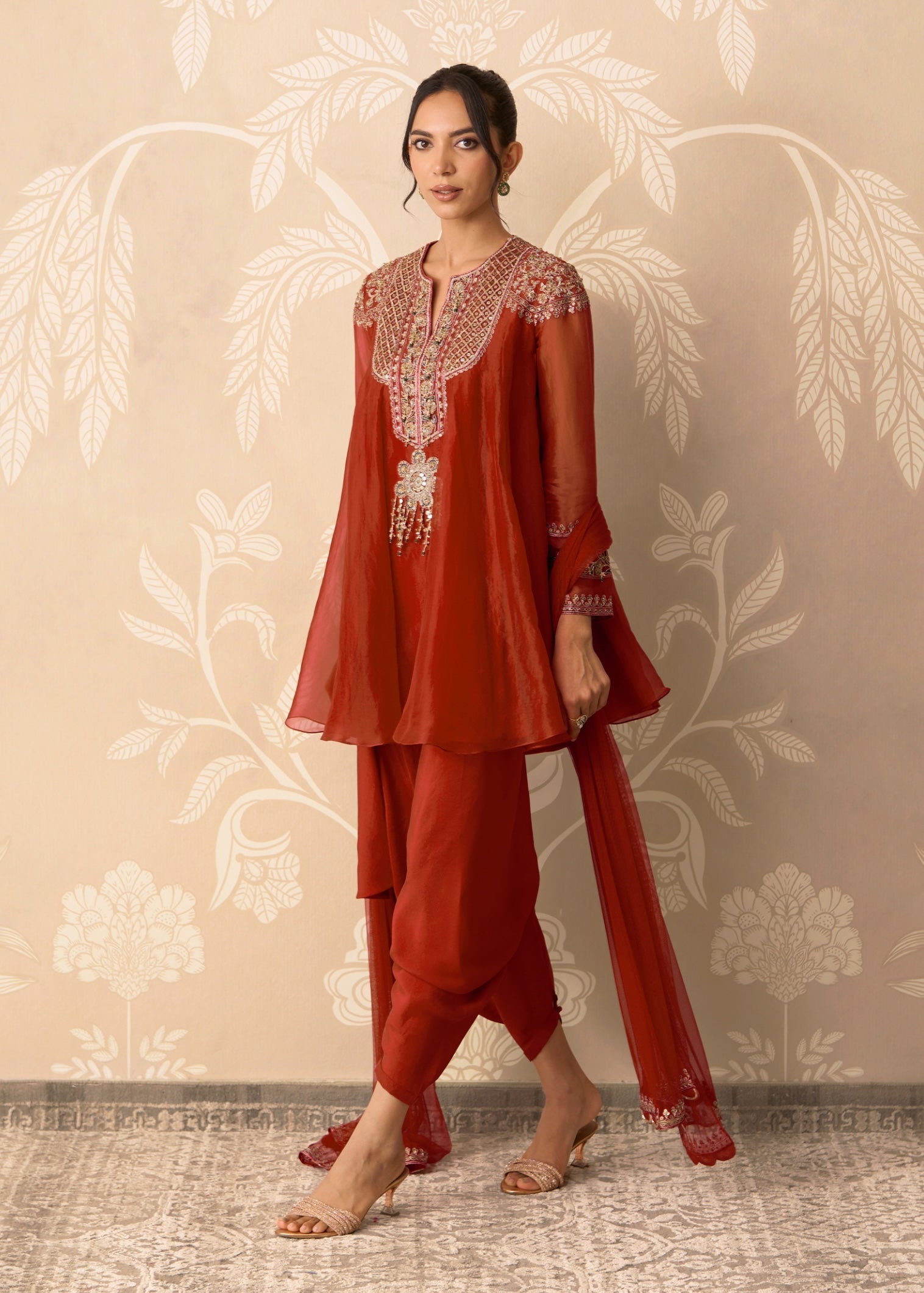 Warm and festive, this organza embroidered flared kurta paired with a silk draped salwar and net dupatta is perfect for wedding functions and evening celebrations.