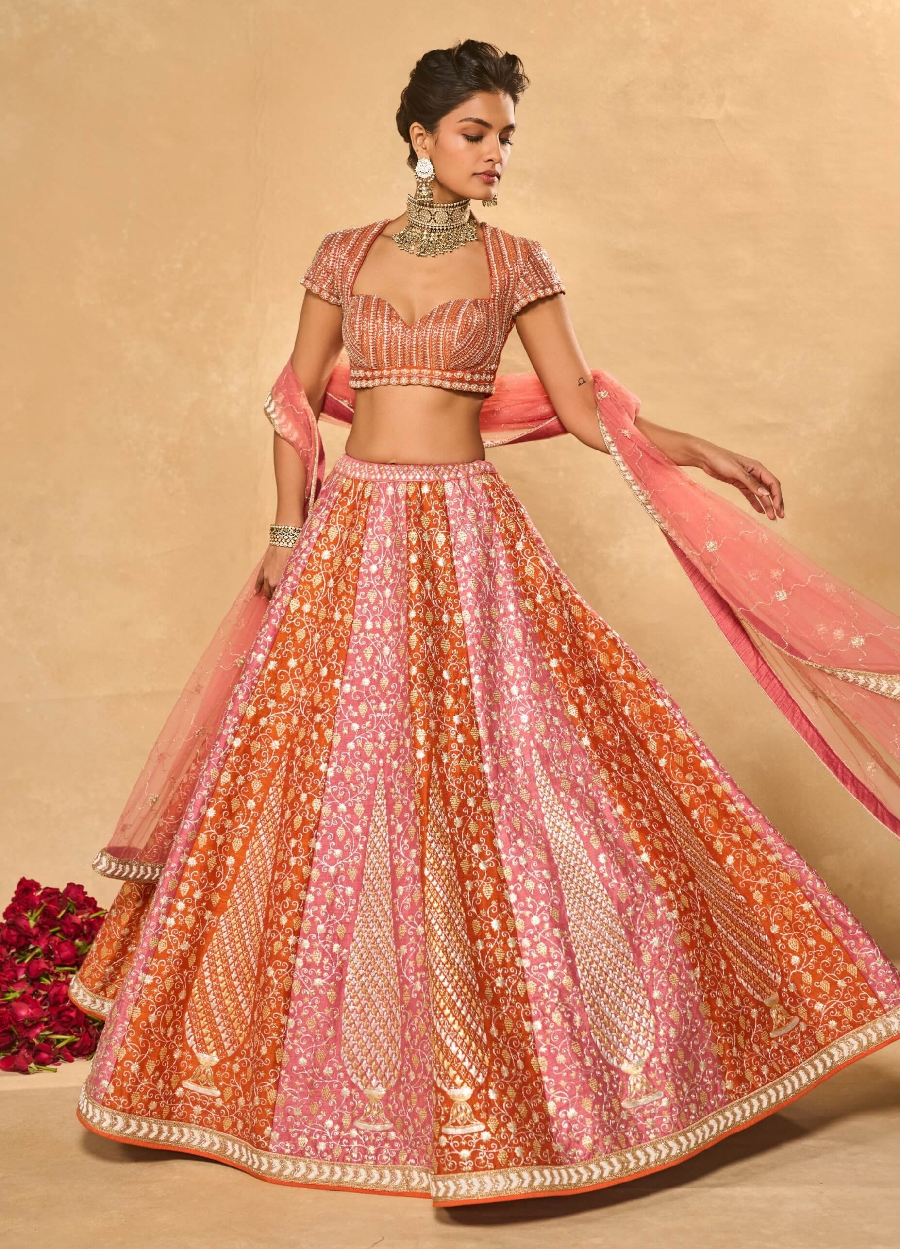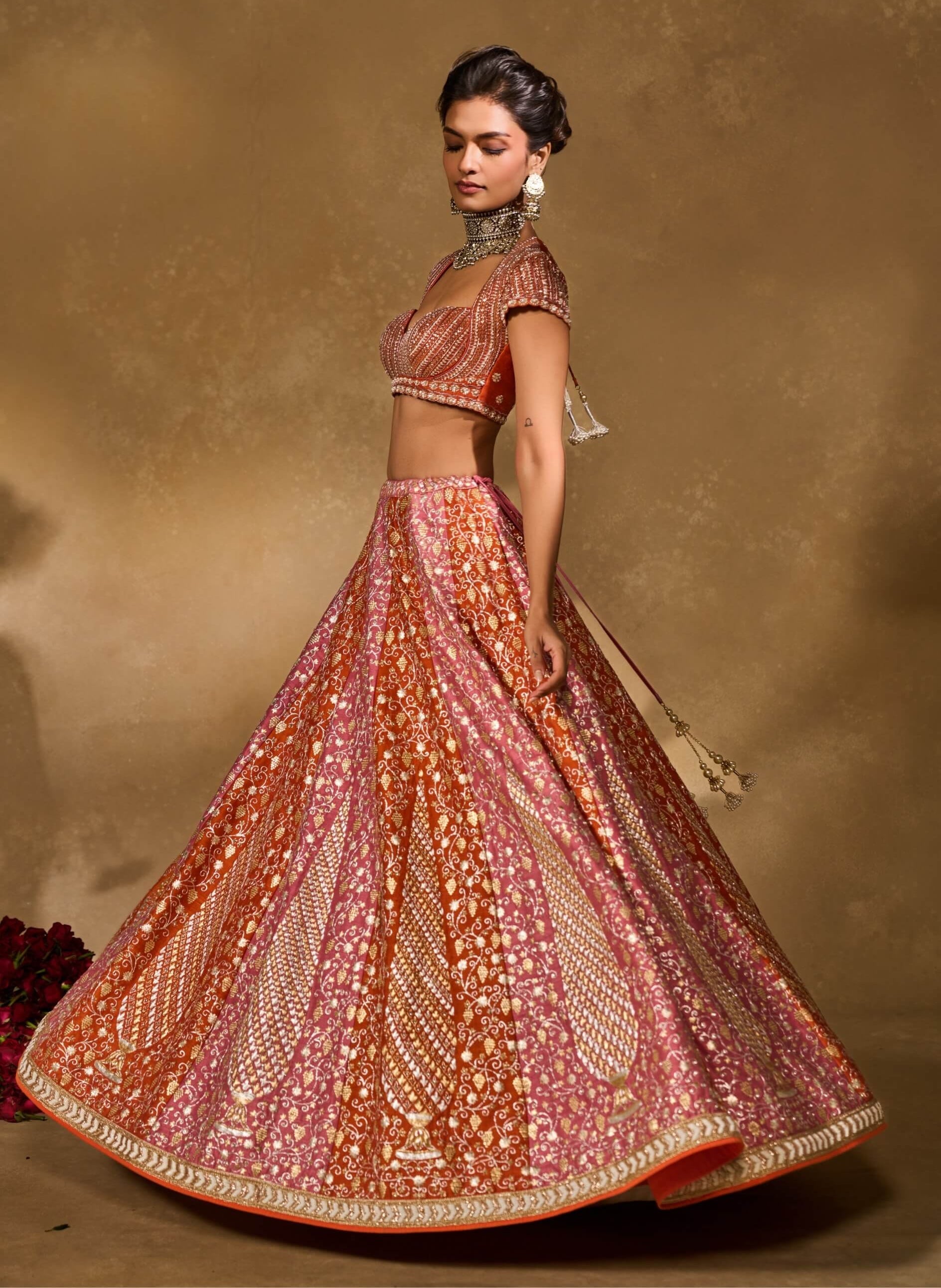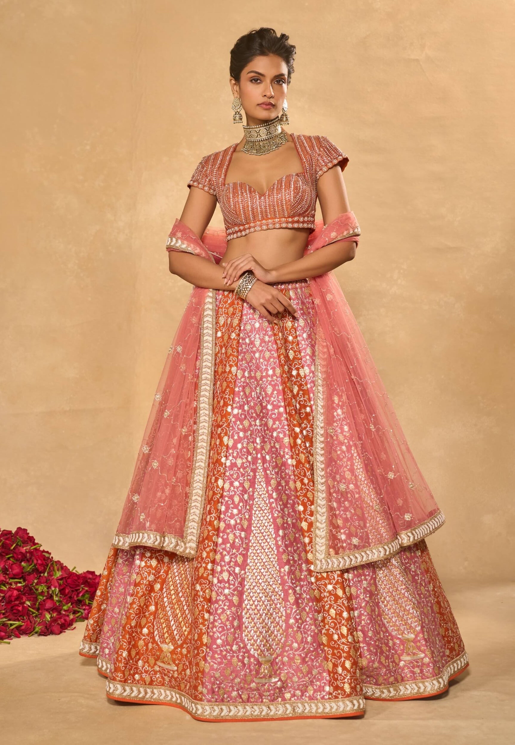 Richly embellished and vibrant, this mauve pink and orange lehenga is adorned with pita, glass beads, stones, pearls, zardozi, and zari. The sweetheart-neck blouse enhances the silhouette. A heavily encrusted tulle dupatta adds drama. Designed for bold festive dressing. Perfect for receptions and weddings.