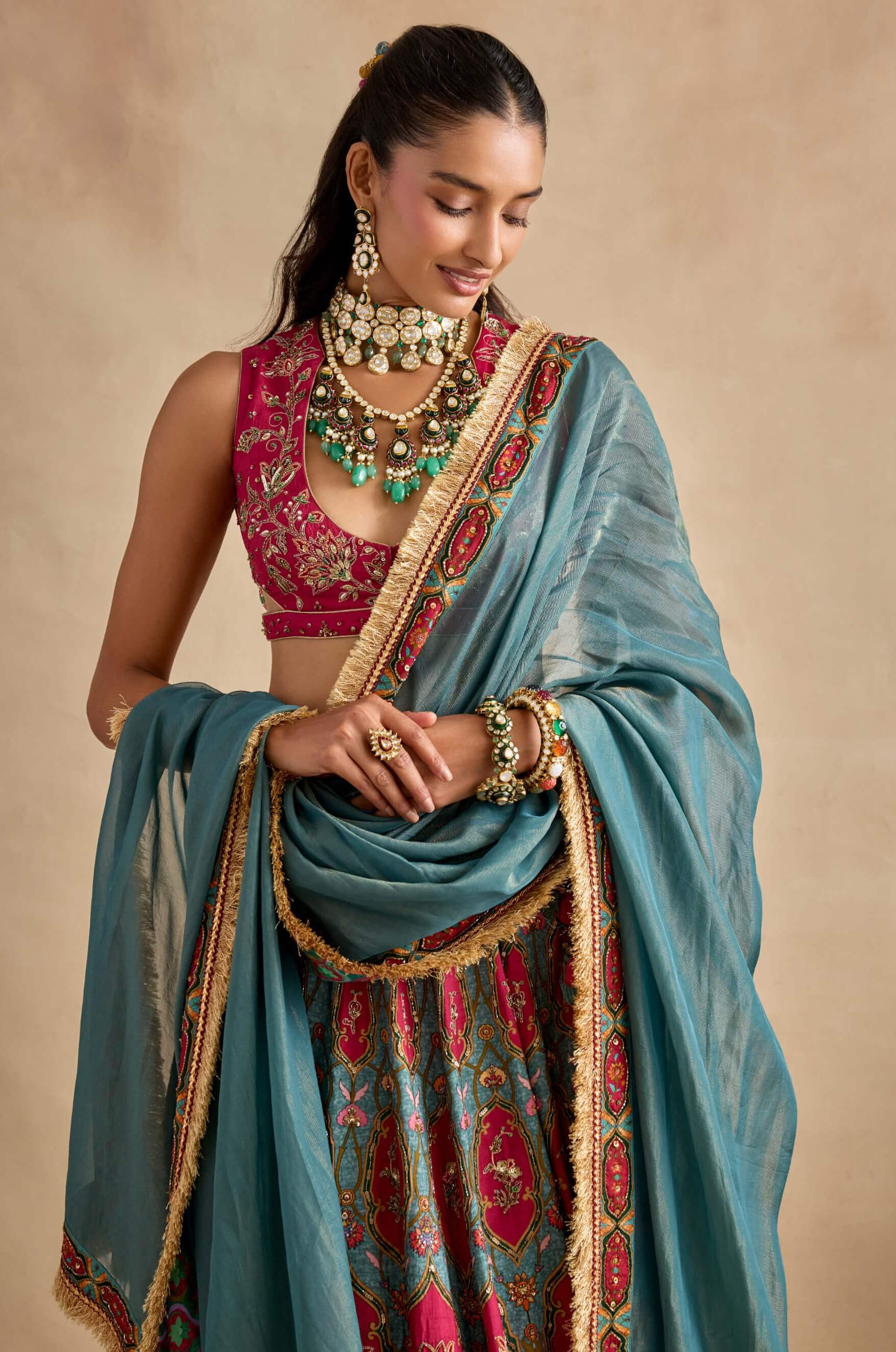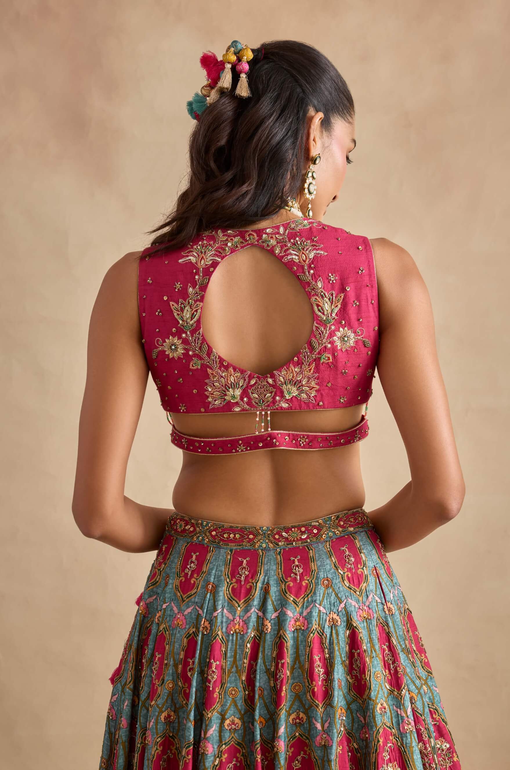 Rich in detail and colour, the shazia lehenga set features printed and embroidered silk with heavy tassel detailing, an intricately hand-embroidered blouse with front opening and keyhole design, paired with a contrasting tissue dupatta and ideal for festive weddings and sangeet nights.