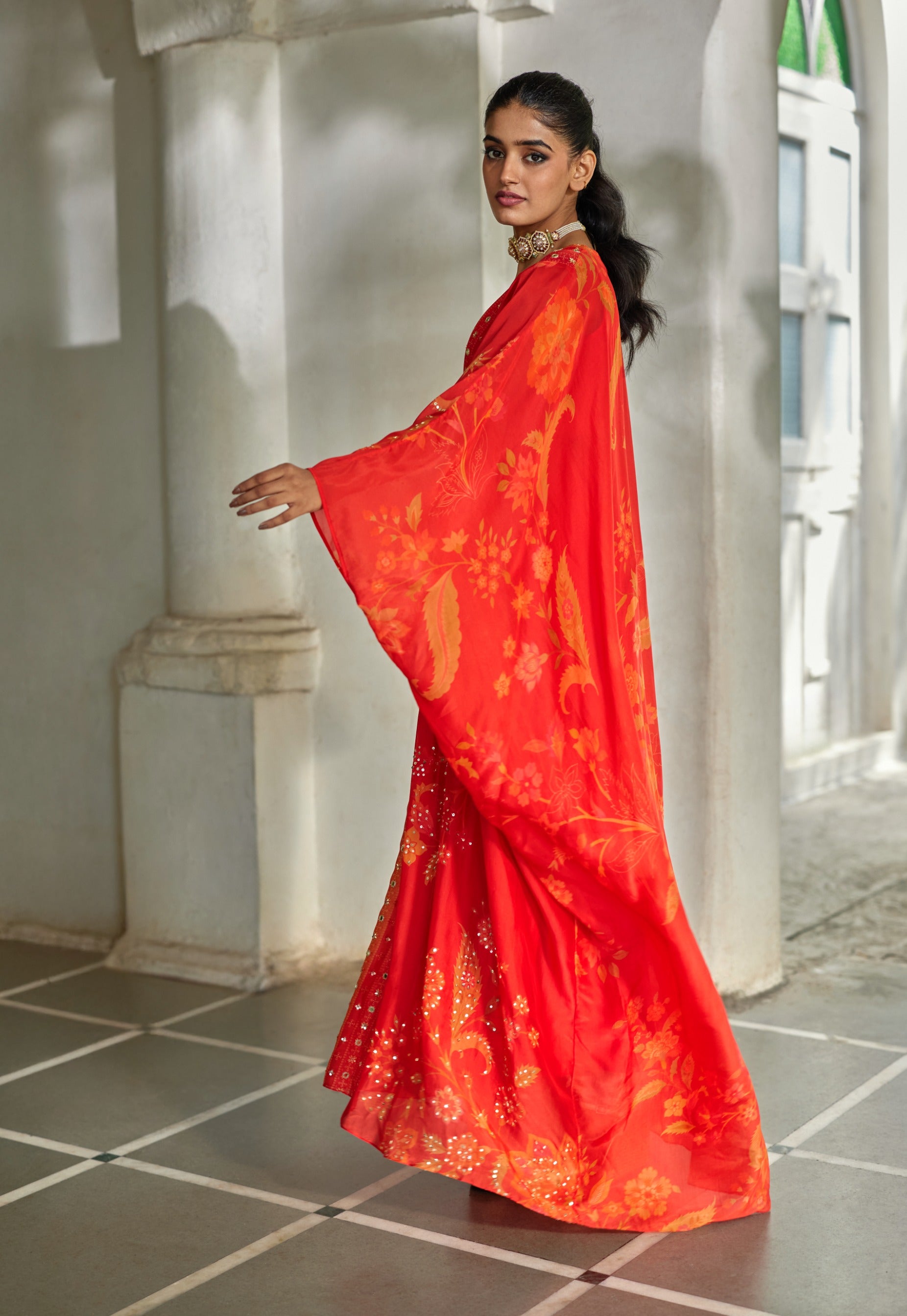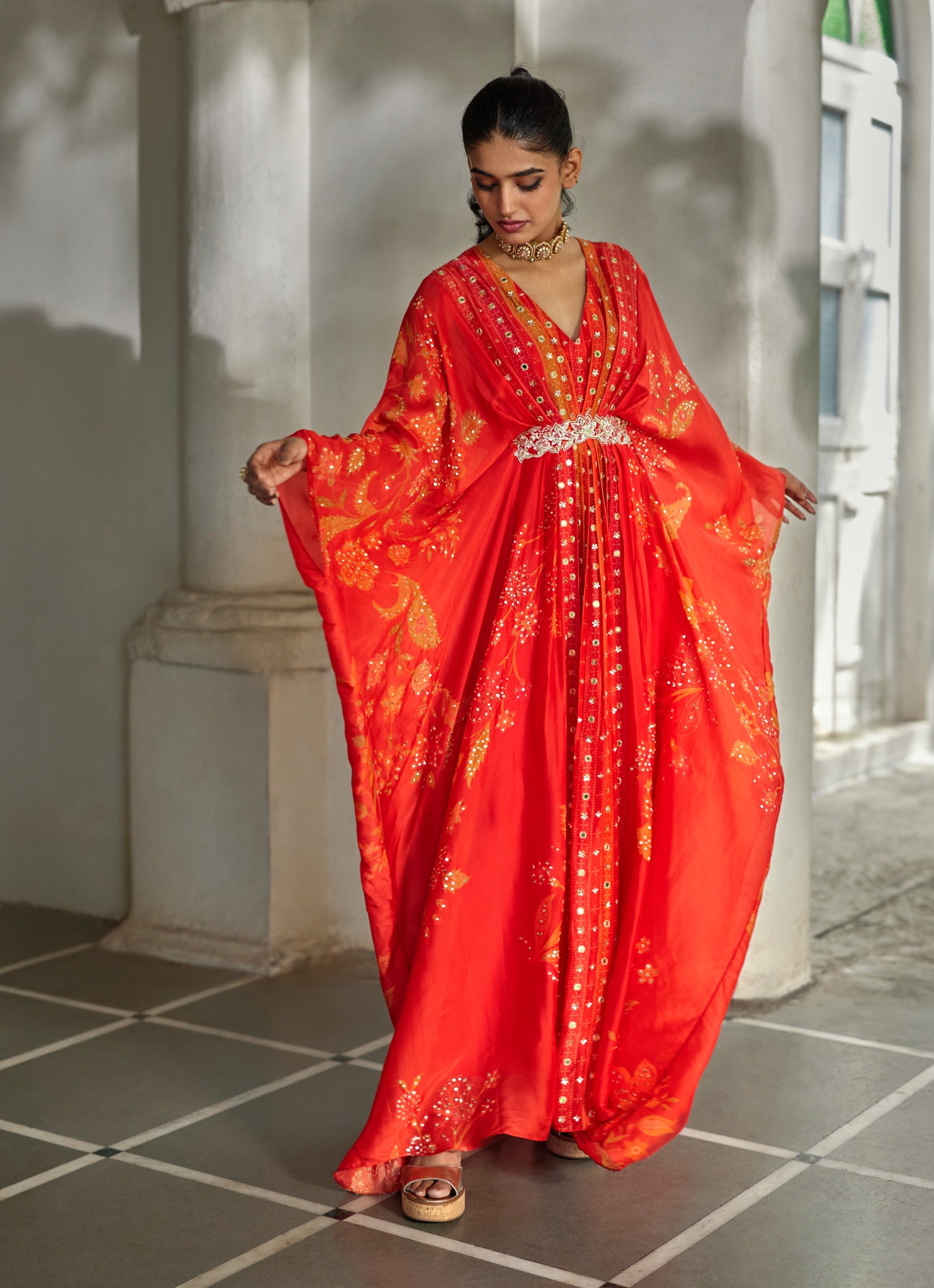 Our easy, breezy festive kaftan exudes a classic romantic charm. Crafted from silk organza with digitally printed multi-prints, it features blooming florals, colorful stripes, and delicate motifs. Accented with zari, floral sequins, and mirrors, it also includes an attached heavily embroidered patch for a luxurious, artisanal touch.