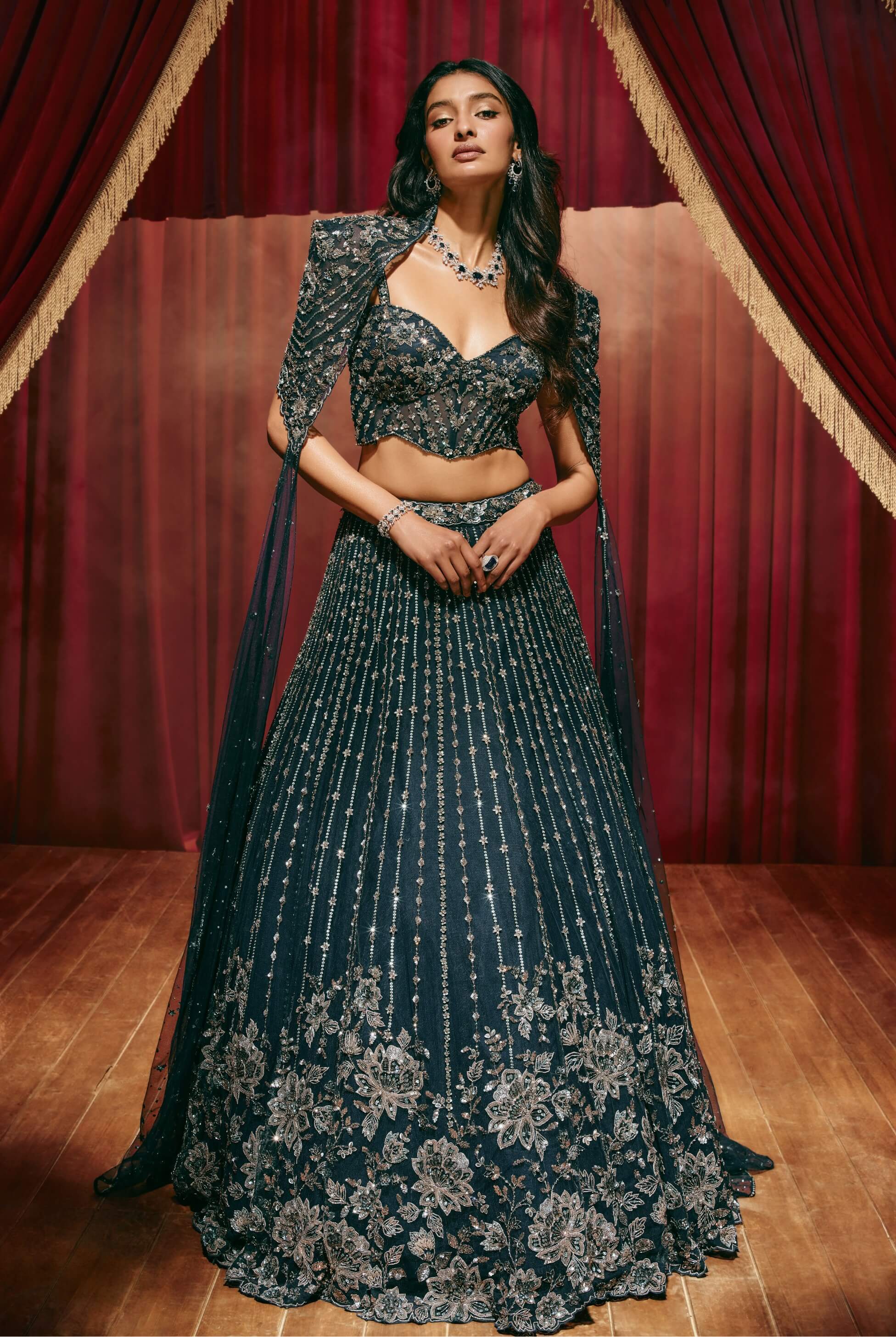 Embodying stylised luxury, this midnight blue lehenga set features an intricately embroidered bustier paired with a voluminous skirt highlighted by vertical sequin lines. The embellished shoulder cape introduces a modern edge while antique embroidery enriches the ensemble. Ideal for sangeet evenings, receptions, and grand festive occasions.
