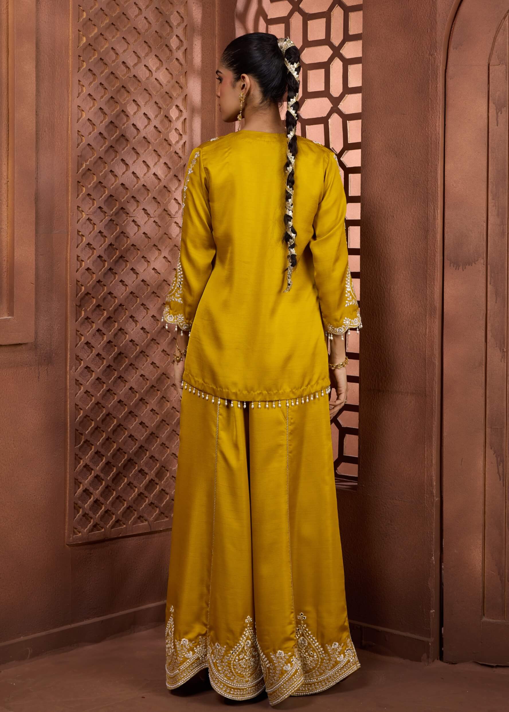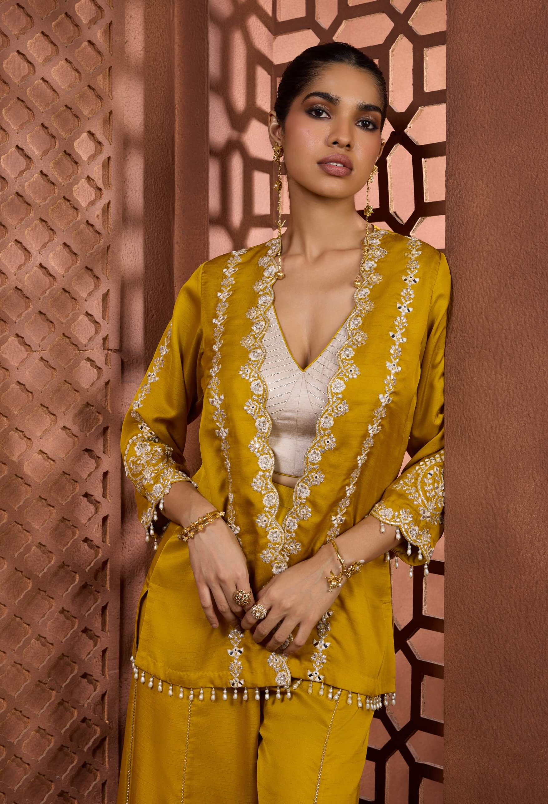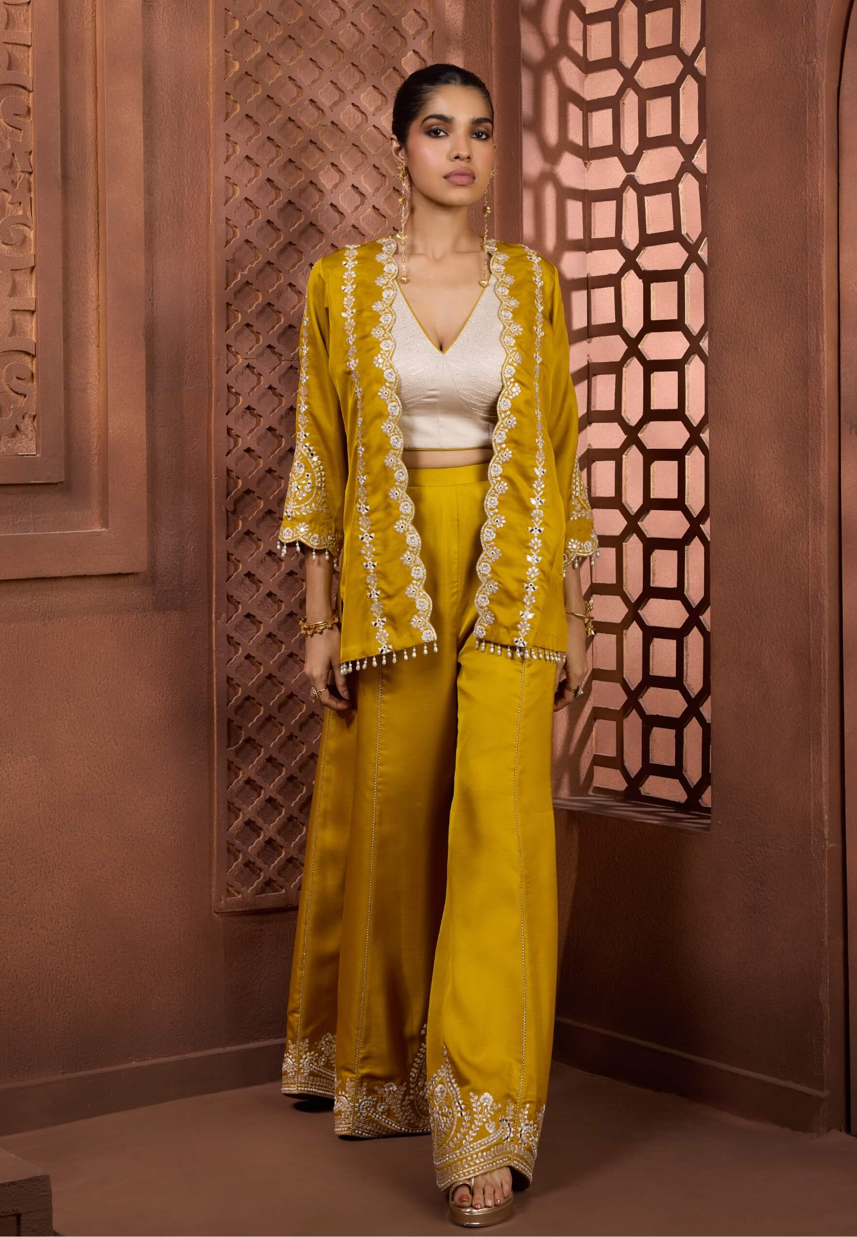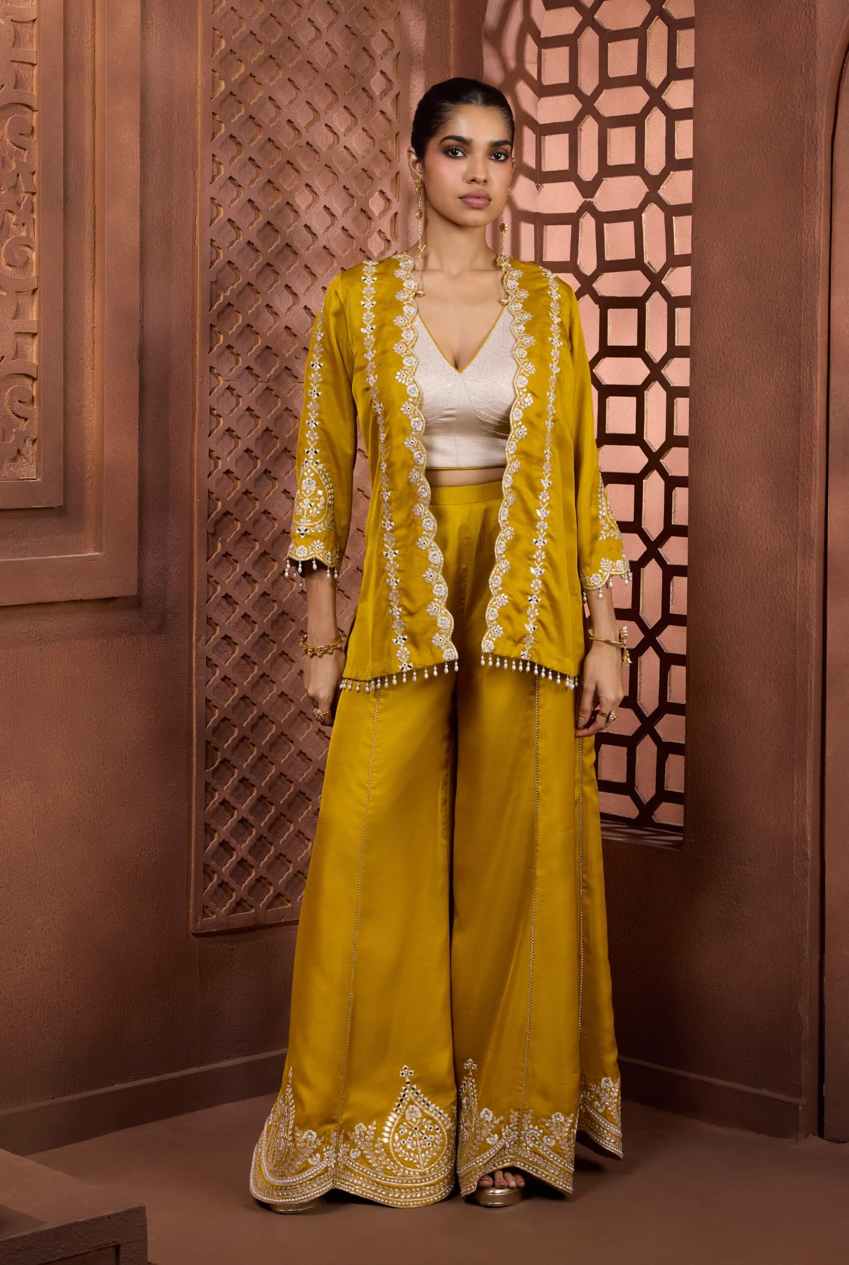 High-fashion festive drama defines the swarnima set in radiant mustard yellow. Featuring an ivory-toned crop top layered under an open-front jacket with white scalloped embroidery, paired with a dramatically flared sharara. Finished with architectural embroidered borders and pearl-tassel detailing, it delivers couture impact. Perfect for sangeets and wedding celebrations.