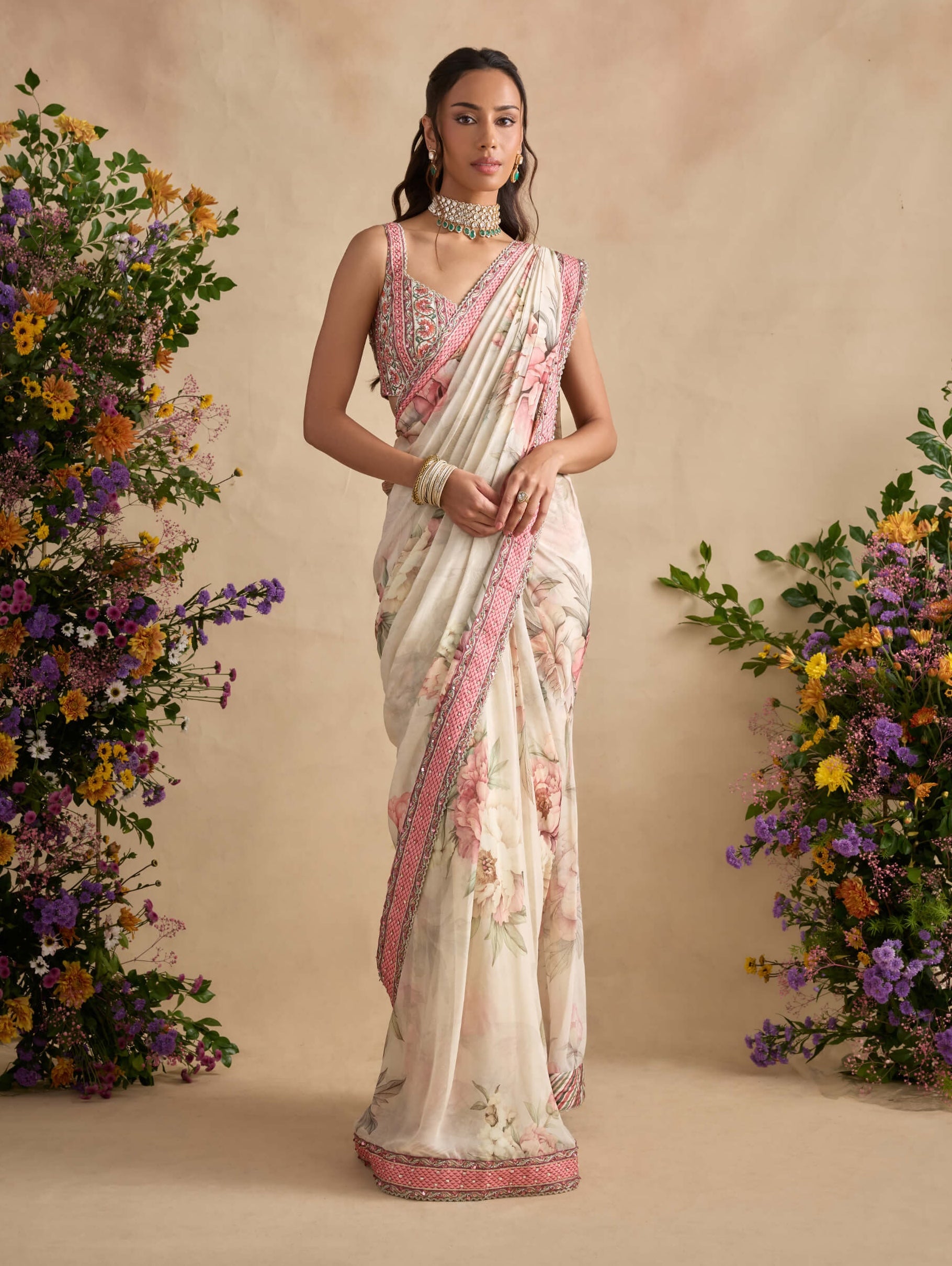 Soft romance meets vintage charm in this powder pink pre-draped sari ensemble featuring delicate floral motifs with meticulous hand embroidery on the blouse and border, finished with dori ties, handmade tassels and ghungroo accents, crafted in viscose and georgette and ideal for cocktail parties, engagement evenings and intimate celebrations.